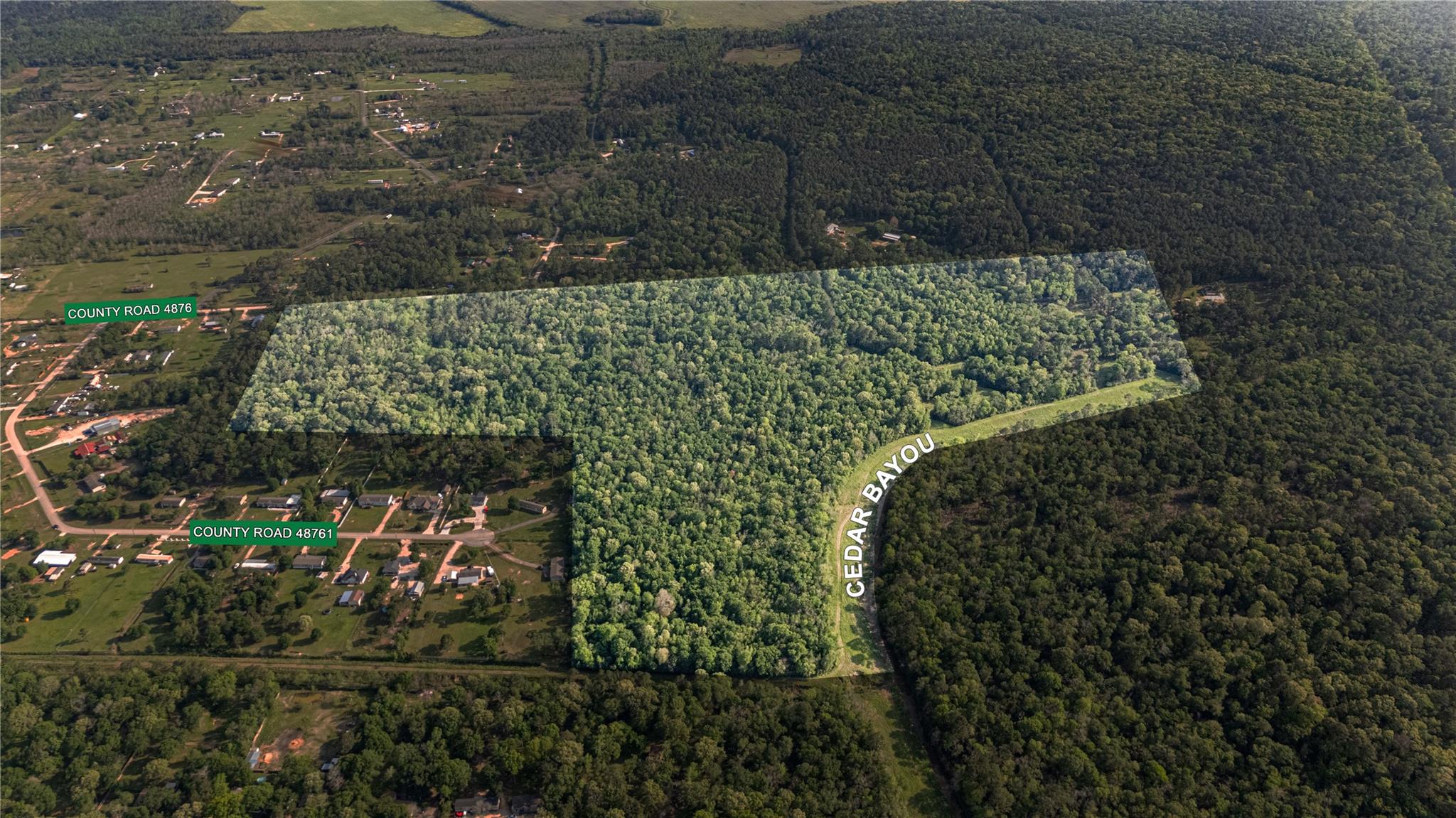 69.5 acres of Timberland with Ag Exemption. Located just SW of Dayton with 1855 ft Cedar Bayou frontage & 2900 ft road frontage on CR 4876 offers endless possibilities for development! Nestled in peaceful rural setting, property boasts easy access to Hwy 99 (Grand Parkway-2.5 miles away), Hwy 90 (3 miles away), and Hwy 146 (4 miles away) via FM 1413 & located 35 miles NE of Downtown Houston making it a convenient choice for those seeking space without sacrificing connectivity. Hwy 99 is Houston's Largest Loop & when completed it will be a 4-Lane Hwy 180 miles long connecting 7 counties. This property is ready to bring your vision to life whether it be a private estate, residential community, or industrial venture. It is in a desirable location offering limitless potential. While buyers have expressed interest in purchasing smaller parcels, the seller is offering the full 69.5 acres as a single sale, presenting a rare opportunity for large-scale development.