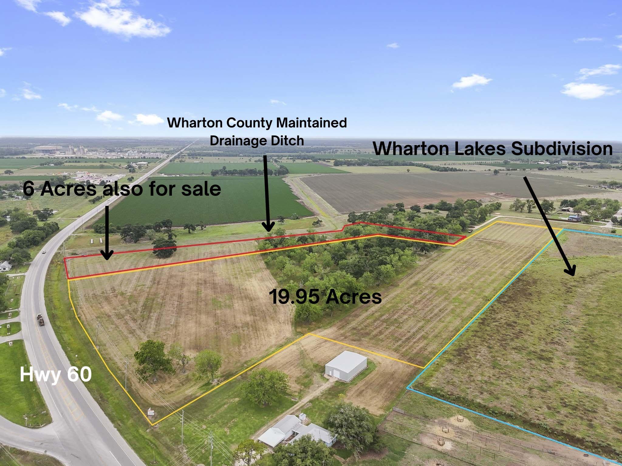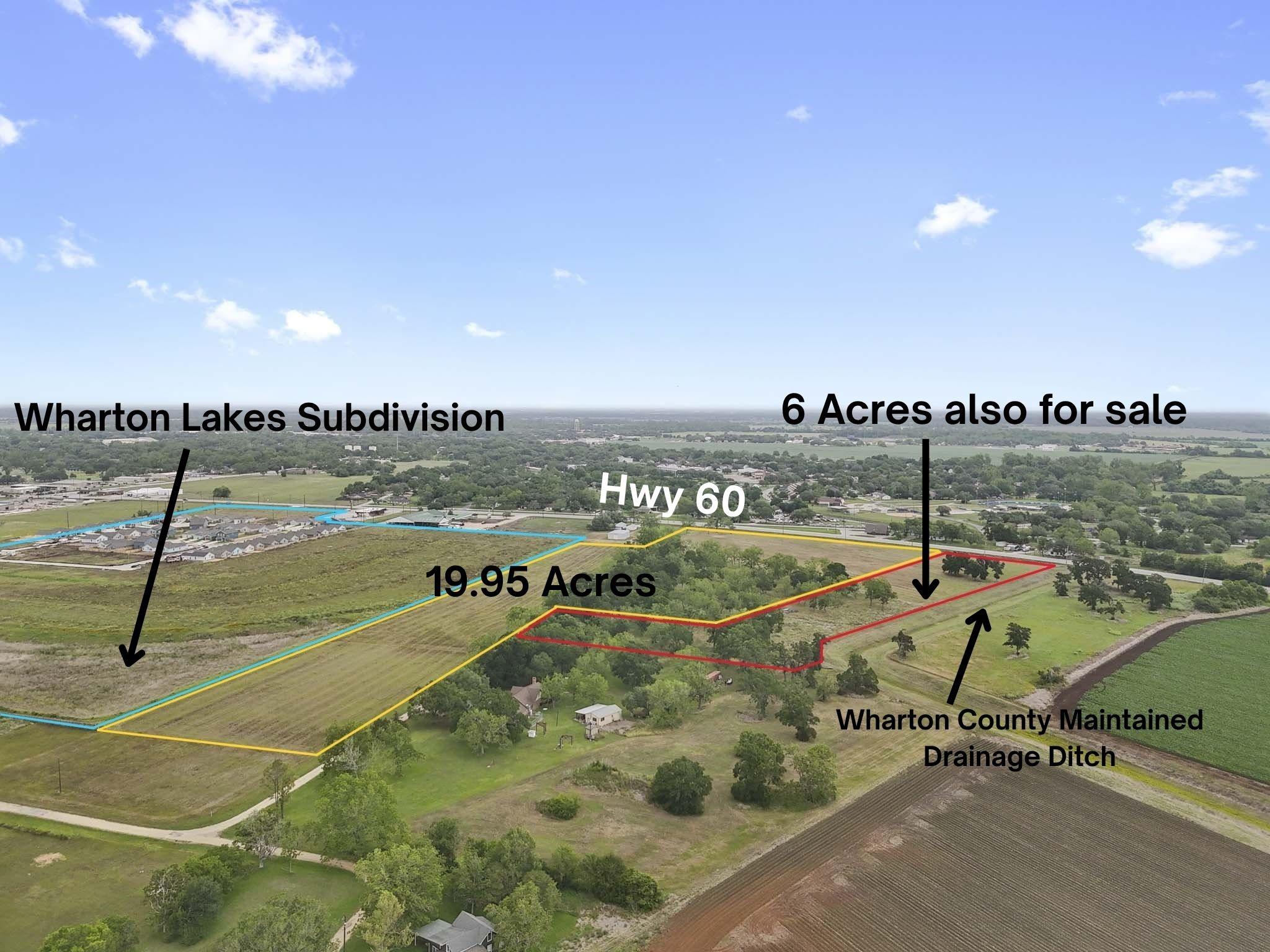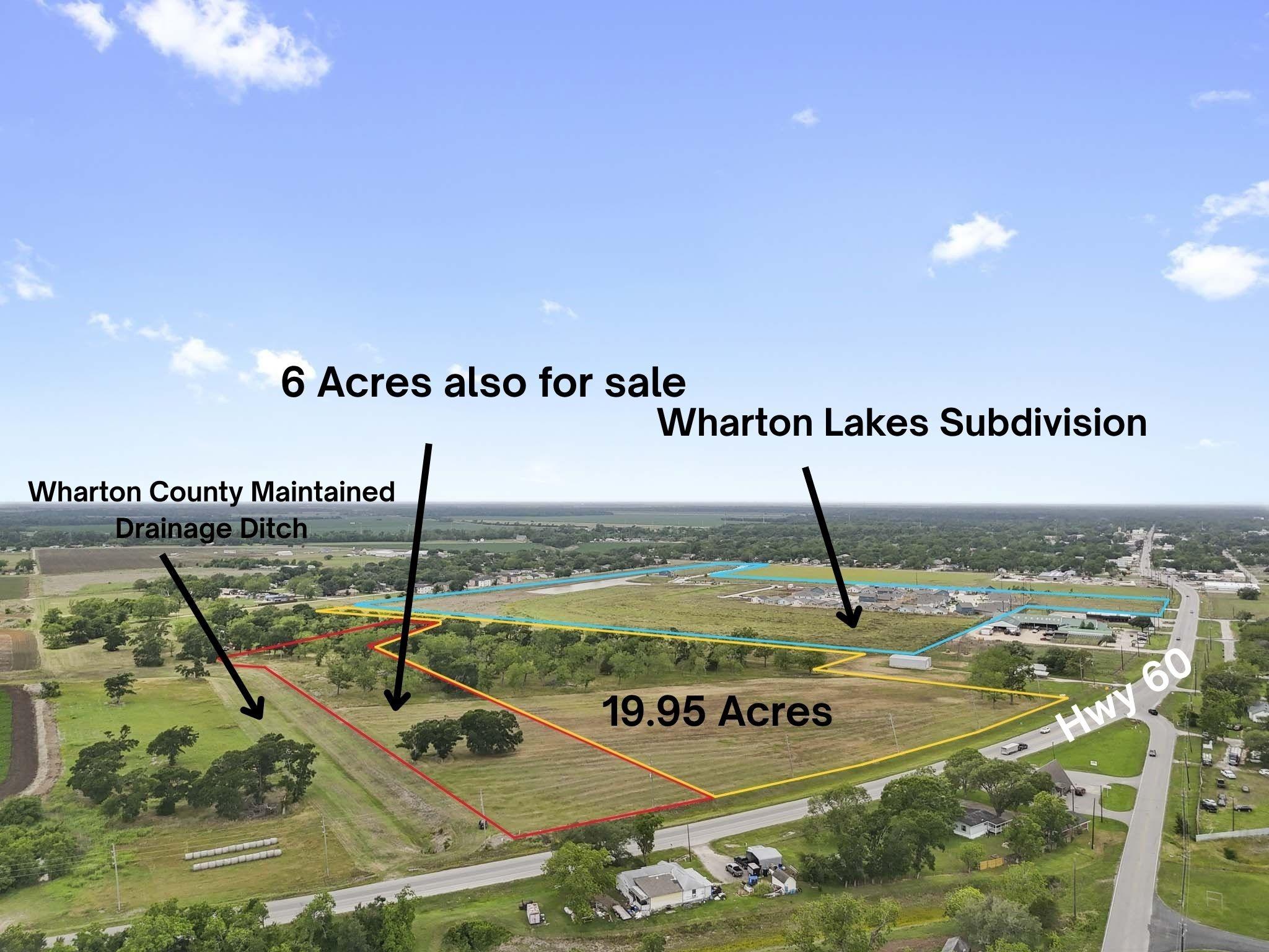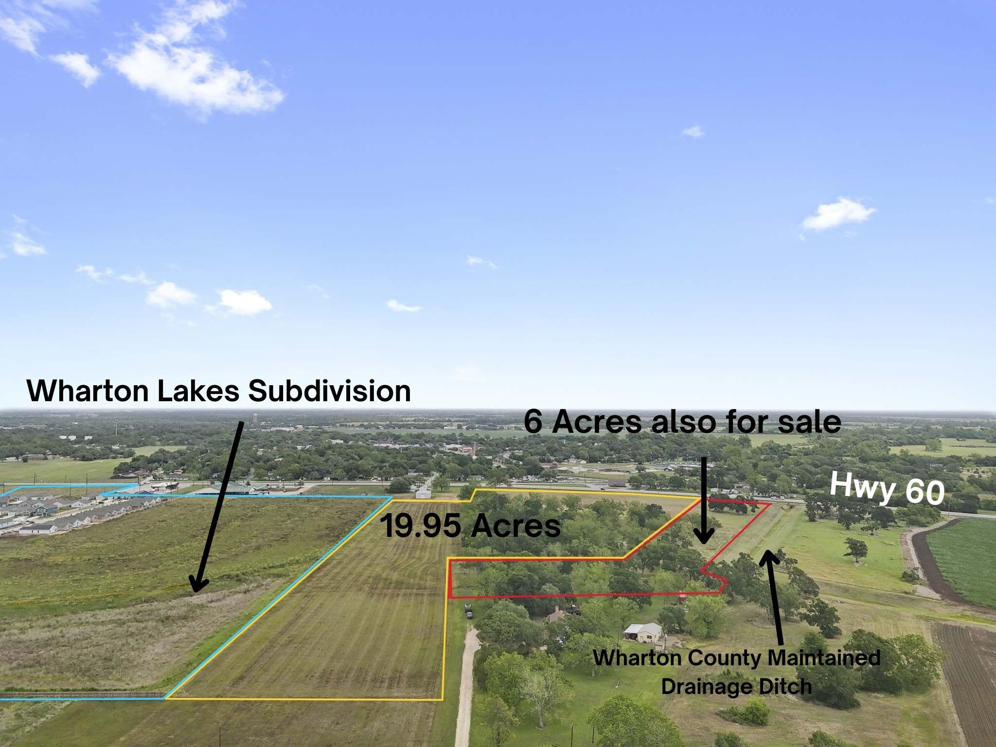 This 19.95 +/- acre tract primed for residential development is within the City of Wharton ETJ and is adjacent to the new 220 lot Wharton Lakes subdivision that is currently being developed. The Wharton Lakes subdivision site map (see photos) reflects a "stub out" dedicated easement along Wharton Lakes southeast boundary allowing city utilities (water & sewer) into the property. The county maintained Santa Fe drainage ditch is 150 +/- feet away from the southeastern boundary. This tract is 19.95 acres to be divided out of the 21.7679 acres identified in Wharton County Central Appraisal District property ID # 71617. The seller has NOT legally divided any of the original 21.7679 acres and will consider dividing the property differently than is currently being proposed. Don't miss all this great property has to offer!