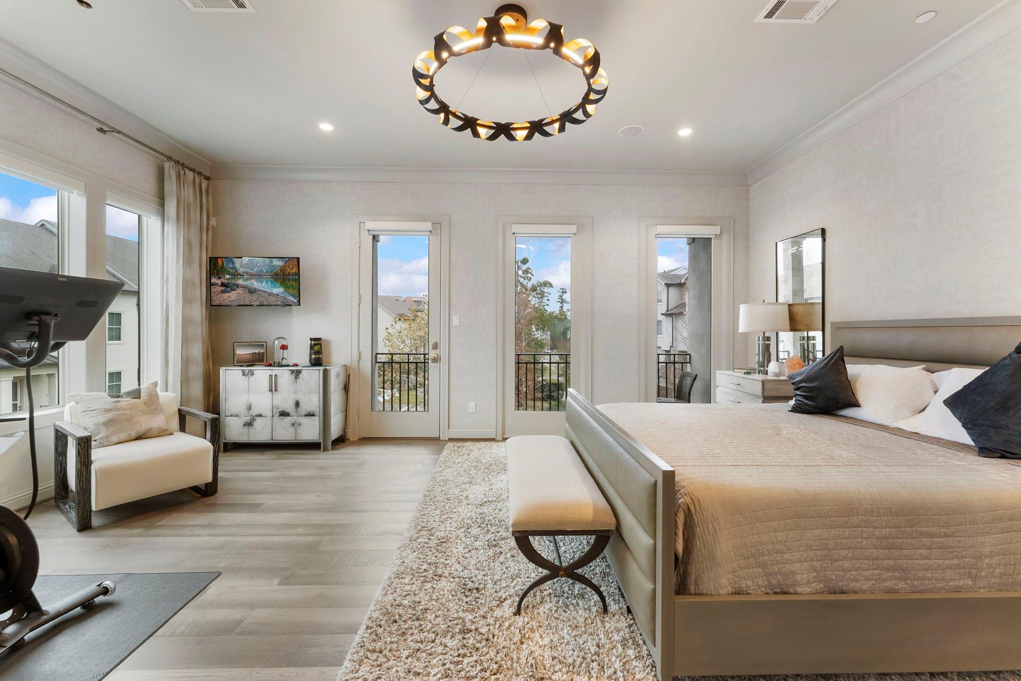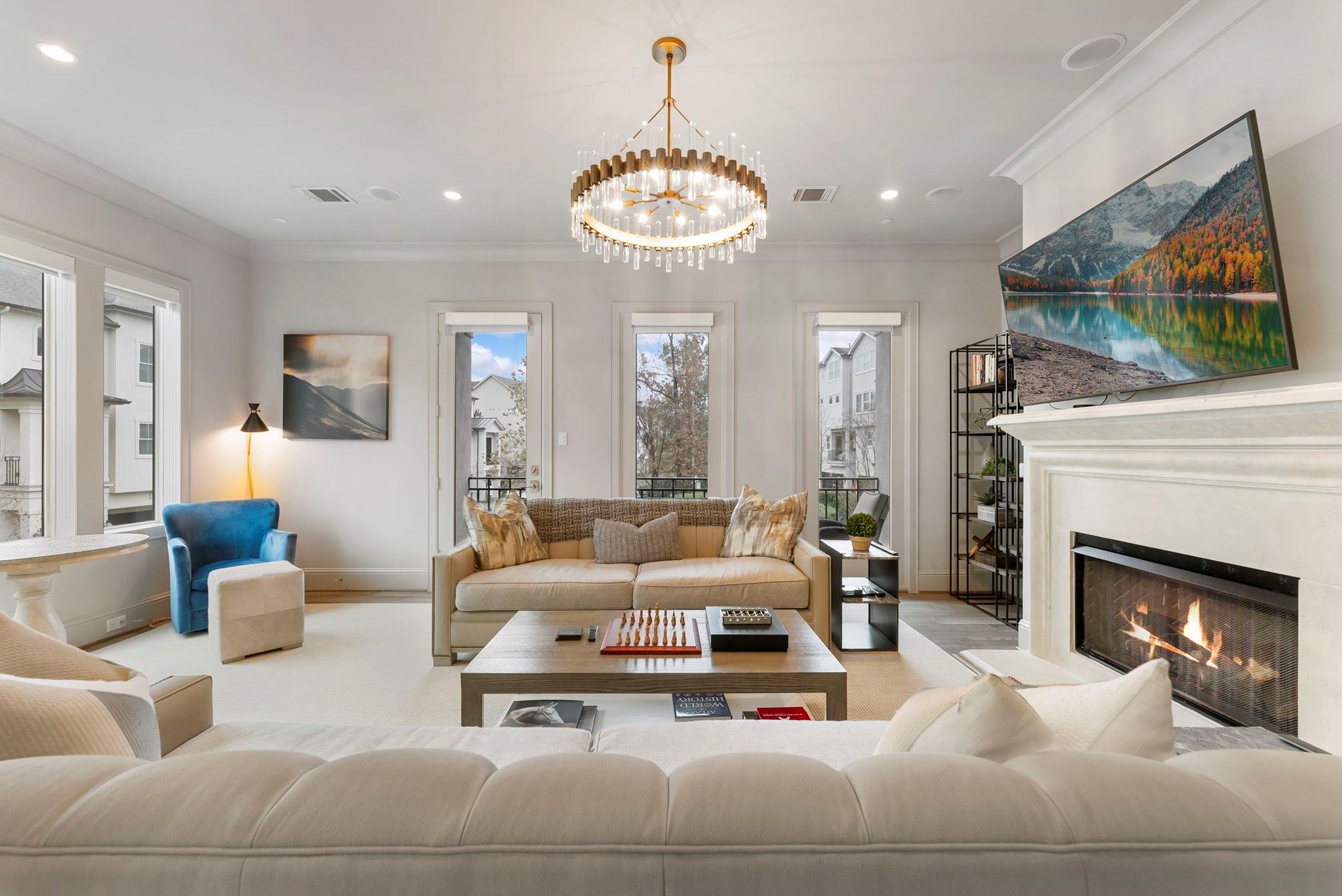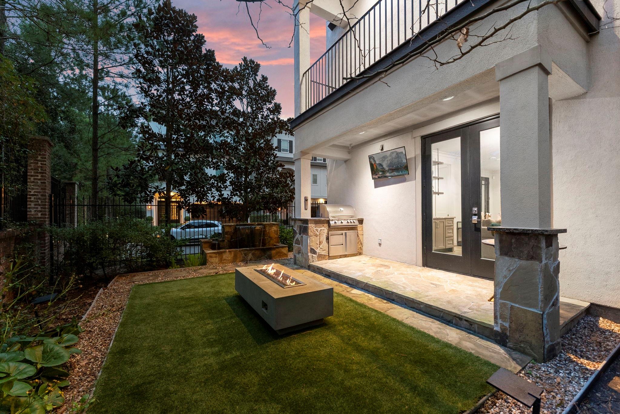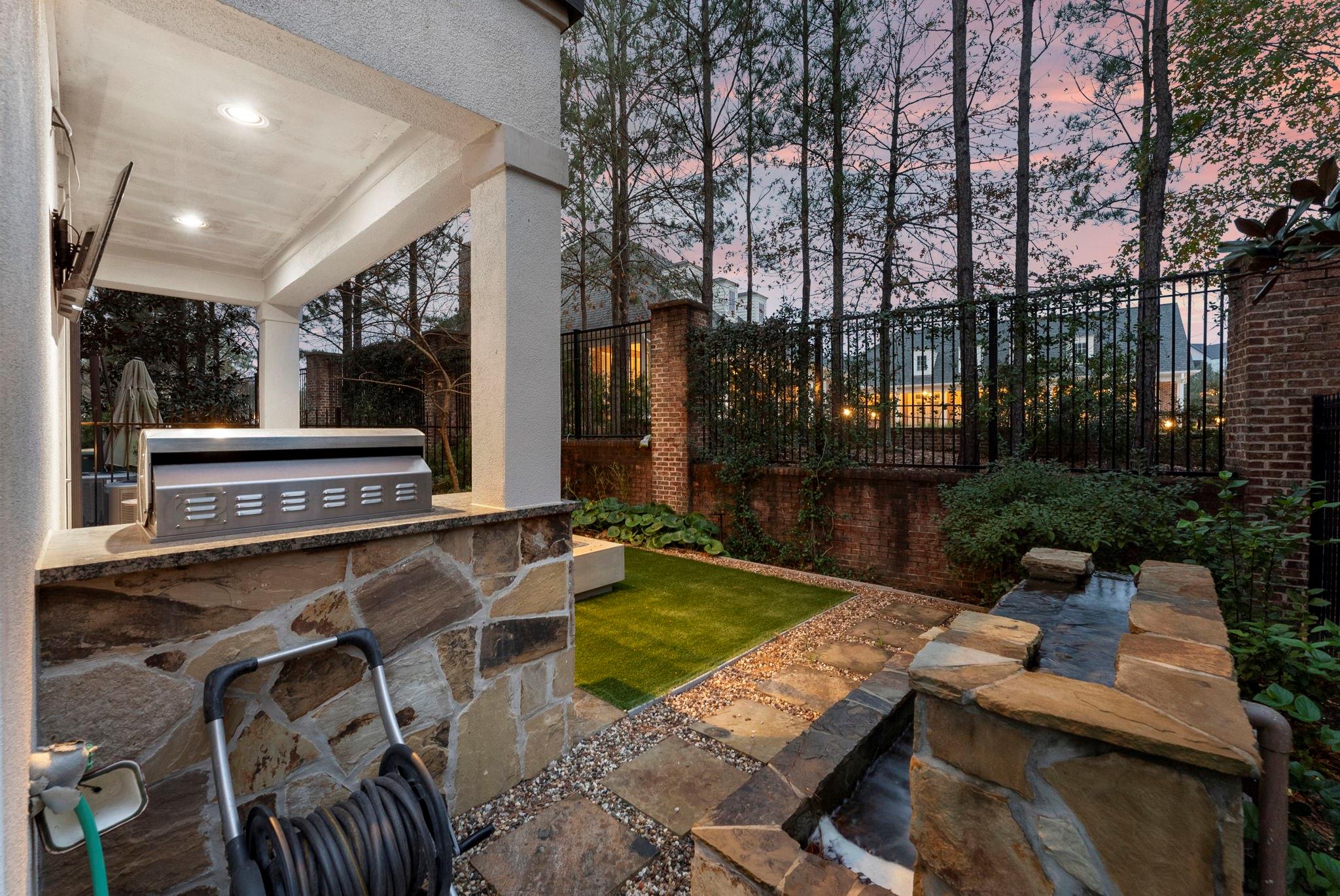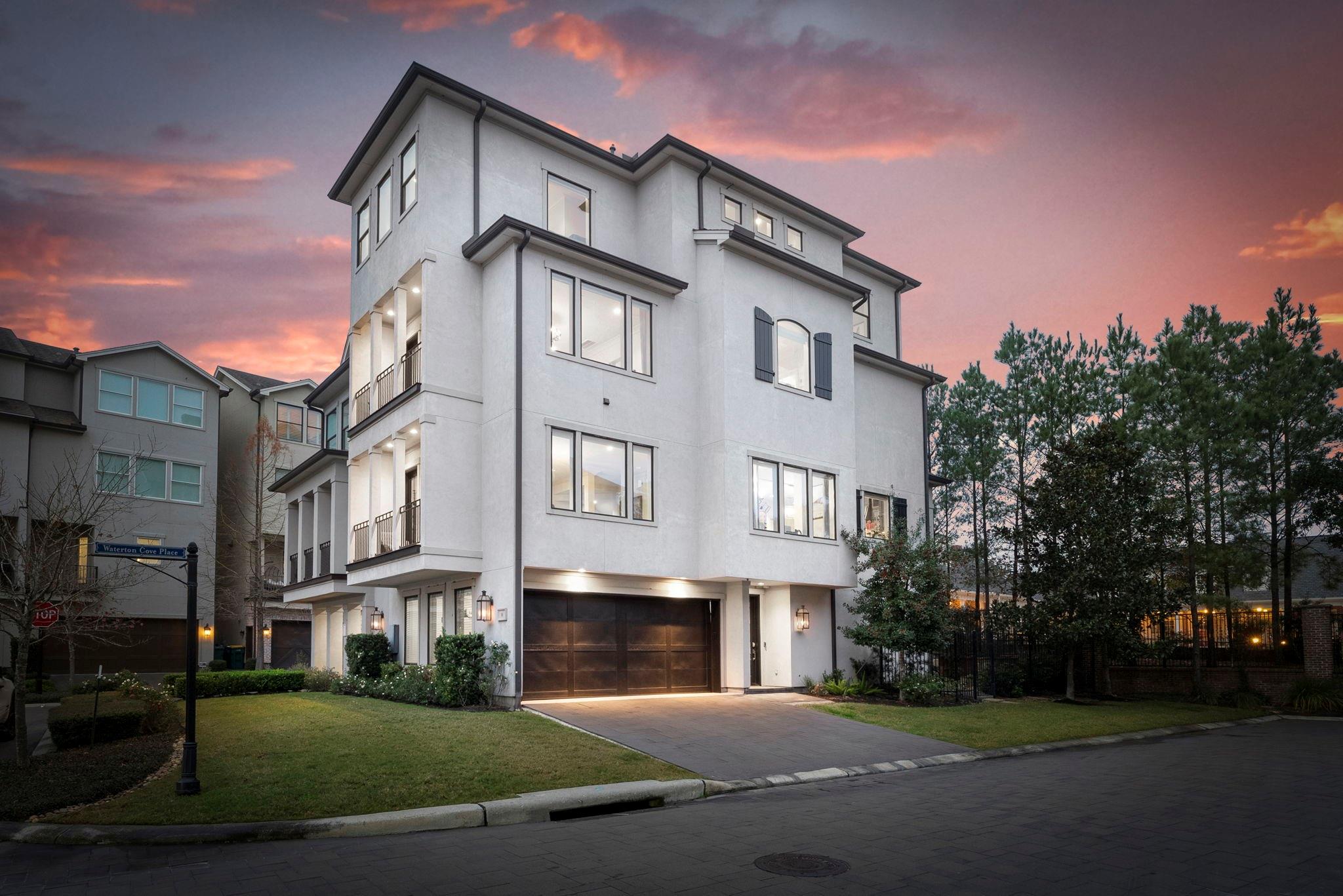 Prestigious gated Waterway Landing in East Shore: corner-lot 4-story luxury townhome steps to Market Street and fine dining. No rear neighbors; private fenced yard; full two-car driveway; elevator for easy access.1st-floor flex room with full bath opens to backyard with outdoor kitchen, turf grass, water feature & gas firepit. 2nd-floor offers walls of windows, kitchen/living: custom kitchen, oversized island, Thermador range, designer lighting, built-in wine bar; formal dining + living with gas-log fireplace and private balcony overlooking wooded island. 3rd-floor primary suite with private balcony; marble spa bath w/soaking tub & shower, custom walk-in closet; utility room on 3rd. 4th floor: two spacious guest retreats. Hardwoods and custom finishes throughout. An exclusive opportunity in one of East Shore’s most sought-after gated communities, offering luxury, privacy, and unbeatable access to the best of Town Center. Must see, won't last.