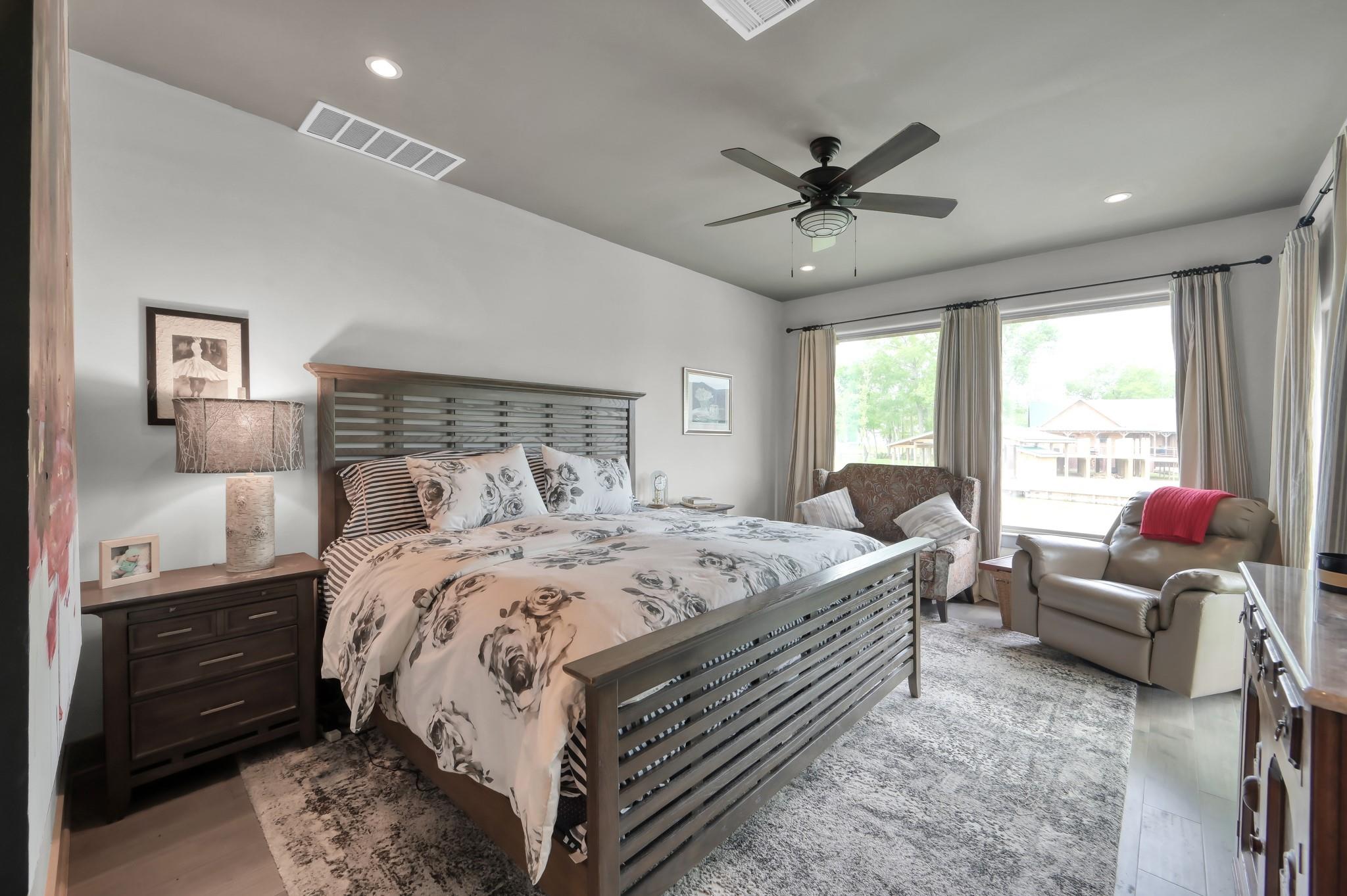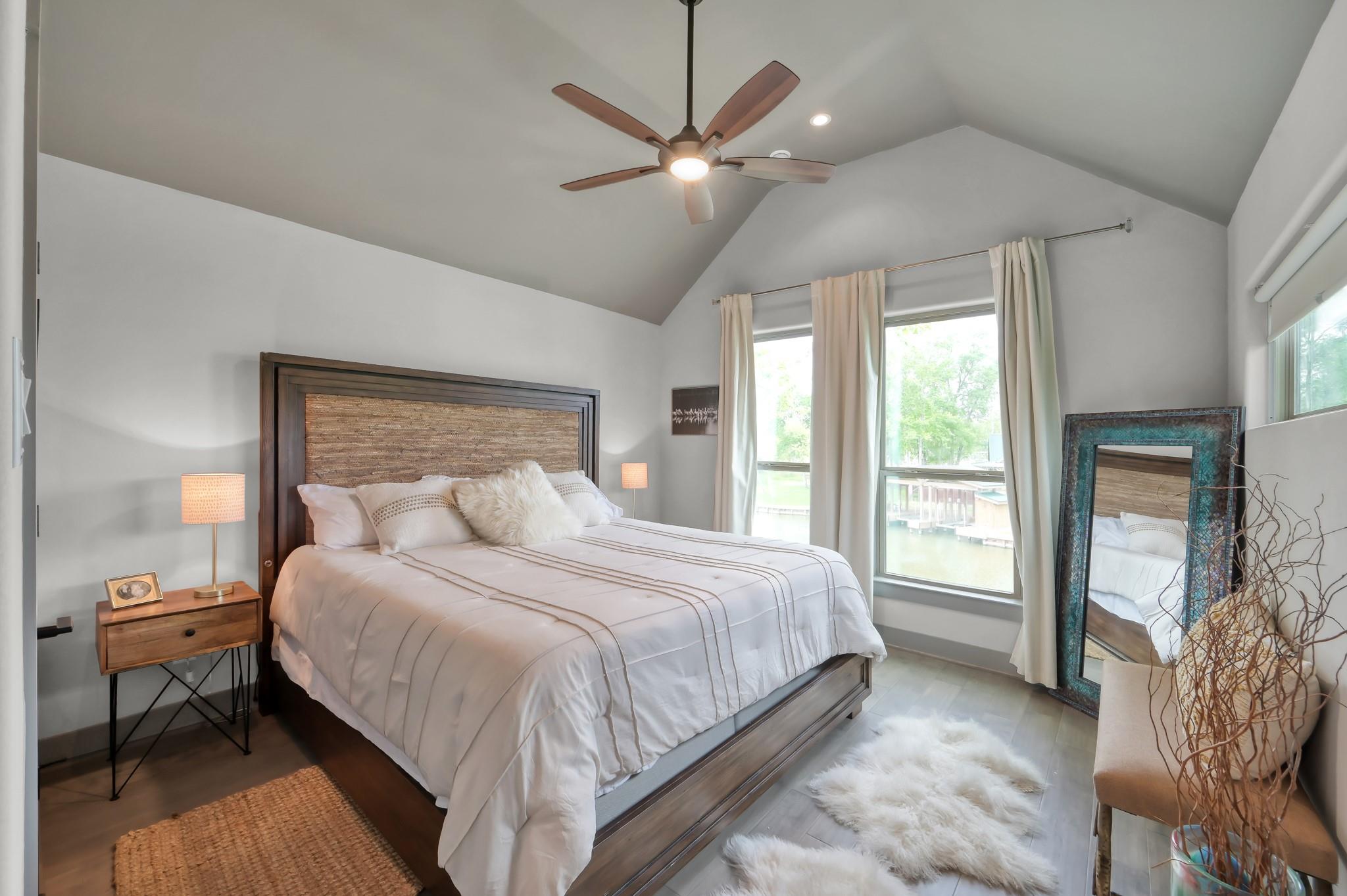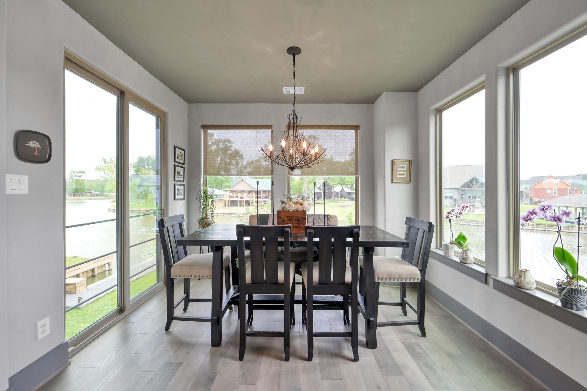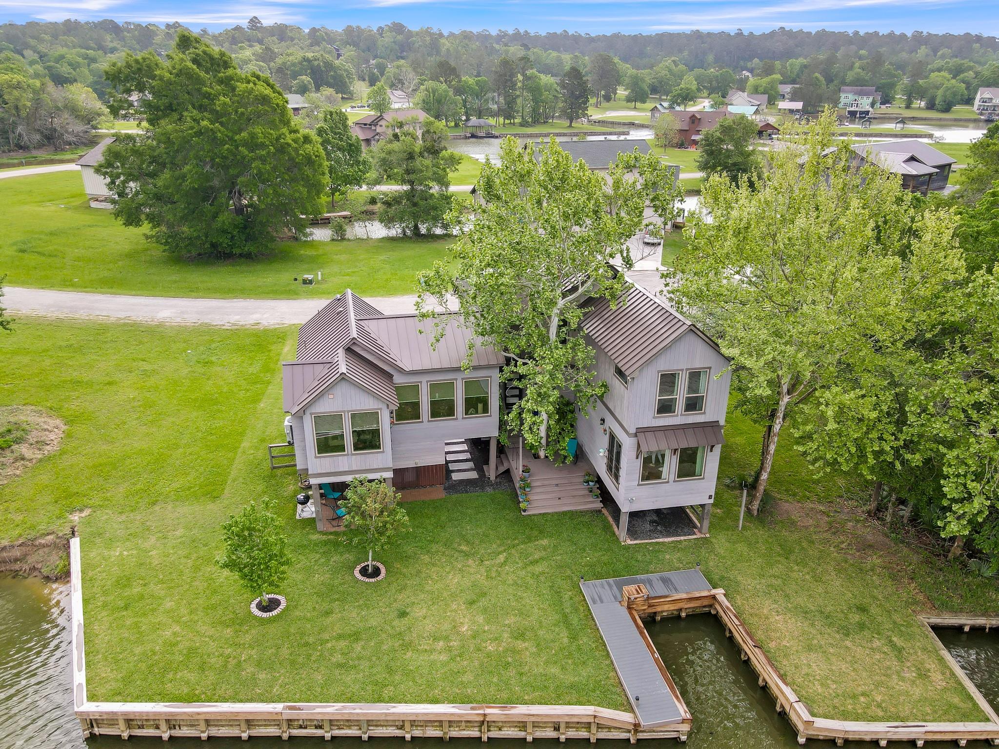 Architect-designed lakefront retreat in prestigious Wildwood Shores, Huntsville, set on the tranquil north end of Lake Conroe within Sam Houston National Forest. Private waterfront sanctuary surrounded by towering trees, protected forest land, and abundant wildlife. 1,926 SF split-level home blending modern sophistication with warm, mountain-inspired design. Open-concept living with vaulted beam ceilings and walls of glass capturing sweeping lake and forest views. Kitchen features granite countertops, natural wood-planked walls, large windows, and walk-in pantry with antique etched-glass door. Sculptural floating hickory staircase with cable railing leads to upper guest rooms with Jack-and-Jill bath. Private lower-level primary suite w/walk-in closet and full bath. Outdoor living includes private boat slip and lift, fishing-friendly bulkhead, and elevated deck for entertaining or sunset views. Gated community offers pools, tennis courts, boat launches, and resort-style setting.