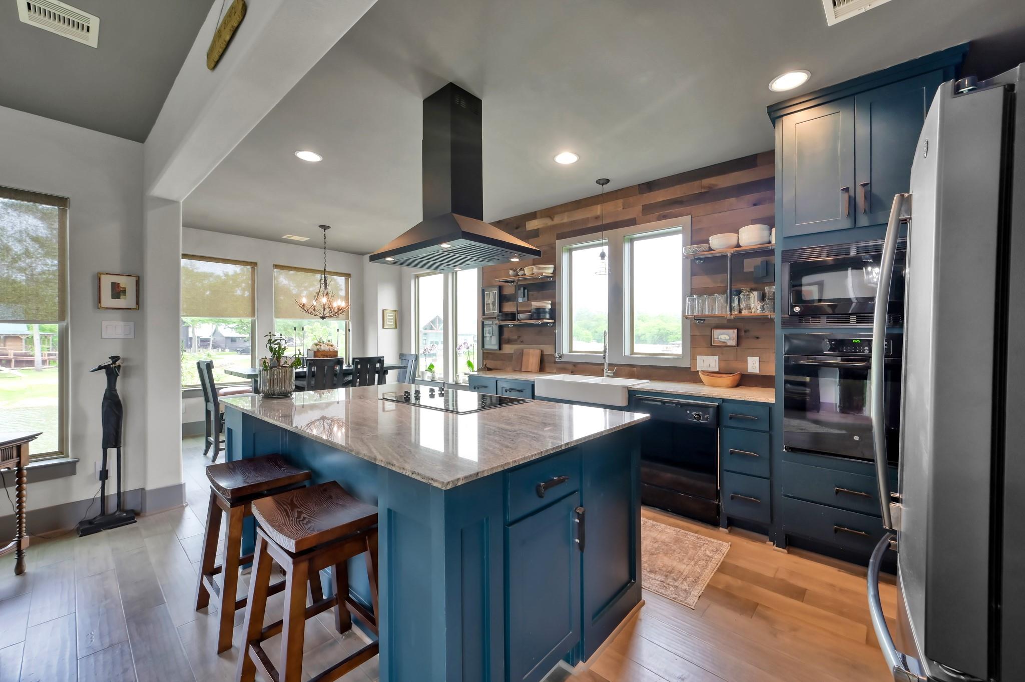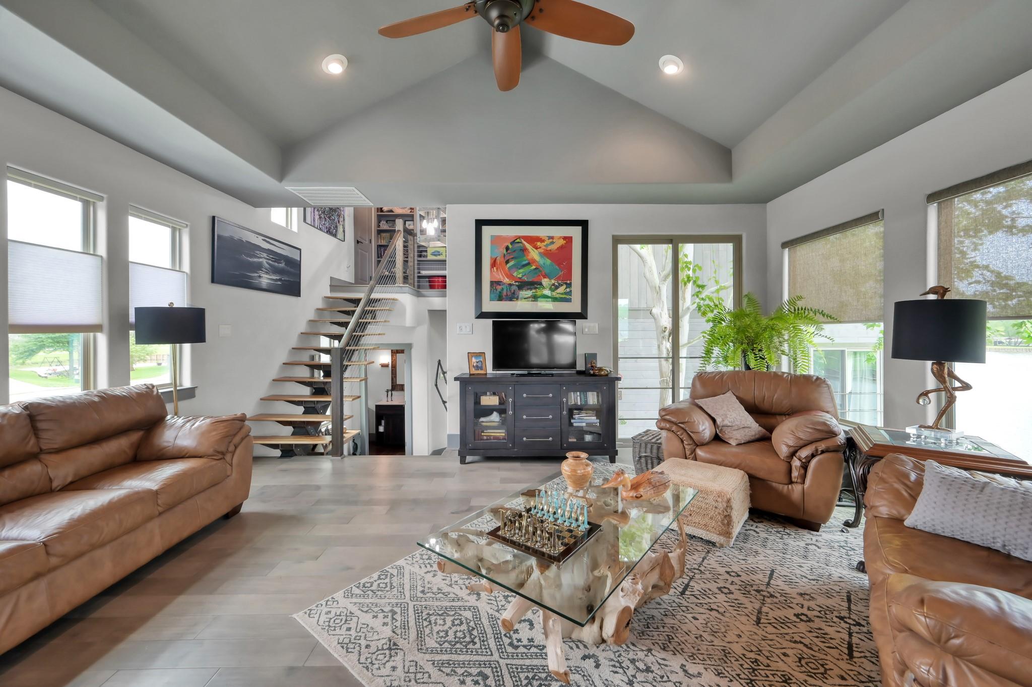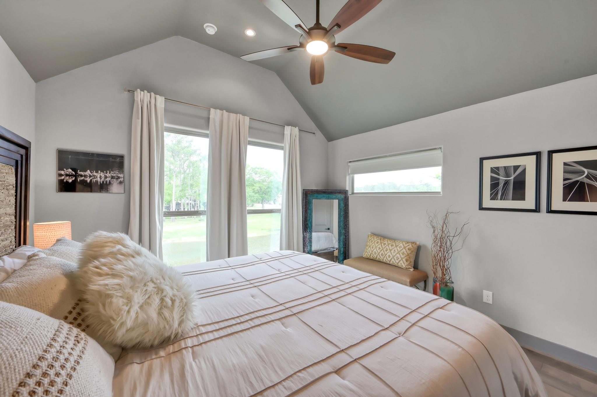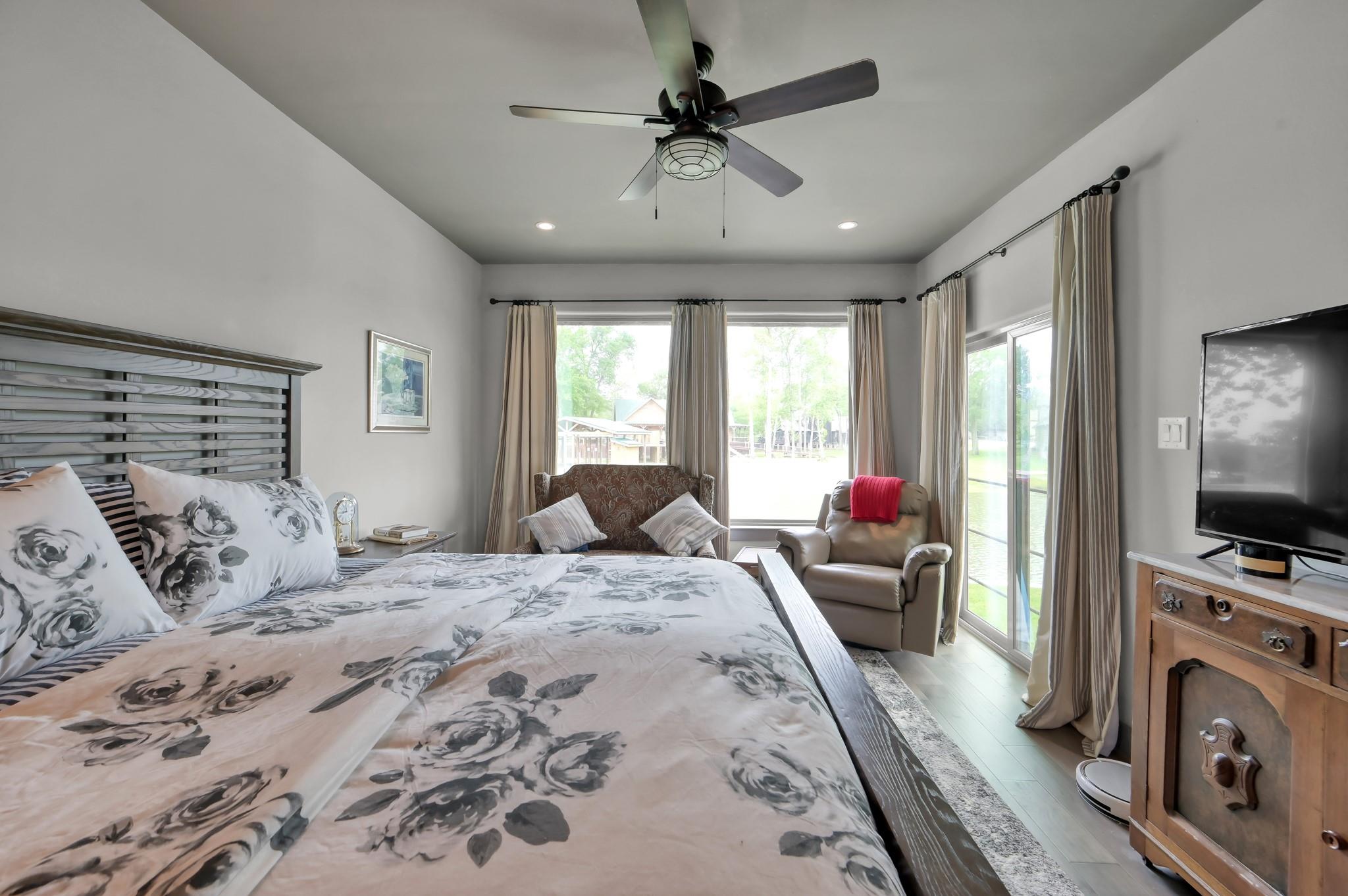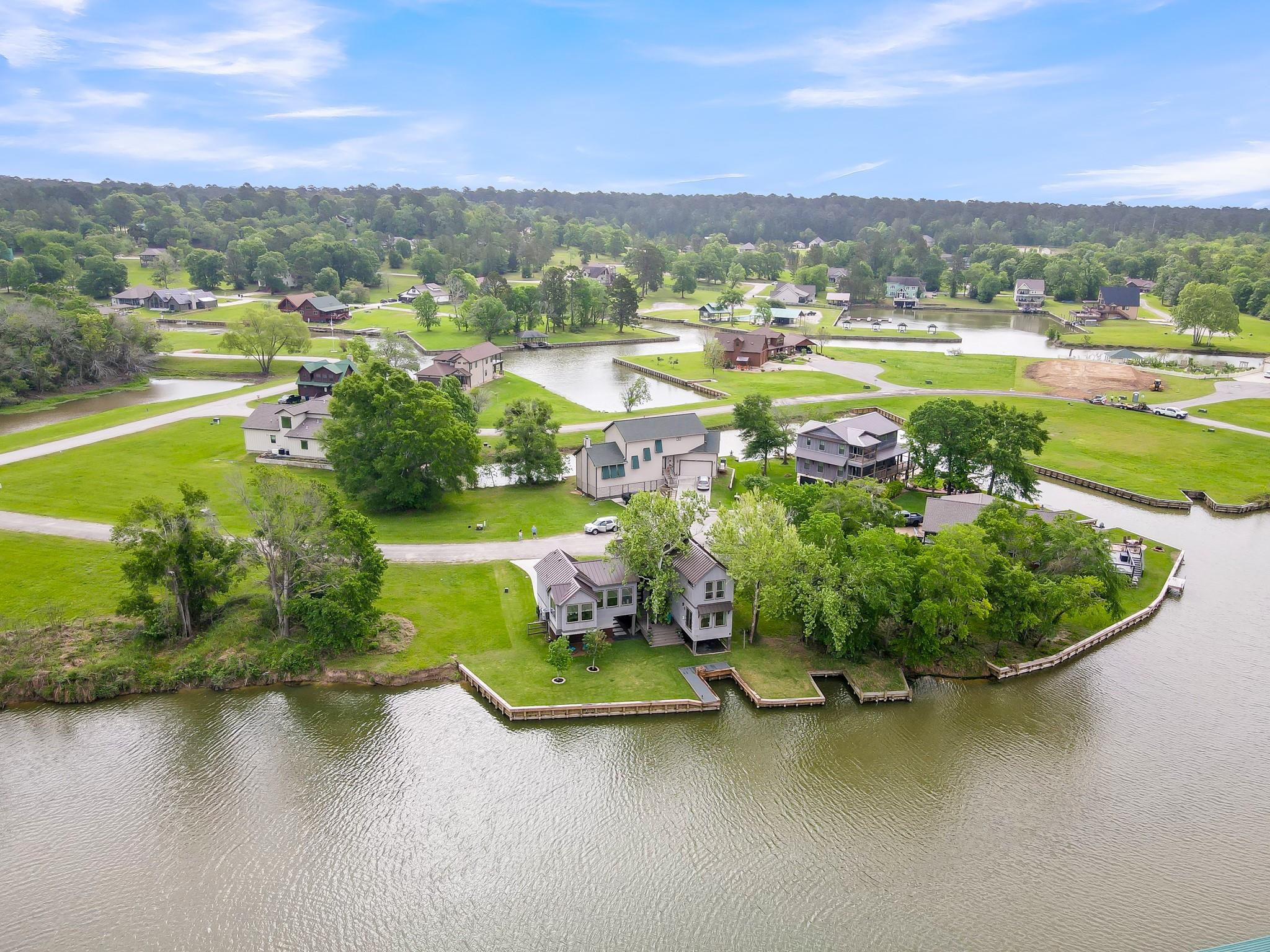 Architect-designed lakefront retreat in prestigious Wildwood Shores, Huntsville, set on the tranquil north end of Lake Conroe within Sam Houston National Forest. Private waterfront sanctuary surrounded by towering trees, protected forest land, and abundant wildlife. 1,926 SF split-level home blending modern sophistication with warm, mountain-inspired design. Open-concept living with vaulted beam ceilings and walls of glass capturing sweeping lake and forest views. Kitchen features granite countertops, natural wood-planked walls, large windows, and walk-in pantry with antique etched-glass door. Sculptural floating hickory staircase with cable railing leads to upper guest rooms with Jack-and-Jill bath. Private lower-level primary suite w/walk-in closet and full bath. Outdoor living includes private boat slip and lift, fishing-friendly bulkhead, and elevated deck for entertaining or sunset views. Gated community offers pools, tennis courts, boat launches, and resort-style setting.