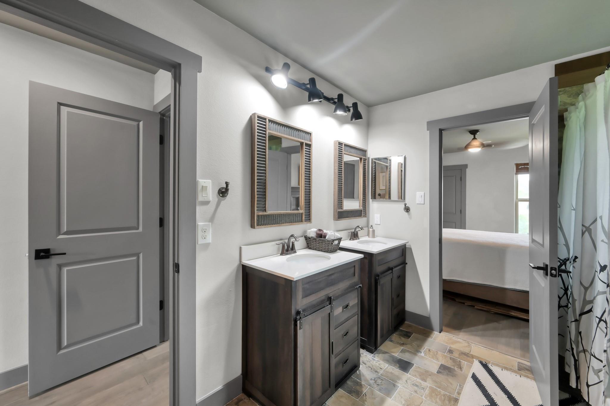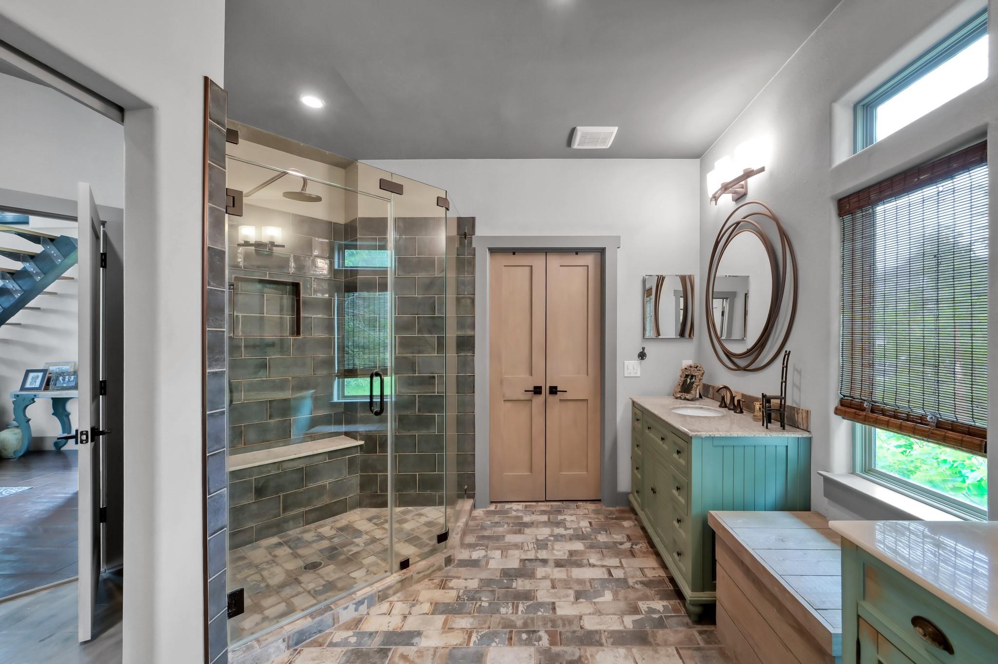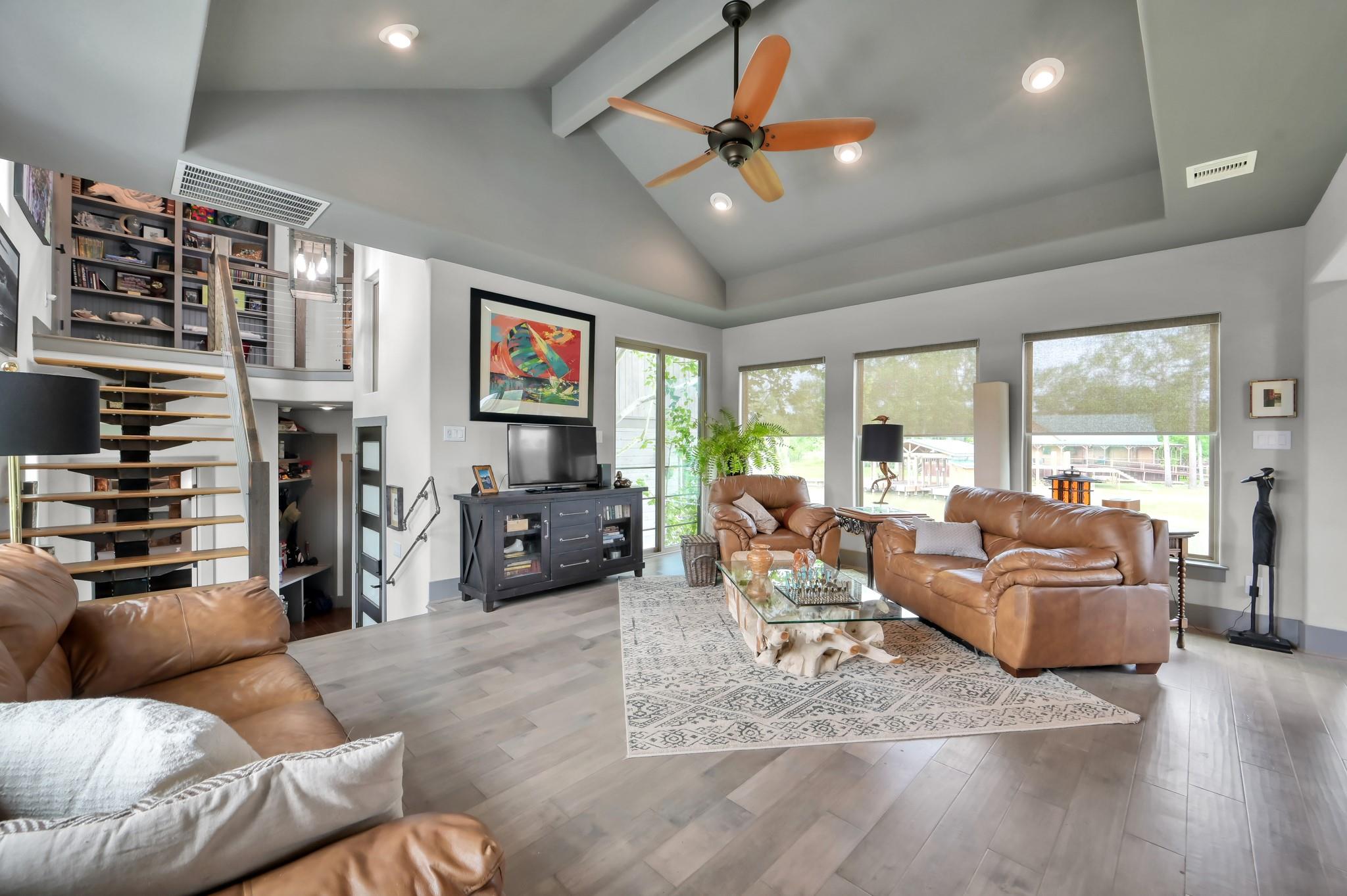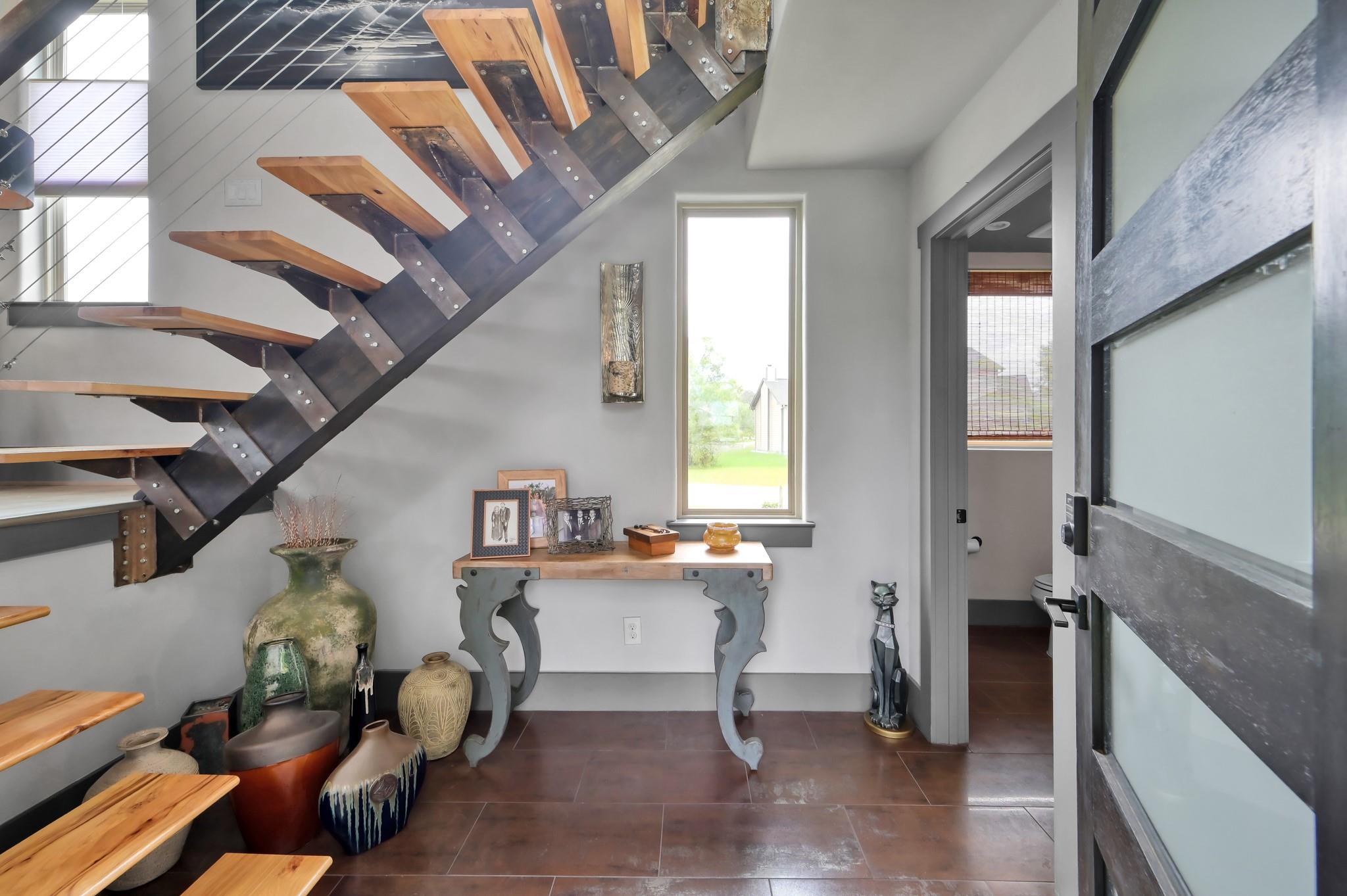 Architect-designed lakefront retreat in prestigious Wildwood Shores, Huntsville, set on the tranquil north end of Lake Conroe within Sam Houston National Forest. Private waterfront sanctuary surrounded by towering trees, protected forest land, and abundant wildlife. 1,926 SF split-level home blending modern sophistication with warm, mountain-inspired design. Open-concept living with vaulted beam ceilings and walls of glass capturing sweeping lake and forest views. Kitchen features granite countertops, natural wood-planked walls, large windows, and walk-in pantry with antique etched-glass door. Sculptural floating hickory staircase with cable railing leads to upper guest rooms with Jack-and-Jill bath. Private lower-level primary suite w/walk-in closet and full bath. Outdoor living includes private boat slip and lift, fishing-friendly bulkhead, and elevated deck for entertaining or sunset views. Gated community offers pools, tennis courts, boat launches, and resort-style setting.