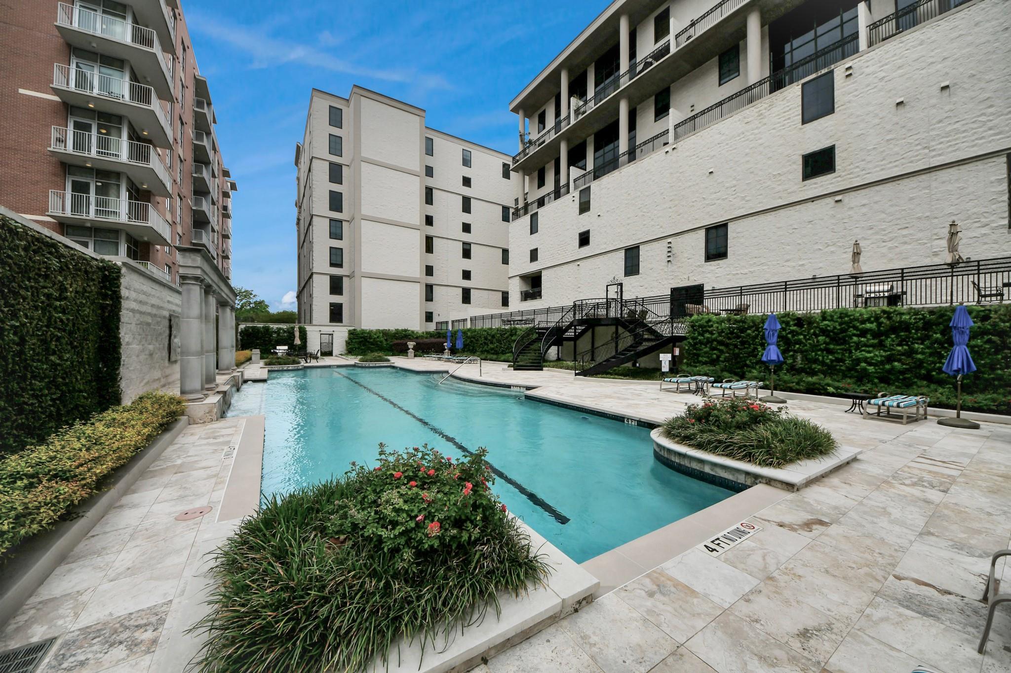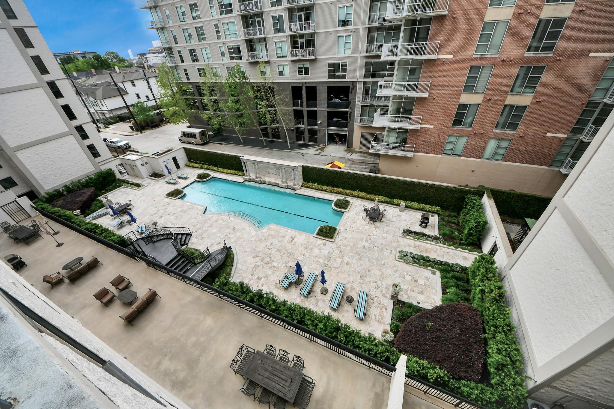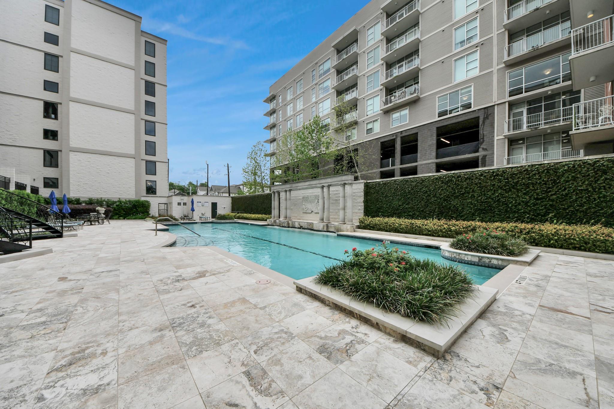 This beautifully appointed residence at Renoir Lofts offers the perfect blend of style, comfort, and convenience. With a huge balcony overlooking a serene resort-style pool, you have an ideal setting for morning coffee or unwinding at the end of the day. The thoughtfully designed interior features an open-concept layout filled with natural light from the massive windows. The kitchen stands out with striking waterfall-edge countertops and a premium appliance package including Bosch and Fisher & Paykel, seamlessly combining modern design with everyday functionality. The spacious living and dining areas flow effortlessly, making the home equally suited for entertaining or relaxed daily living. The building offers secure access and low-maintenance living in an unbeatable location, just steps from River Oaks Shopping Center and minutes from The Heights, Montrose, and Downtown Houston. With easy access to major interstates, this is the very best of Houston right at your doorstep.
