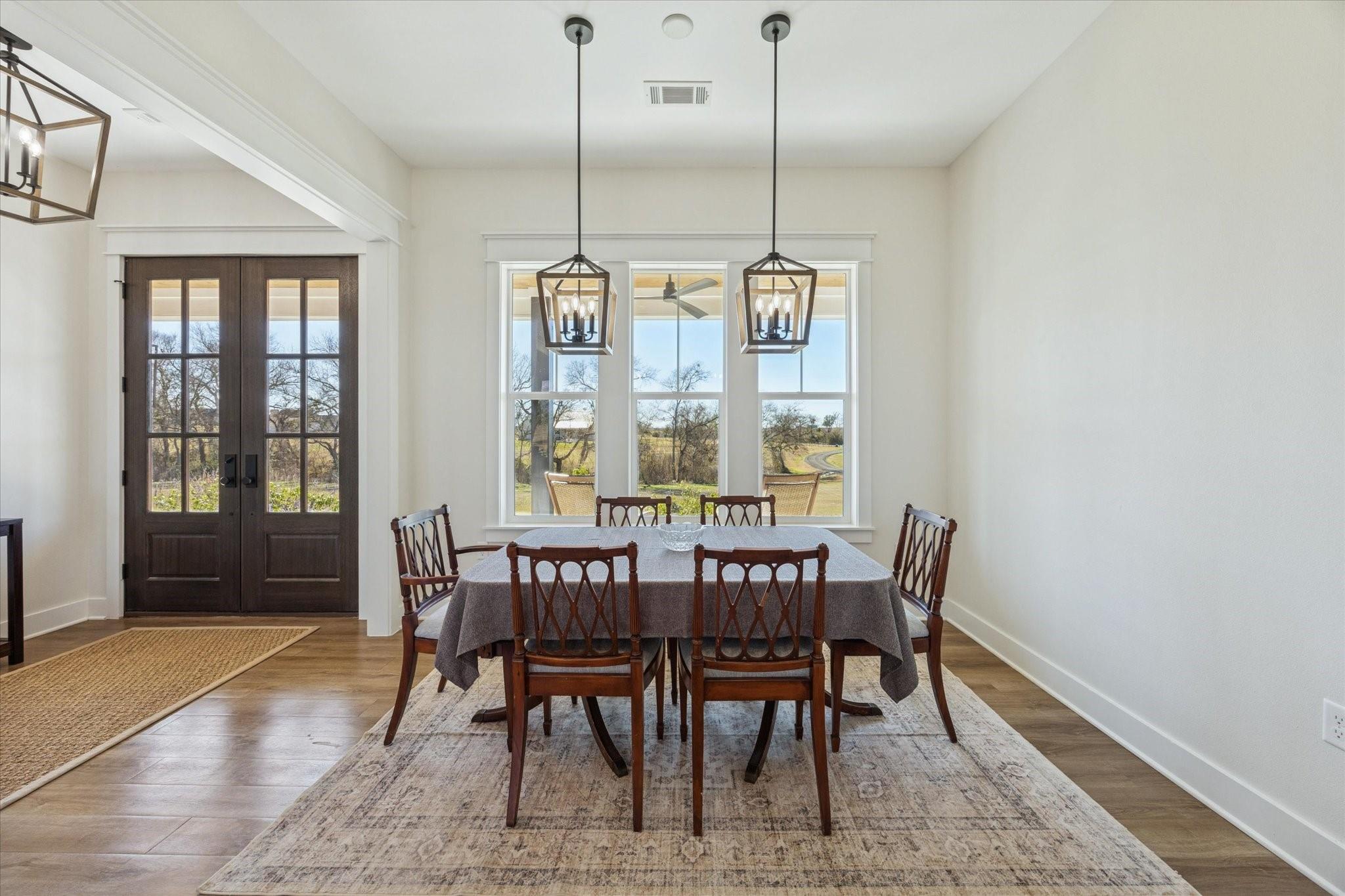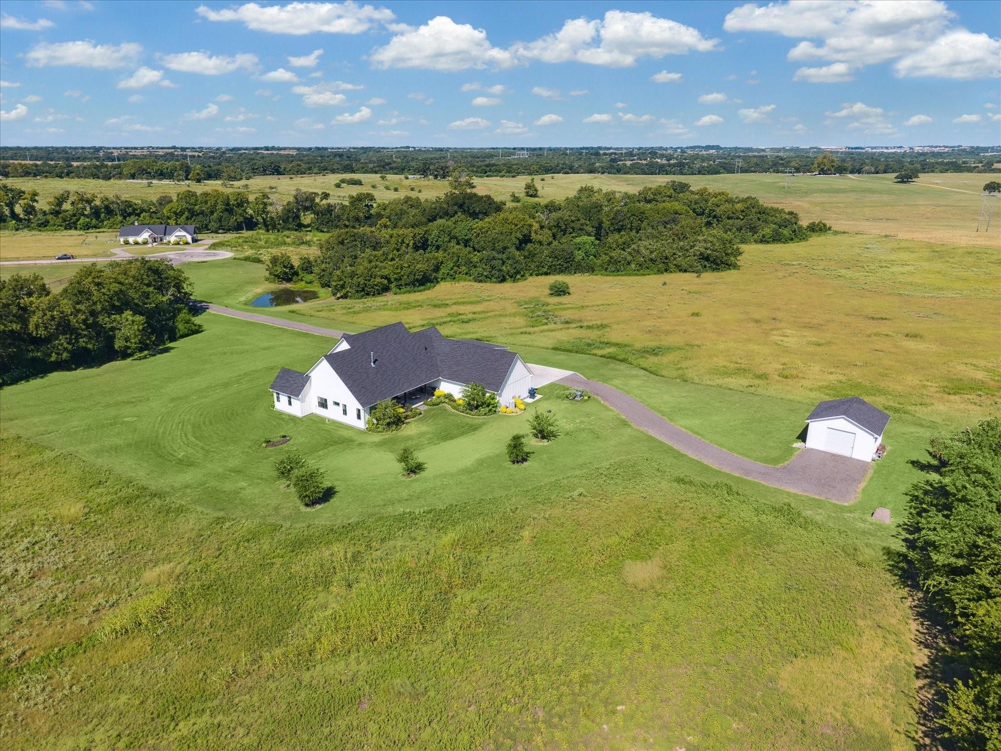 Gracefully positioned atop +/-13 ag exempt rolling acres, this exceptional custom modern farmhouse commands panoramic views of the surrounding countryside. Each day begins with radiant sunrises and ends with spectacular sunsets, while the evening reveals the soft twinkle of Brenham’s city lights — a rare and captivating backdrop. The thoughtfully designed home features approximately 2,980 SF with 4 bedrooms, 4.5 baths, two living areas, and a private office. Expansive windows fill the interior with natural light while capturing the surrounding views. Outdoor living includes a covered outdoor kitchen and fireplace, ideal for entertaining or relaxing evenings. Additional improvements include a 3-car garage with epoxy flooring and a storage building suitable for a tractor and equipment. Located in a community of custom homes, this property provides peaceful acreage living with a neighborhood setting, all just five minutes from Brenham’s premier shopping and dining.