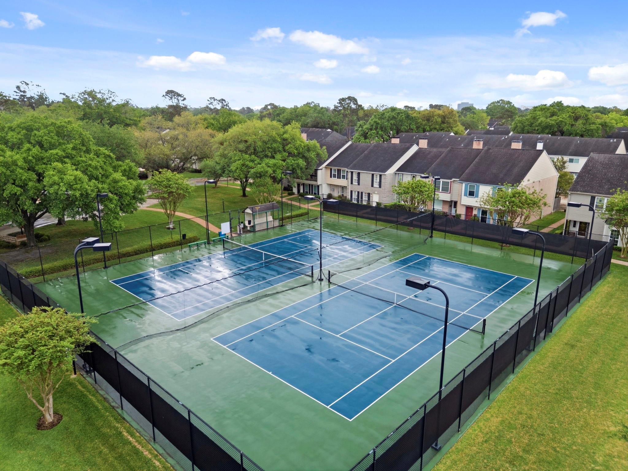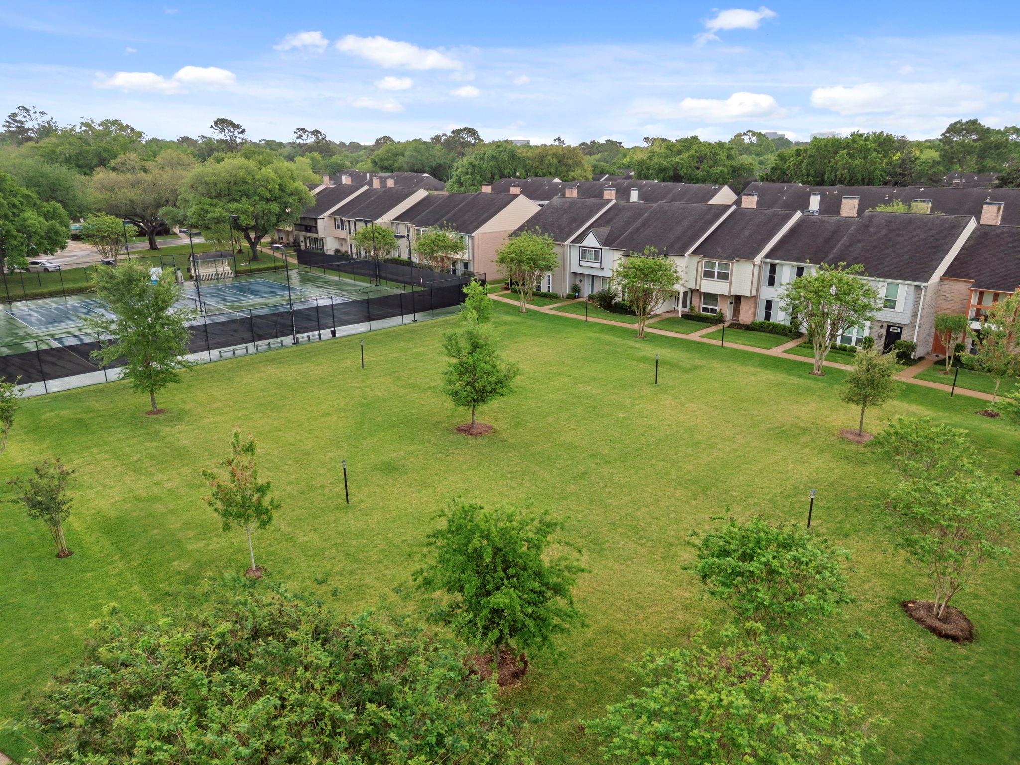 Quietly situated AWAY FROM THE HIGHWAY and NEVER FLOODED. Wood flooring throughout first and second floors. Built-in living room storage with DRY BAR + WINE FRIDGE. Classic WOOD-BURNING FIREPLACE. Functional layout with separate dining area and SOUTHWEST-FACING natural light. TWO TRUE PRIMARY SUITES upstairs with ENSUITE BATHROOMS. Updated baths with GRANITE COUNTERTOPS and modern finishes. Spacious bedrooms. Private BACK PATIO + front yard space. TWO COVERED CARPORT SPACES directly in front of unit. HOA covers WATER, FRONT YARD MAINTENANCE, TRASH, and amenities including POOL, TENNIS COURTS, PLAYGROUND, PICNIC AREA & CLUBHOUSE. Easy access to major highways without the noise.