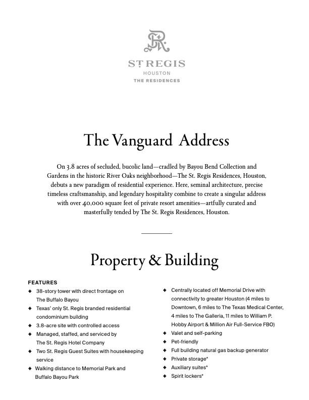 The St. Regis Residences, Houston — an exclusive collection of 90 private residences — offers residents the timeless sophistication of the St. Regis legacy, with world-class amenities, bespoke interiors, and five-star service in residence. The 3.8 acres of secure, private, resort-like setting along the graceful Buffalo Bayou, offers panoramic views of Houston’s most cherished locations, including River Oaks, Rice Military, and the expanding downtown Houston Skyline. Owners enjoy legendary St. Regis butler service, valet, concierge, and access to over 40,000 square feet of private amenities. These include the Astor dining room and cognac bar on the 20th floor, a resort-style pool deck with cabanas, a state-of-the-art fitness area, spa, wellness center, owner’s lounge, pet spa, landscaped butterfly gardens, and full building generator backup. Every detail is curated to deliver the signature St. Regis lifestyle — refined, discreet, and service-driven.