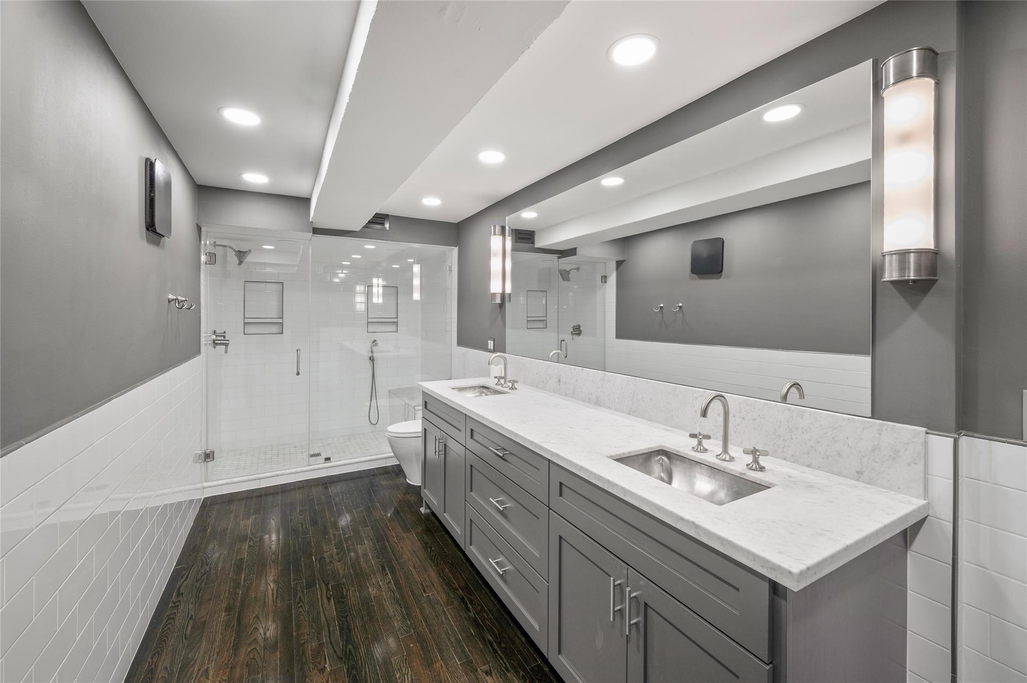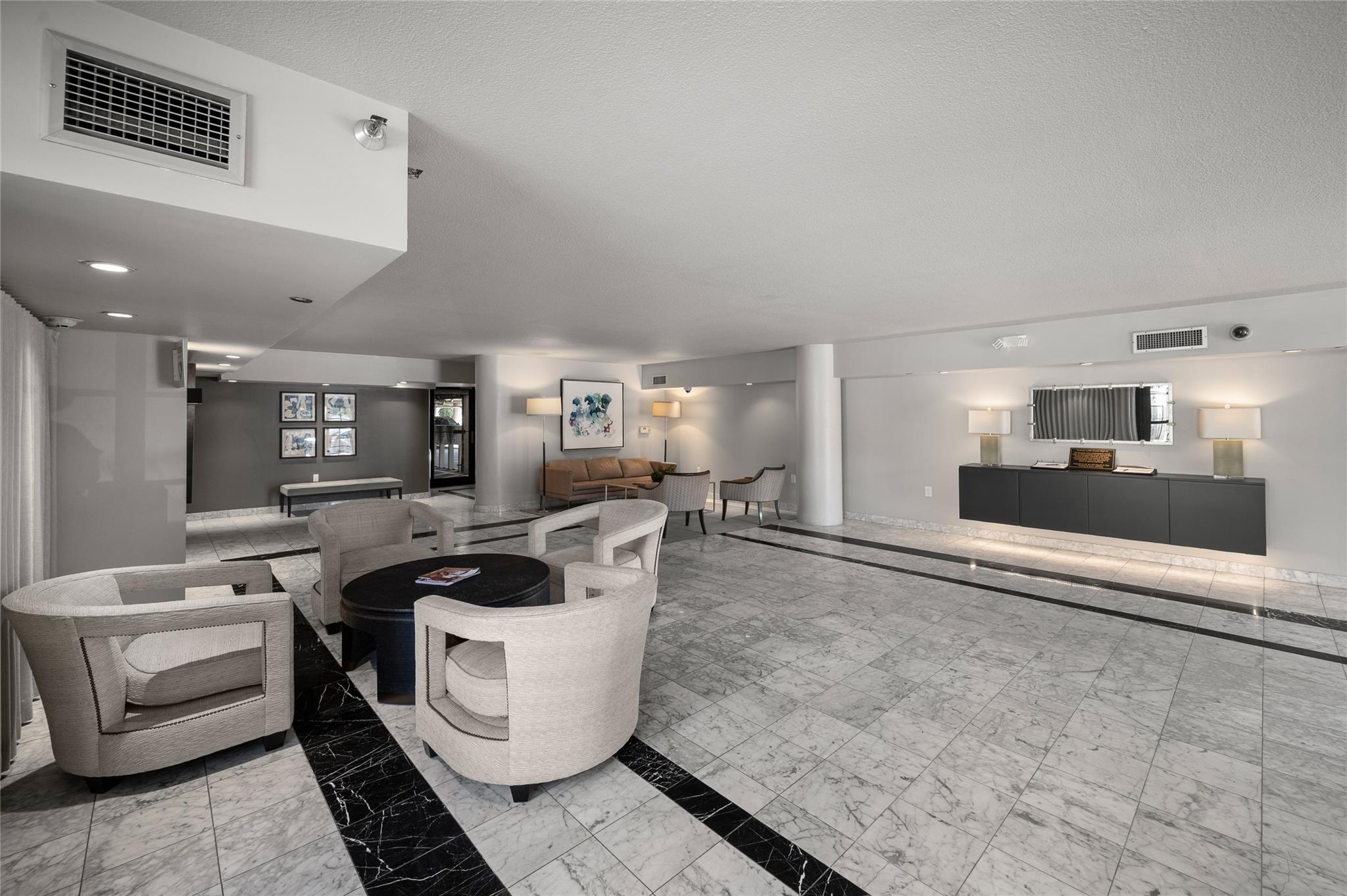 Stylish, chic, and walkability score of ten! This extensively renovated, corner-unit condominium at the Gotham gives you the opportunity to live in a sought after mid-rise on the perimeter of River Oaks, close to myriad restaurants and retail. The first floor includes a welcoming foyer with well-appointed full bath and a marble, island kitchen with Monogram stainless steel appliances and breakfast bar. A natural flow to the open living and dining areas allows flexibility for creating personalized spaces that enjoy the natural light peering in from the large statement window. Upstairs, you will find two bedrooms, walk-in closets, and a large, full bath with double sinks, marble finishes, and spacious shower. This concierge building offers a pretty swimming pool with lounging deck and outdoor grill. Two parking spaces are included with the unit. Please call for a personal tour! Immediate occupancy available and move-in ready.