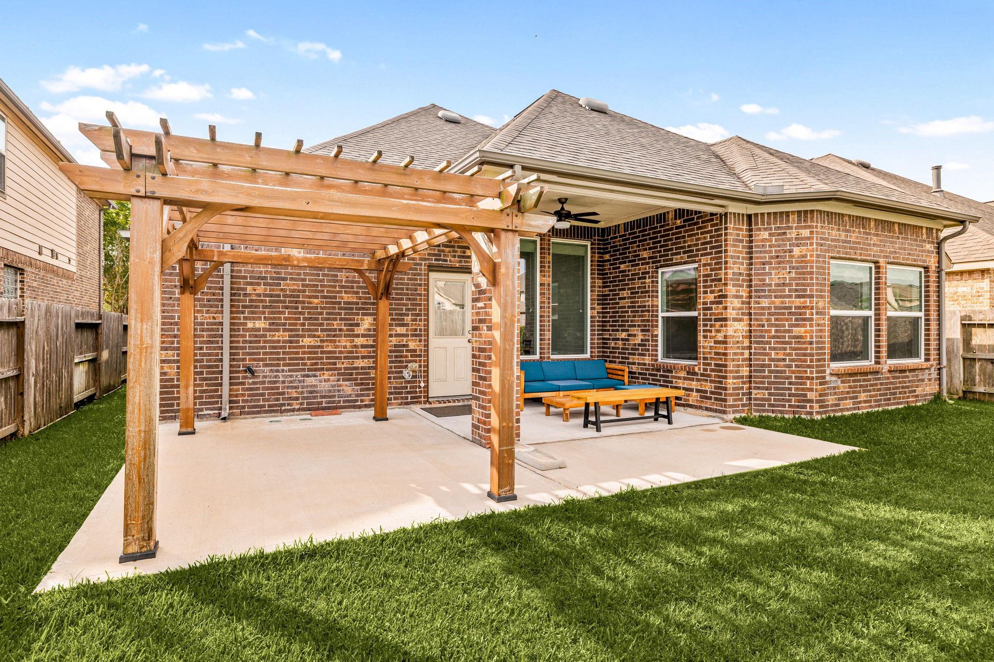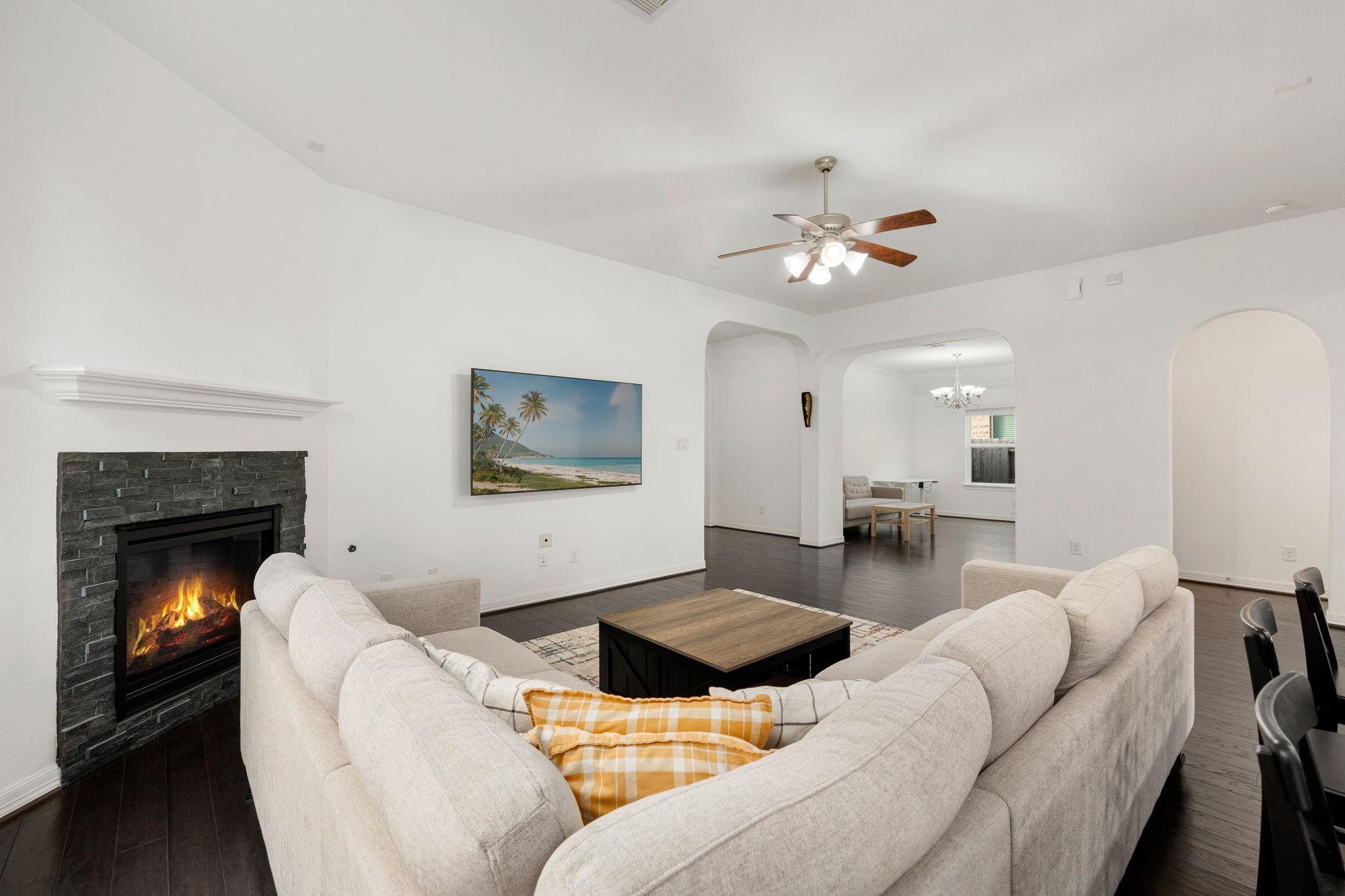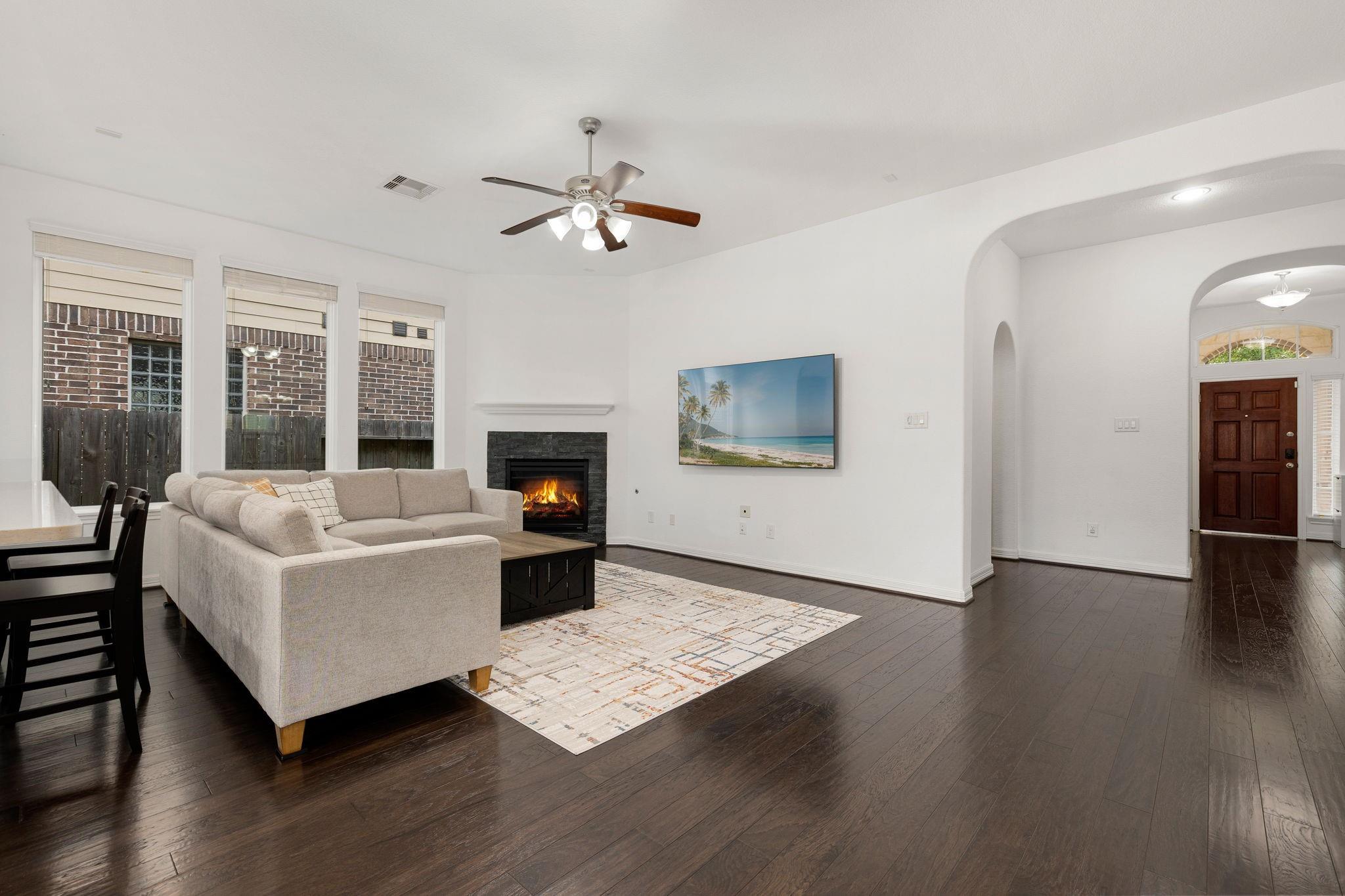 /monthThis stunning single-story home with no back neighbors boasts exquisite finishes and desirable features. The open floor plan showcases high ceilings, engineered wood flooring & an abundance of natural light. The family room with a fireplace flows seamlessly into the updated kitchen with a large island, Quartz countertops, SS appliances, upgraded dishwasher, super single Blanco kitchen sink & a large pantry. Custom shelves adorn the game/living/dining/flex area & one of the bedrooms. The owner's retreat offers raised ceiling, bay windows, a custom walk-in closet, and spa-like ensuite. Guest bedrooms are also spacious with large closets. Additional highlights include upgraded toilet bowls & tanks, upgraded water heater, large capacity washer and dryer, a covered patio with a pergola, and a sprinkler system in the yard. Enjoy community amenities such as a fitness center, parks, pools, and lakeside trails. Perfect for those seeking a stylish and convenient lifestyle!