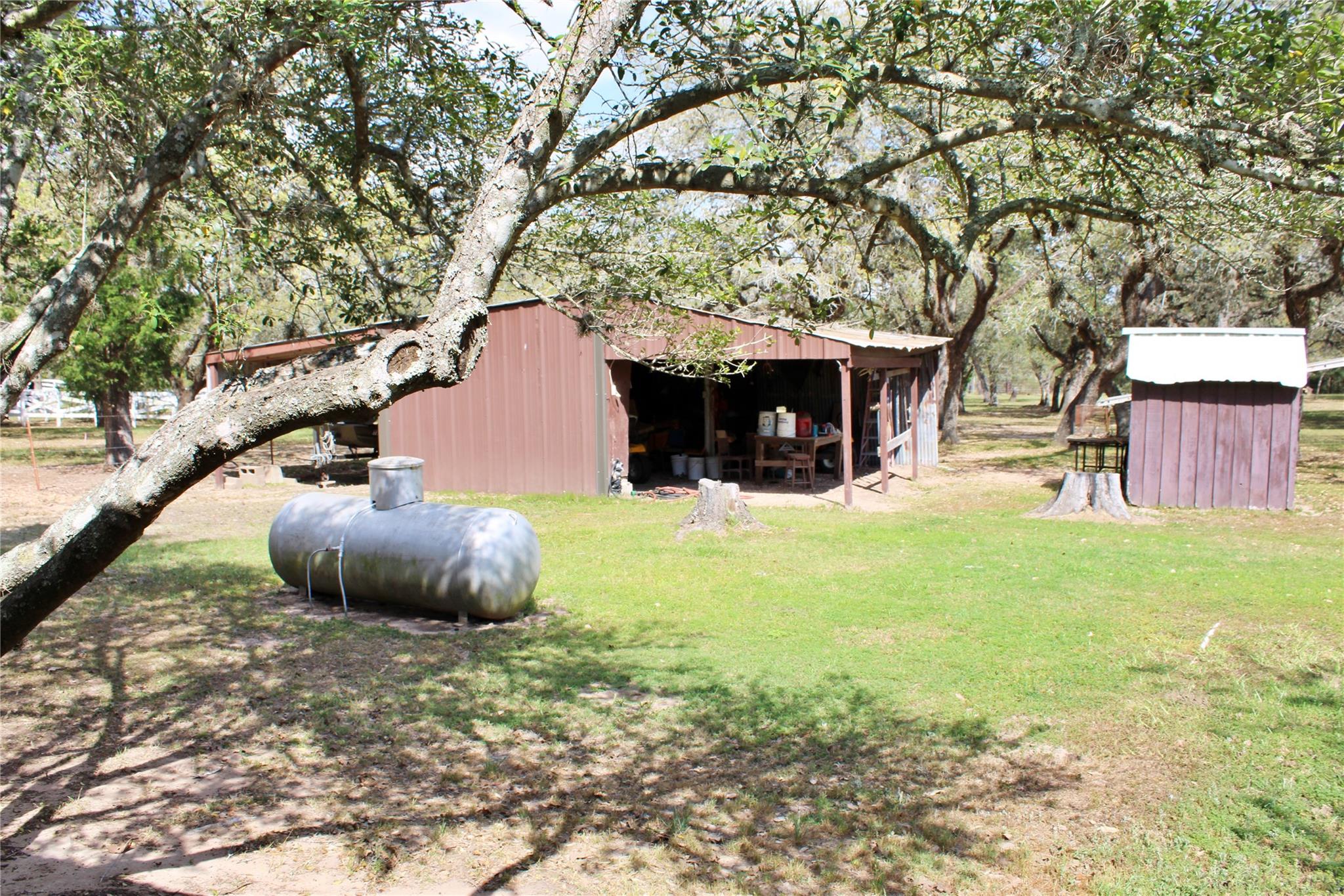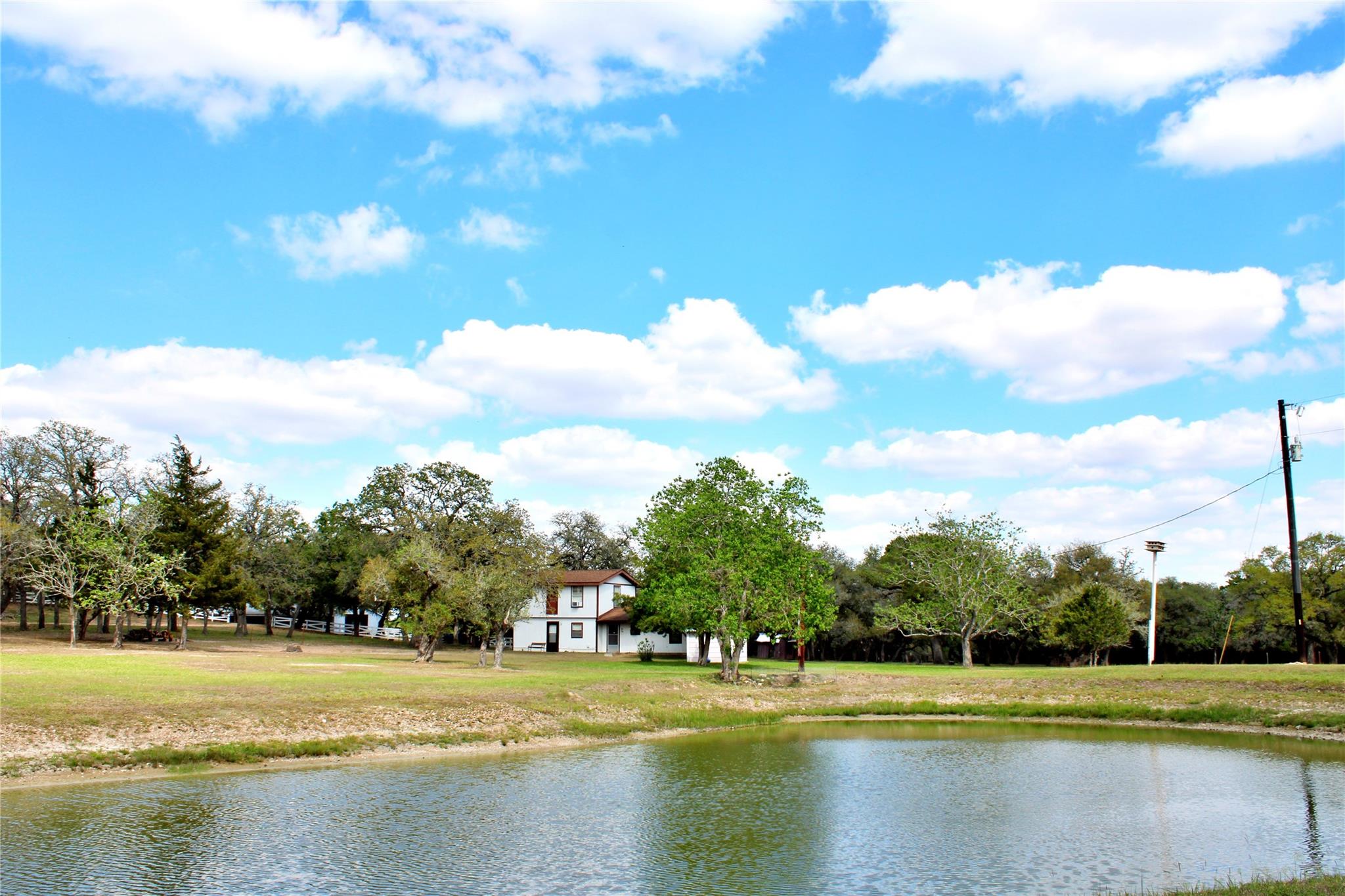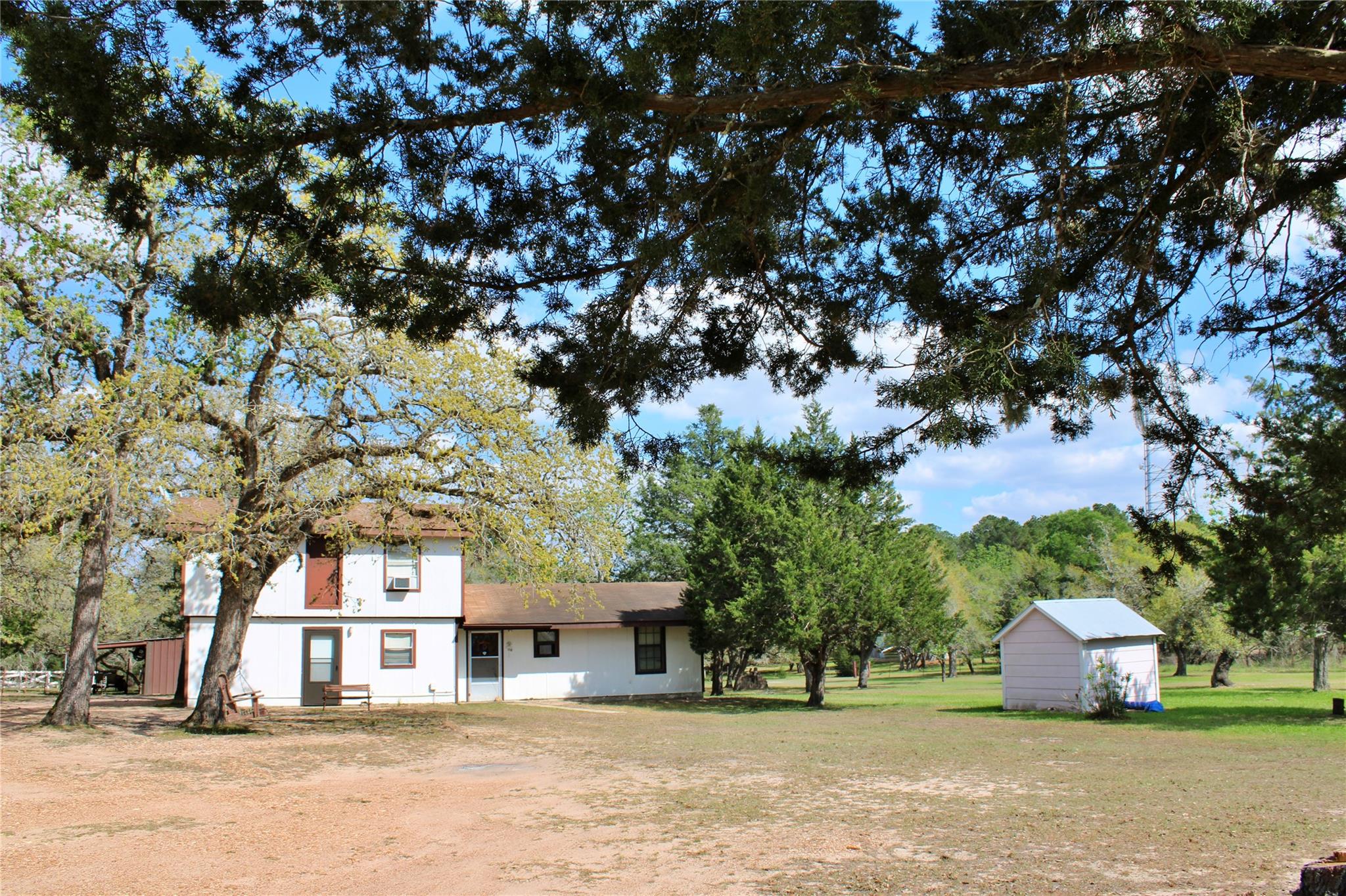 Great starter home. Bottom floor has a utility room, kitchen with breakfast area, living/dining area, primary bed and bath. Upstairs has 2 bedrooms with a full pass-through bath. The home has an attached carport. The land is immaculate with beautifully kept grounds, pond, out buildings, and sheds. The oaks on the property form a relaxing, canopy type landscape. The property is unrestricted. It has easy access from IH-10 and is close to town.
