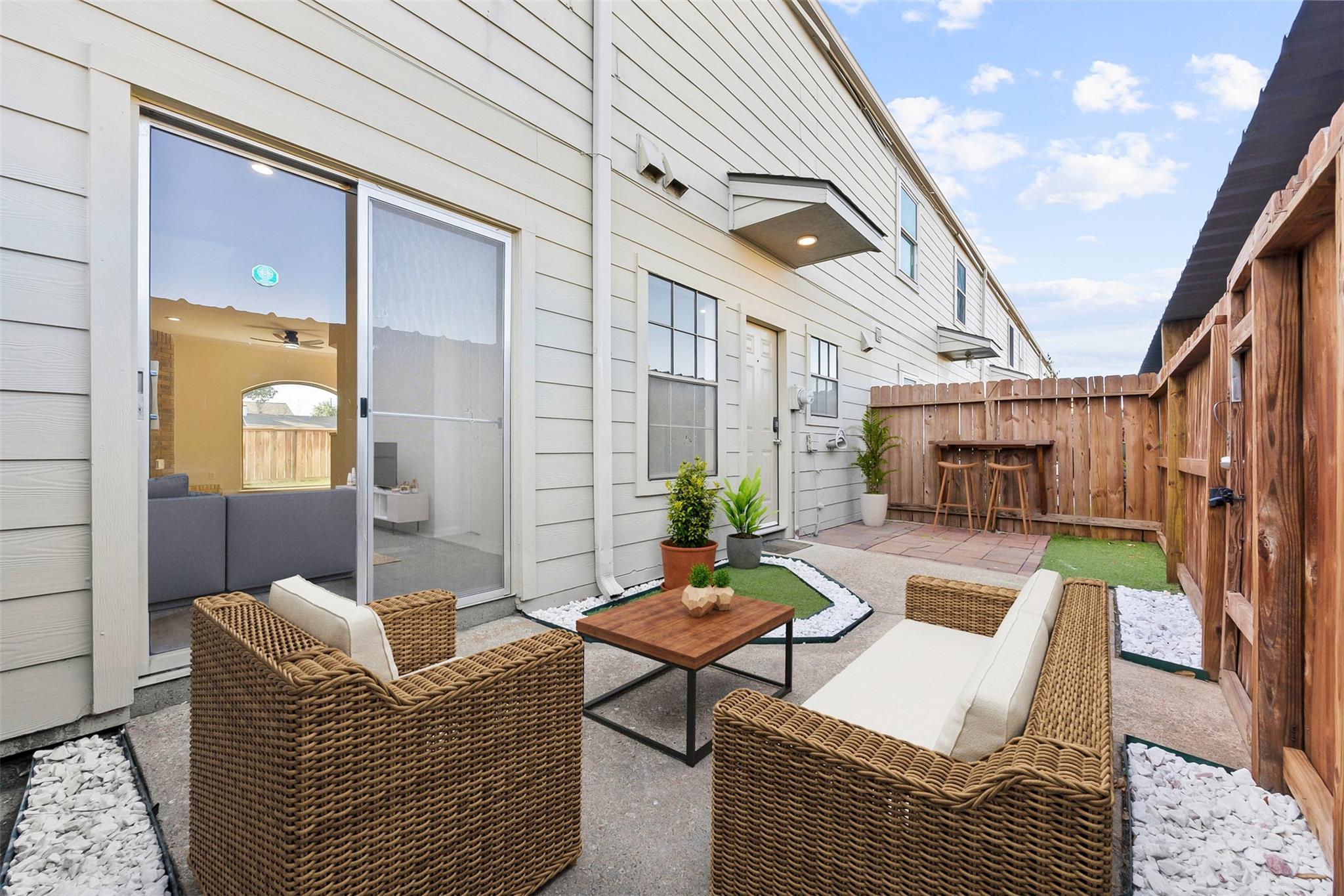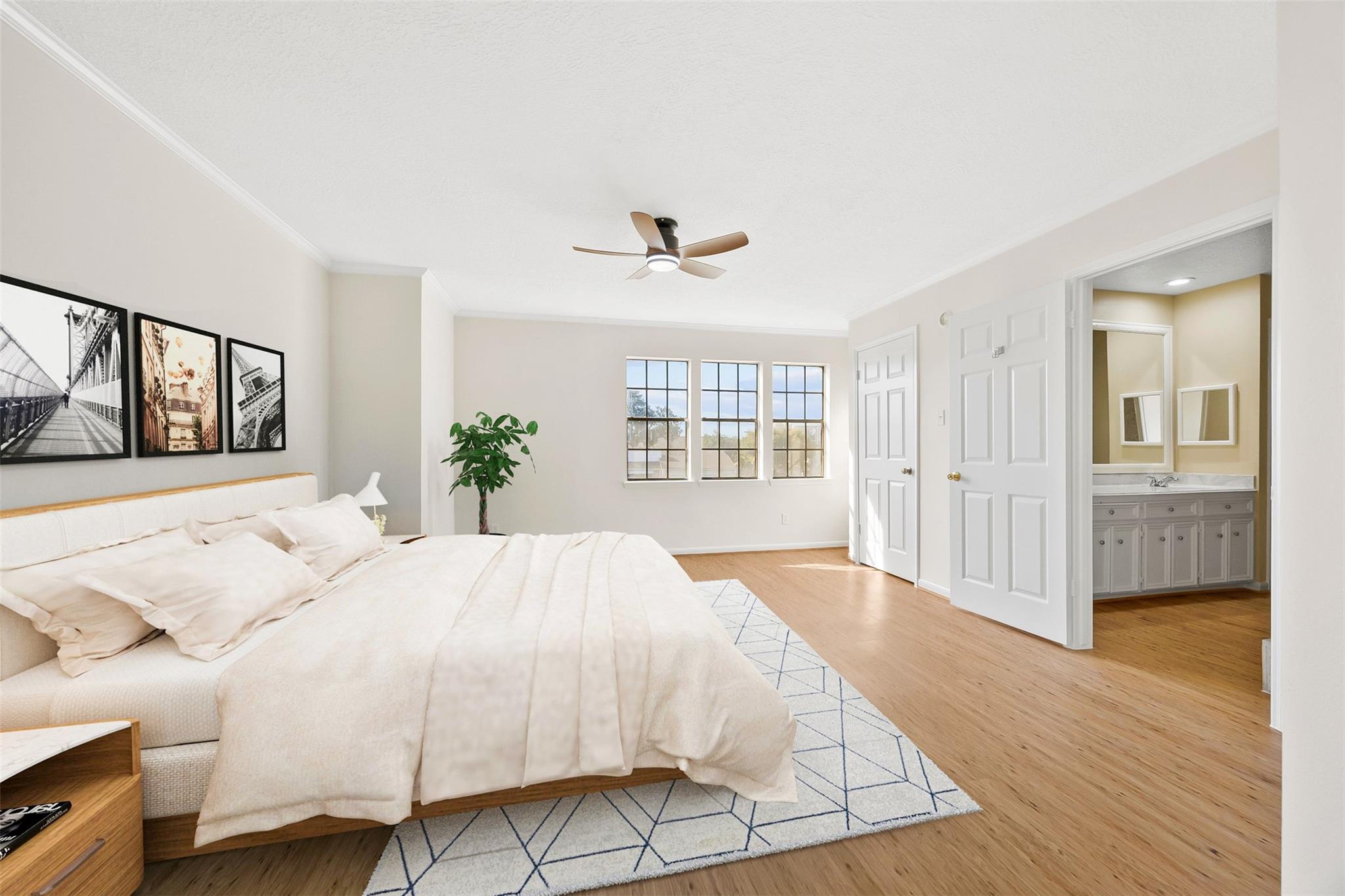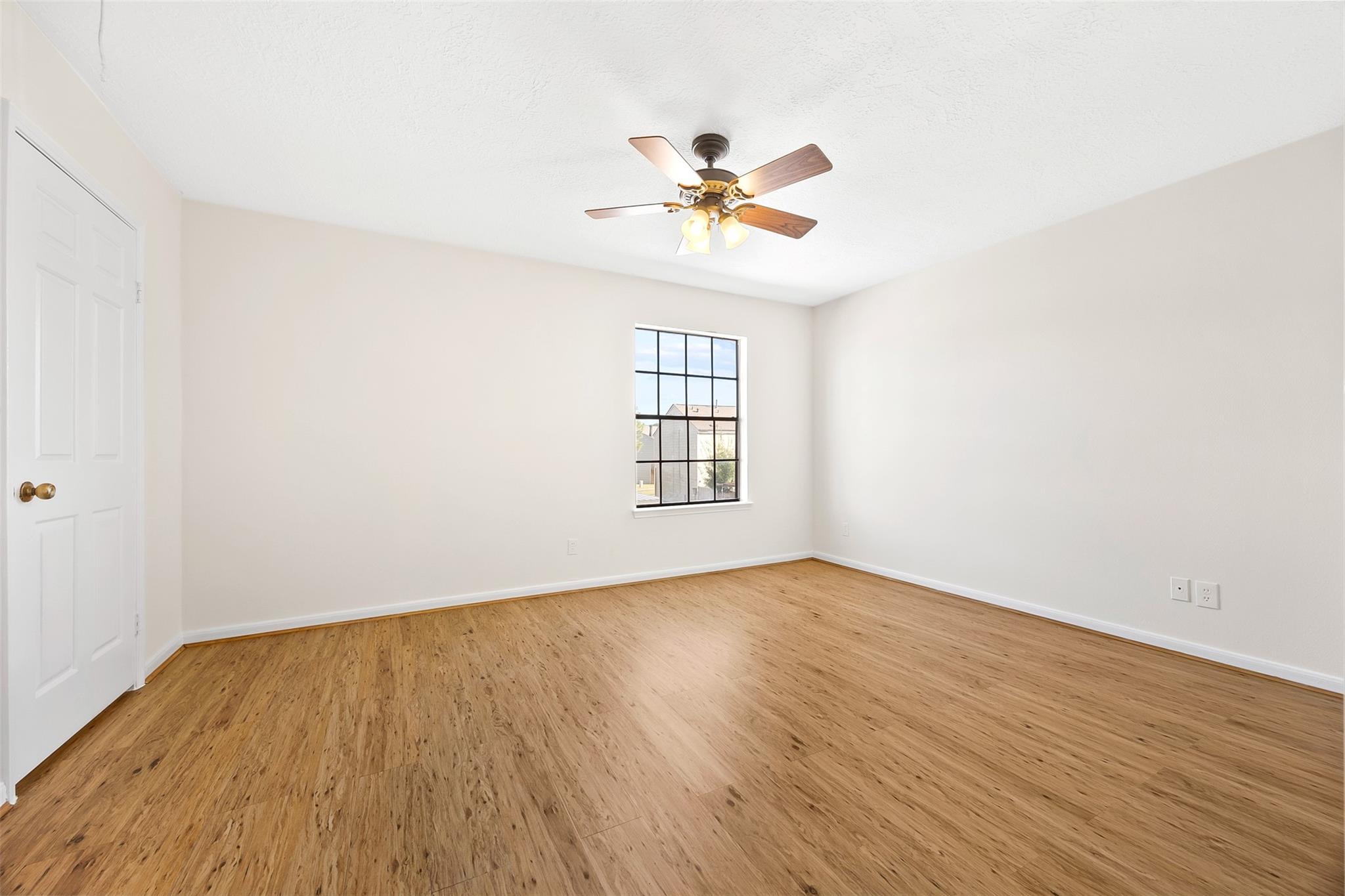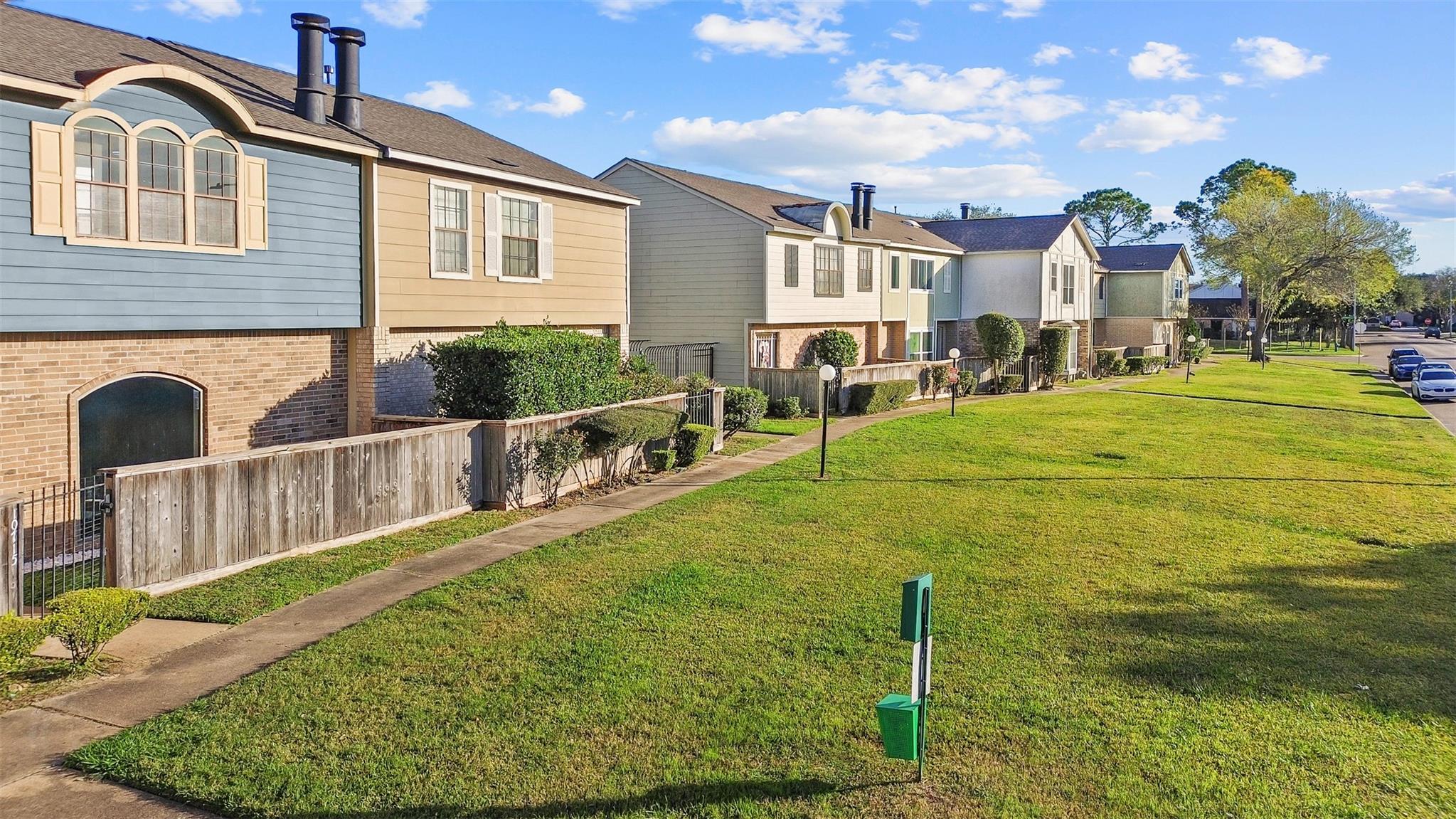 Spacious, updated, well-kept 2 story townhome in a manicured community. Enjoy two spacious bedrooms each with its own ensuite bathroom and large walk-in closets. Massive master bedroom with lots of light and new luxury wood grain vinyl flooring throughout (no carpet). Enjoy a landscaped, low maintenance front outdoor space and a turfed, landscaped back patio with built-in mounted bar top for porch sipping. Brand new roof and water heater. New bright paint. New front storm window. Custom built kitchen cabinets. Newly insulated attic. Wet bar and gas fireplace. One of the few in community with a fully enclosed private garage. Keyless front gate and door access and locking. Brand new neighborhood walk, jog, bike trail the city implemented across the street. Dependably maintained grounds green space to walk the dogs.7 minutes to Beltway 8 and Highway 90. 8 minutes to Highway 59. 10 minutes to 610 and Meyerland shopping square.Westbury Park a few blocks away. Two large HEBs within 5 miles.