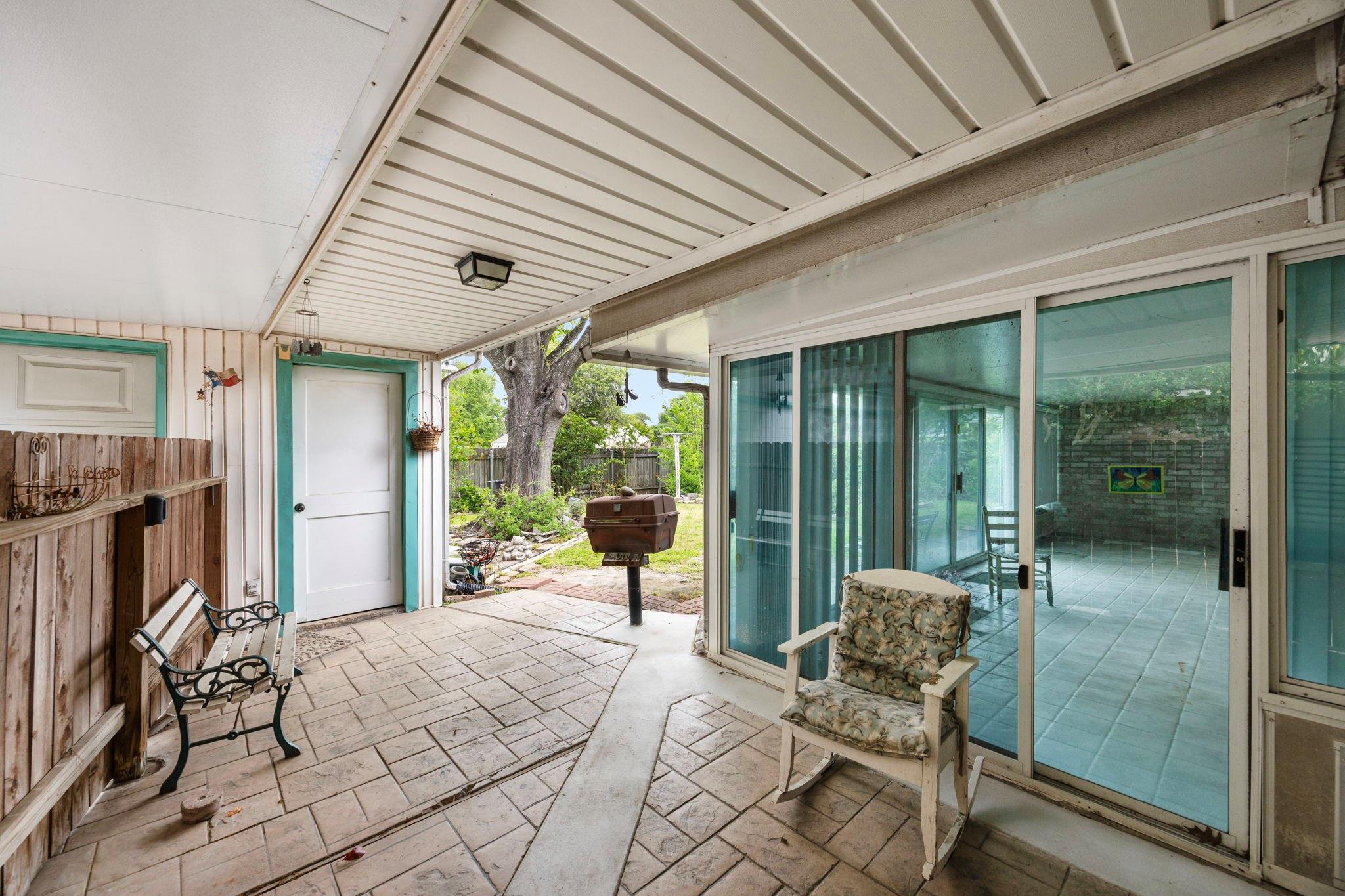 ExteriorRoof:MetalFoundation:SlabPrivate Pool:NoExterior Type:Brick,WoodLot Description:Subdivision LotGarage Carport:Single-Wide Driveway,WorkshopWater Sewer:Public Sewer,Public WaterExterior:Back Yard,Back Yard Fenced,Covered Patio/Deck,Private Driveway