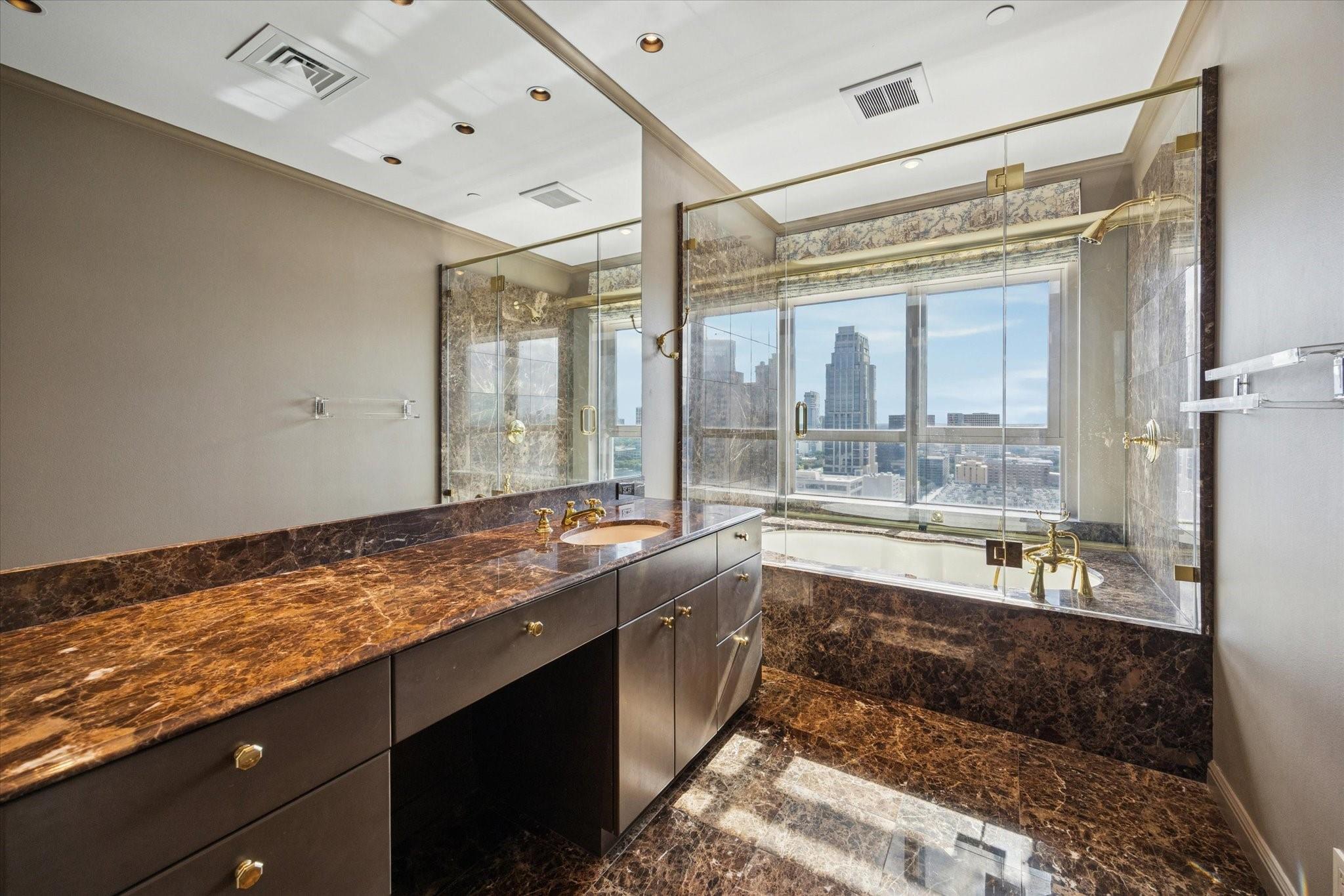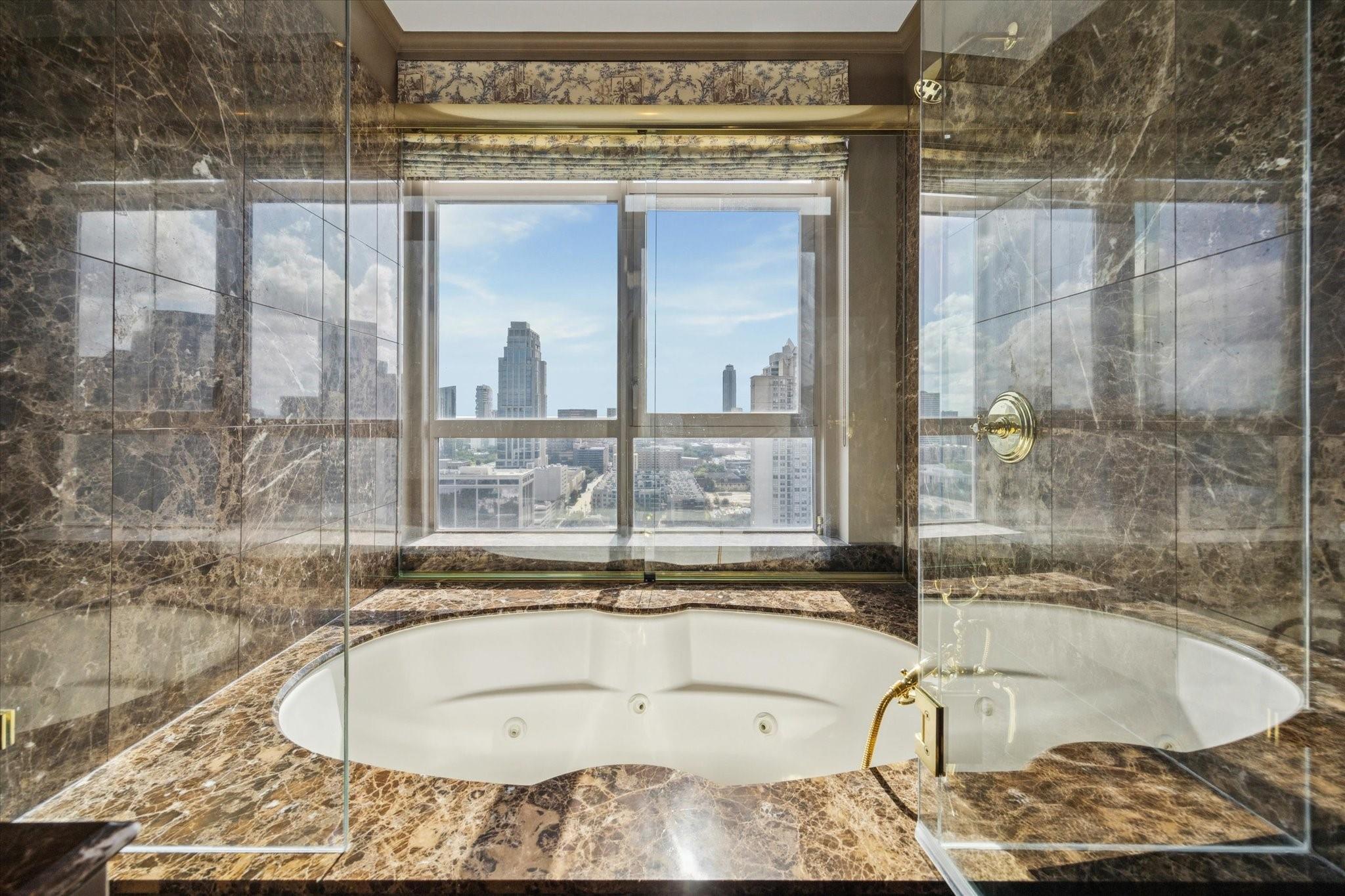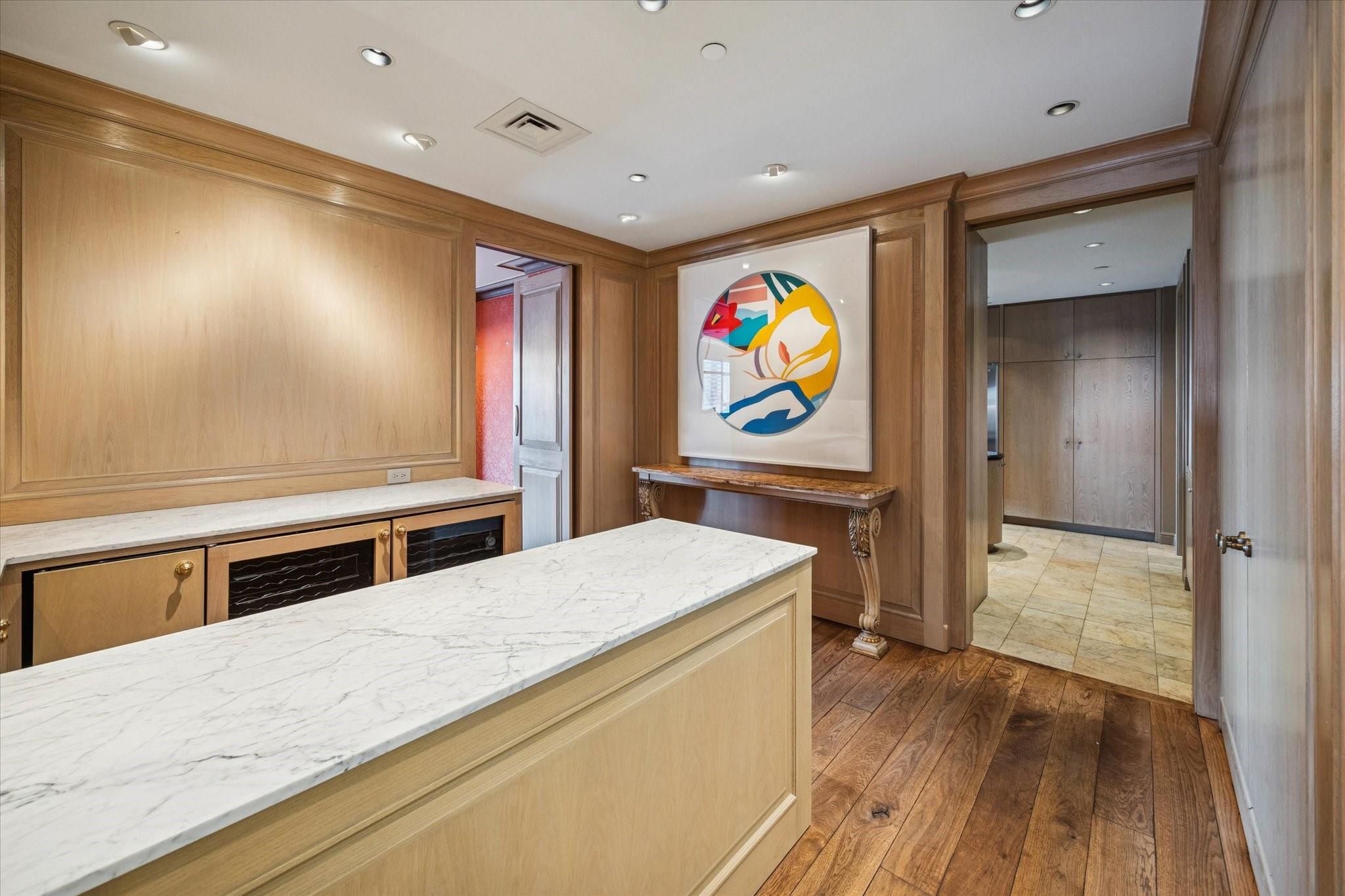 Sumptuously finished home purposed for refined daily living and elegant entertaining. High-design features include stunning Versailles-pattern & wide-plank hardwood floors; elaborate bespoke ceilings; trompe l’oeil stained glass panels; rich paneled or upholstered walls; art lighting; sleek cabinetry; pocket doors; select marble and granite surfaces. Open living areas surrounded by full-length windows, wide balconies, wonderful tree-top views. Inviting dining rm w/ silver/china closet. Distinguished chef’s kitchen/gathering space w/ full-sized SubZero ref & frzr, Thermador ovens, extensive storage/service area. Breakfast rm. Superb full bar w/ 2 chillers, 2 beverage drawers. Secluded primary suite w/ expansive sitting rm w/ book/display shelves, full length windows; private balcony; remote-controlled sun shades; lavish marble-clad & mirrored bath w/ designer wallpaper, separate sink decks, vanity; double walk-in closet. Luxurious guest suite w/ upholstered walls, marble-clad bath.