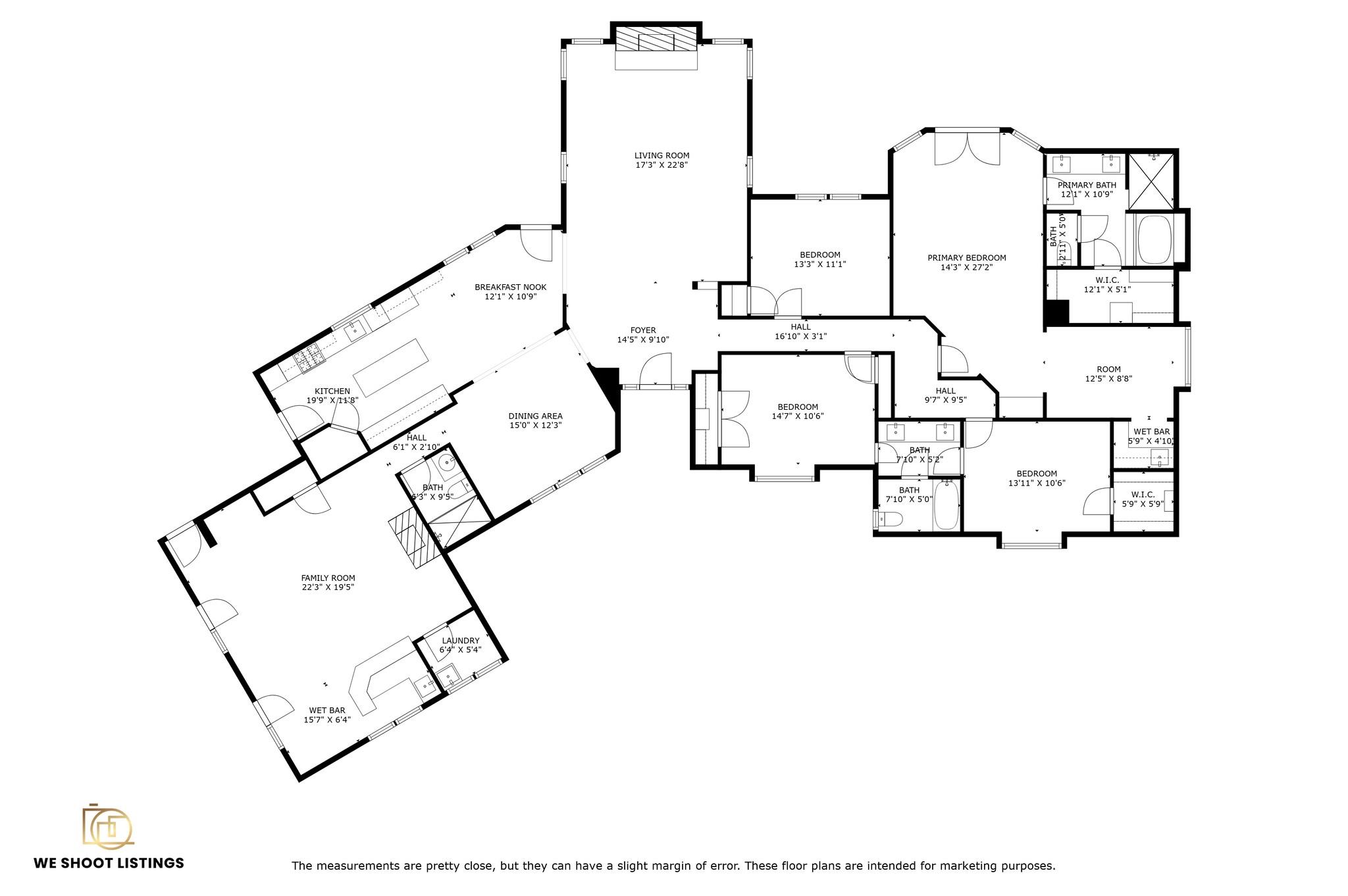 First FloorLiving:17'3" x 22'8"Family Room:22'3" x 19'5"Dining:15'0" x 12'3"Kitchen:19'9" x 11'8"Breakfast:12'1" x 10'9"Primary Bedroom:14'3" x 27'2"Bedroom:13'11" x 10'6"Bedroom 2:14'7" x 10'6"Bedroom 3:13'3" x 11'1"Primary Bath:12'1" x 10'9"Bath:7'10" x 10'2"Bath 2:6'3" x 9'5"