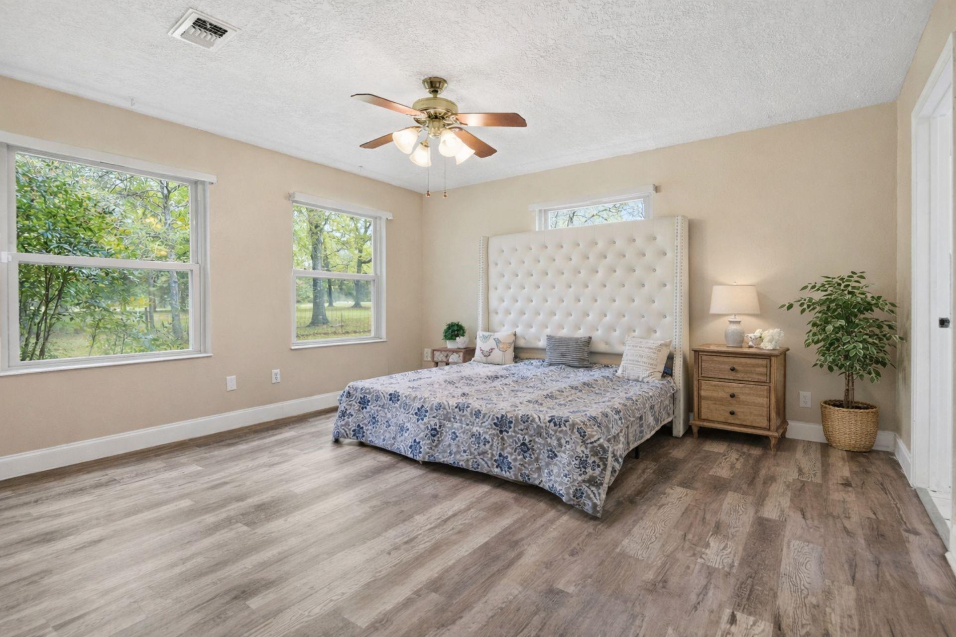 Welcome to this private 5-acre property with a low property tax rate (buyer to verify), an inviting front porch, and endless possibilities. This 4-bedroom, 3-bath home features a spacious living area that flows into a fully equipped, updated kitchen with a double oven and dining area. The primary suite offers an en suite bath and two walk-in closets. Upstairs, a flexible bonus space is ideal for additional bedrooms, a game room, or a media area, with access to a private balcony. The backyard oasis features a saltwater pool, patio, outdoor shower, and covered porch with grill, perfect for entertaining. The property also includes a barn with electricity, multiple sheds, storage for tractors or lawn equipment, and a 16x40x36 carport with 30-amp hookup for RV or vehicle parking. With the roof, windows, and siding updated within the last 5 years, plus a concrete pad with electric, water, and septic available, this property is ready for a hobby farm, garden, or peaceful outdoor living.