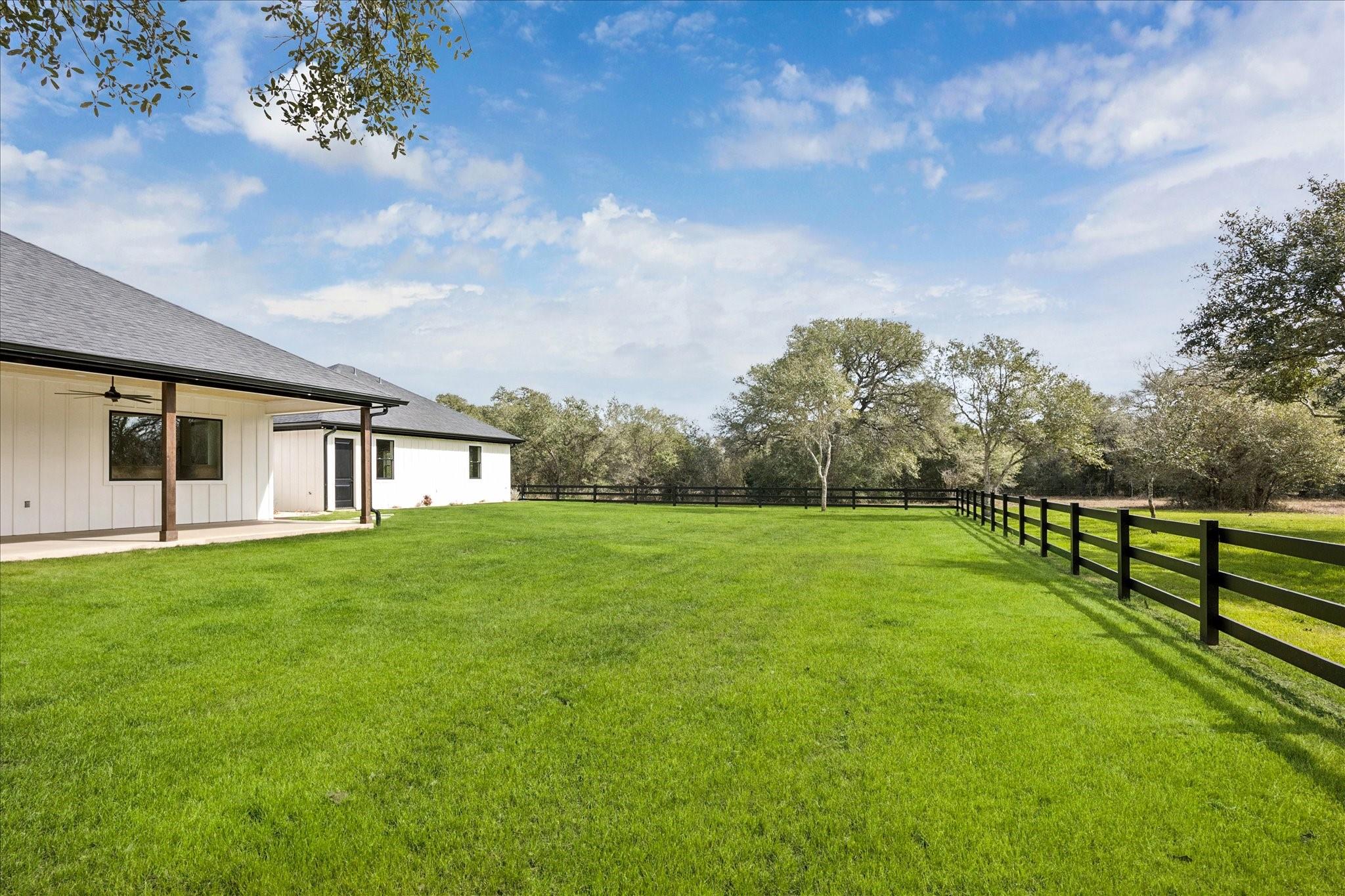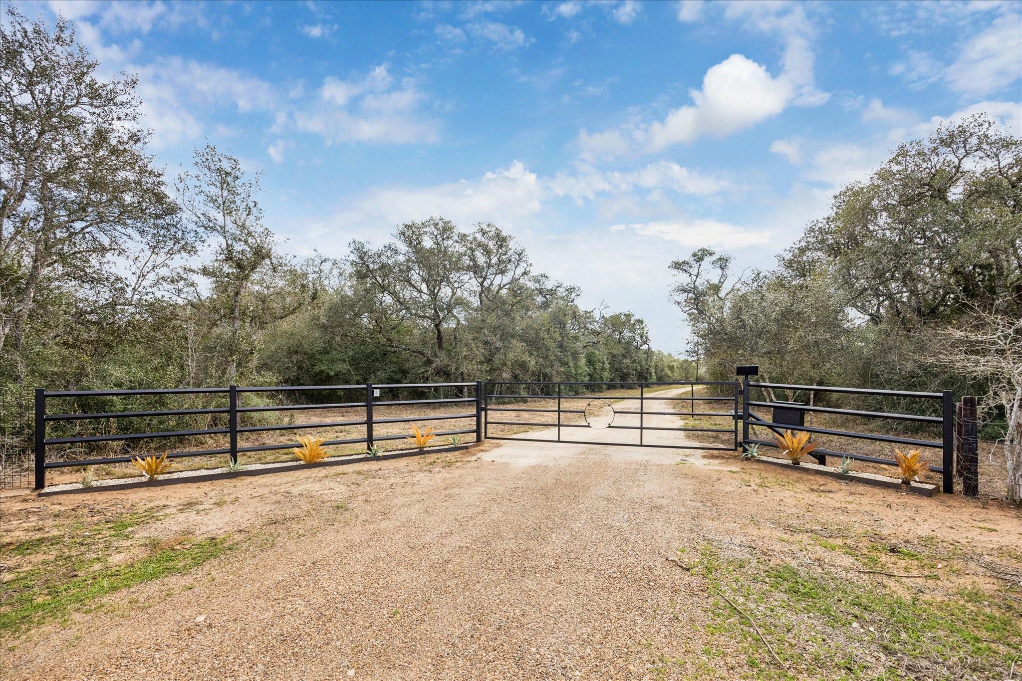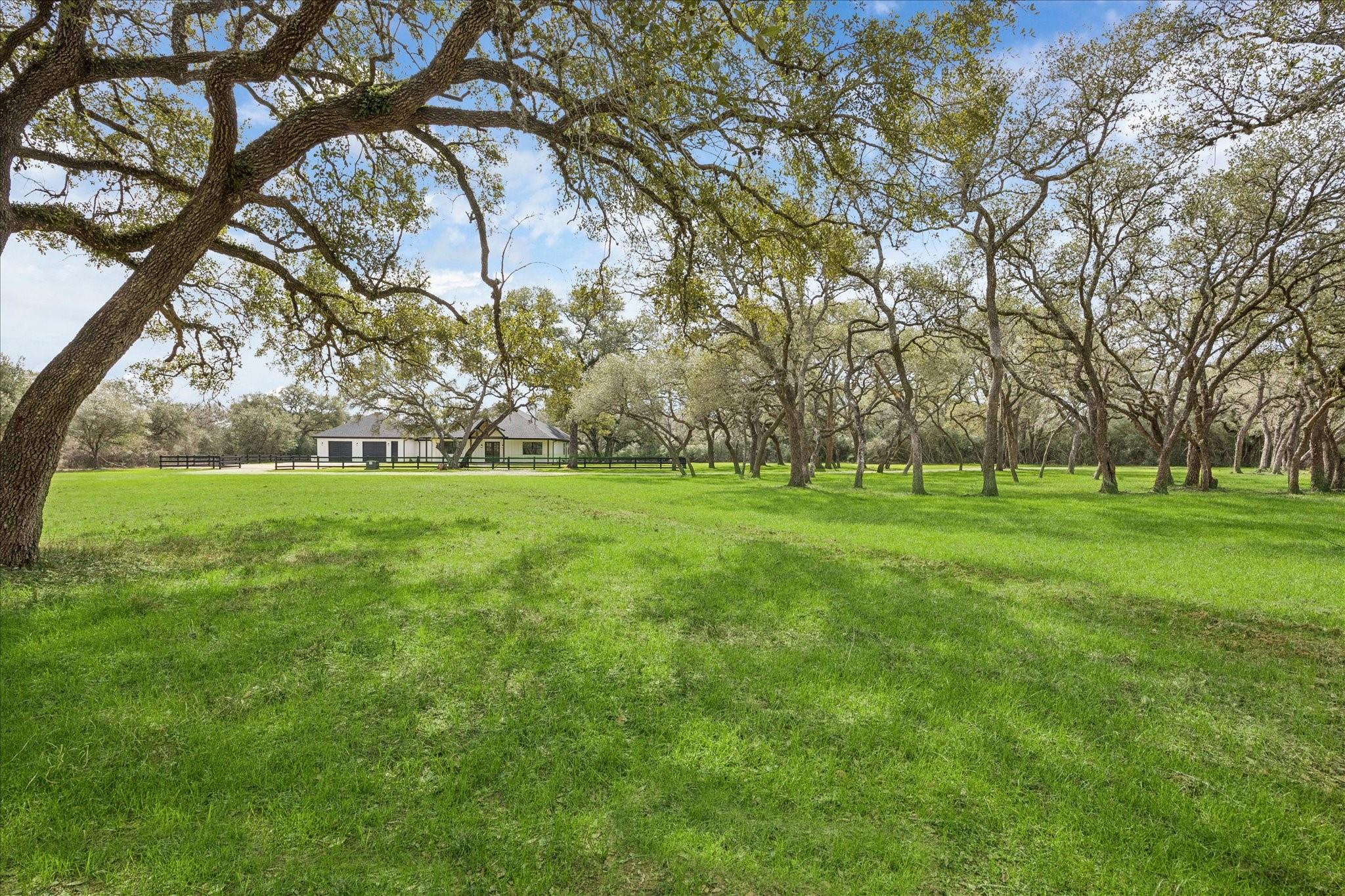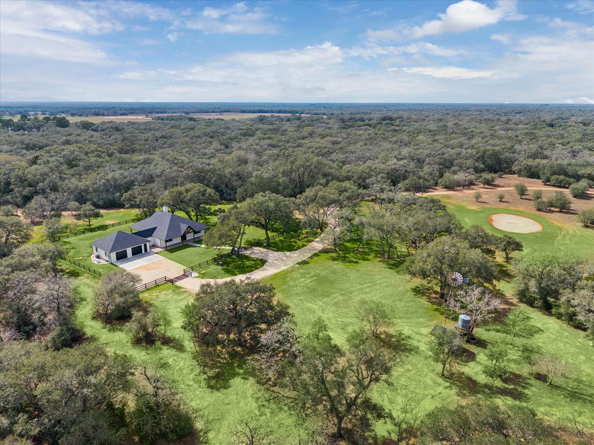 Nestled on 25 private acres at the end of a paved county road, this exceptional property offers peaceful country living surrounded by mature oak trees, abundant wildlife, a newly built pond, irrigation system, and hydro-seeded grass. The 3 bed, 3 bath home features 3,155 square feet of living space plus a 1,225-square-foot oversized garage (4,380 square feet total slab). Exterior highlights include soffit lighting, a whole-house Generac generator, and a 500-gallon in-ground propane tank, and on-demand gas water heater. Inside, you’ll find luxury vinyl flooring, custom cabinetry, and leathered Taj Mahal quartzite. The primary suite offers a custom makeup area with lighted mirror and a hidden safe door. The oversized garage includes 10-foot ceilings, a ceiling-mounted lift, oversized attic access, smart siding interior walls, and a water softener—making this property a rare blend of luxury, functionality, and serene acreage living. Message agent for FULL list of amenities and upgrade