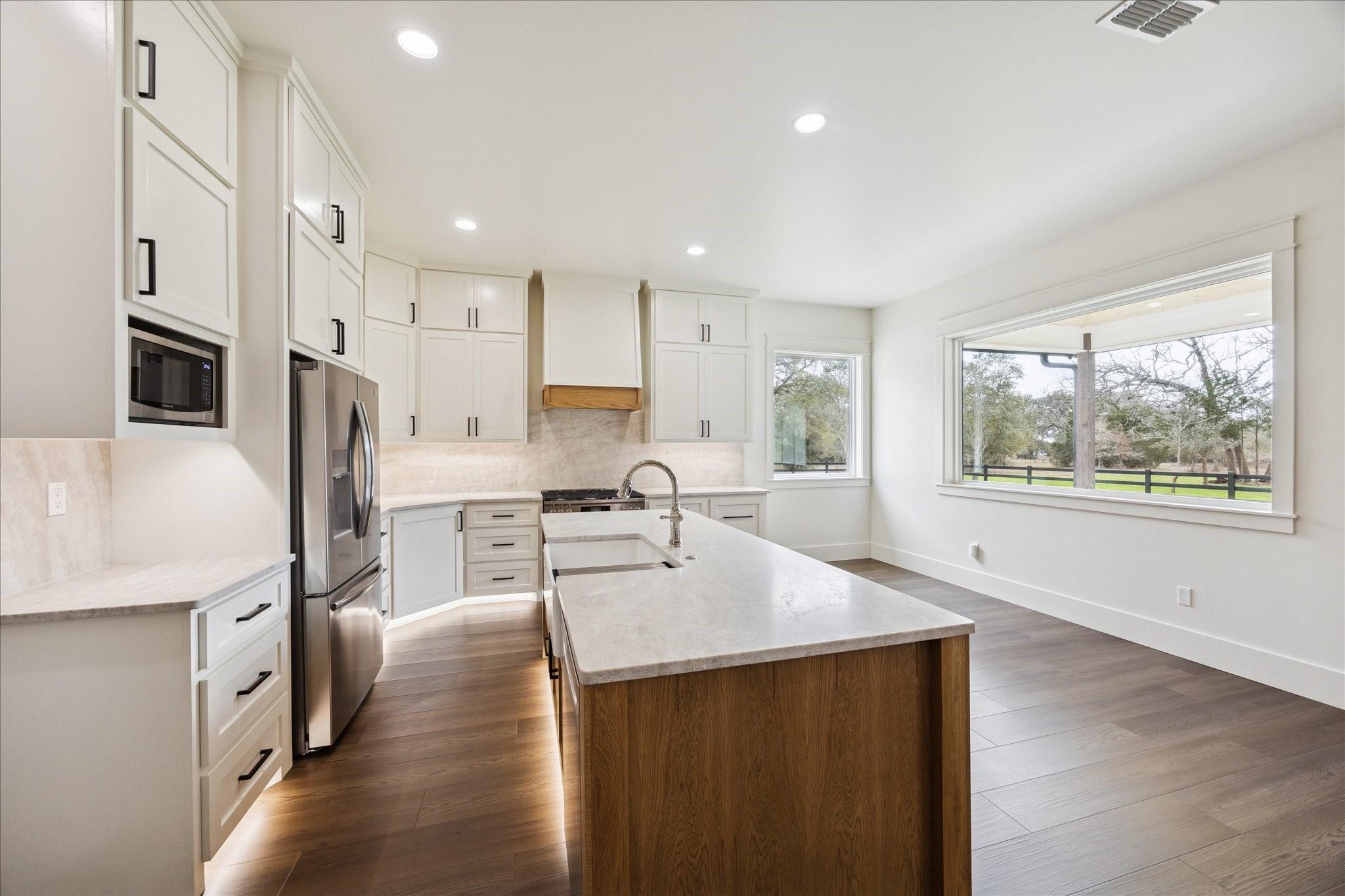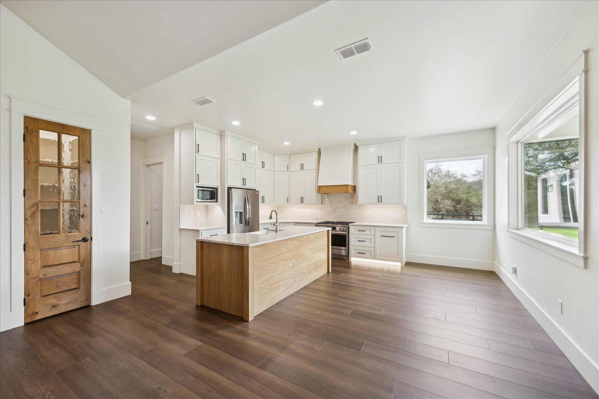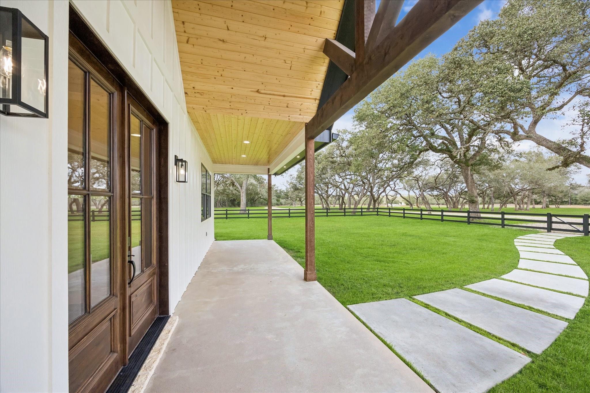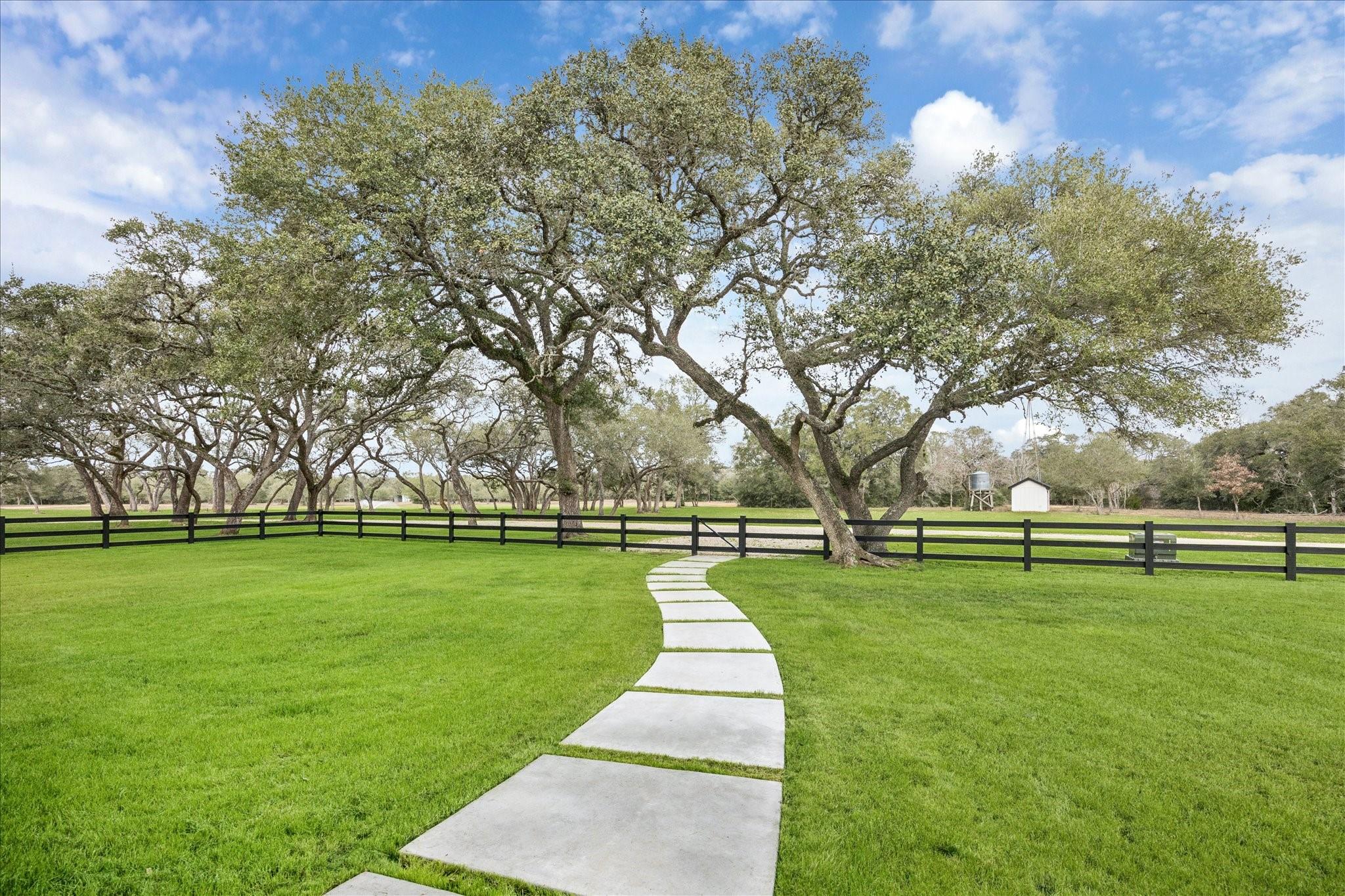 Nestled on 25 private acres at the end of a paved county road, this exceptional property offers peaceful country living surrounded by mature oak trees, abundant wildlife, a newly built pond, irrigation system, and hydro-seeded grass. The 3 bed, 3 bath home features 3,155 square feet of living space plus a 1,225-square-foot oversized garage (4,380 square feet total slab). Exterior highlights include soffit lighting, a whole-house Generac generator, and a 500-gallon in-ground propane tank, and on-demand gas water heater. Inside, you’ll find luxury vinyl flooring, custom cabinetry, and leathered Taj Mahal quartzite. The primary suite offers a custom makeup area with lighted mirror and a hidden safe door. The oversized garage includes 10-foot ceilings, a ceiling-mounted lift, oversized attic access, smart siding interior walls, and a water softener—making this property a rare blend of luxury, functionality, and serene acreage living. Message agent for FULL list of amenities and upgrade