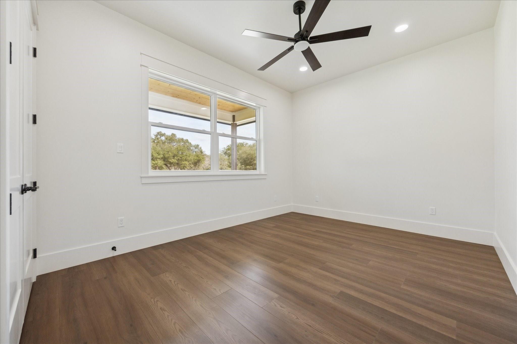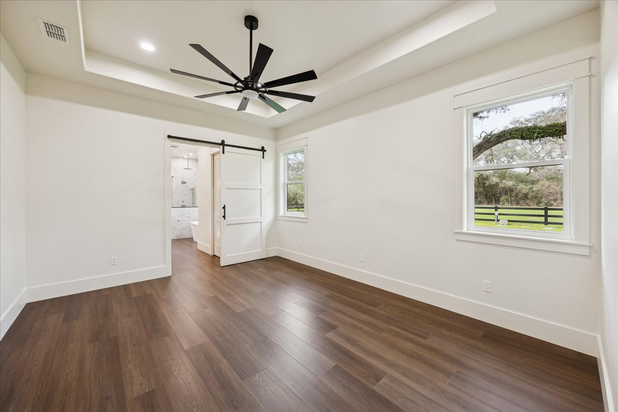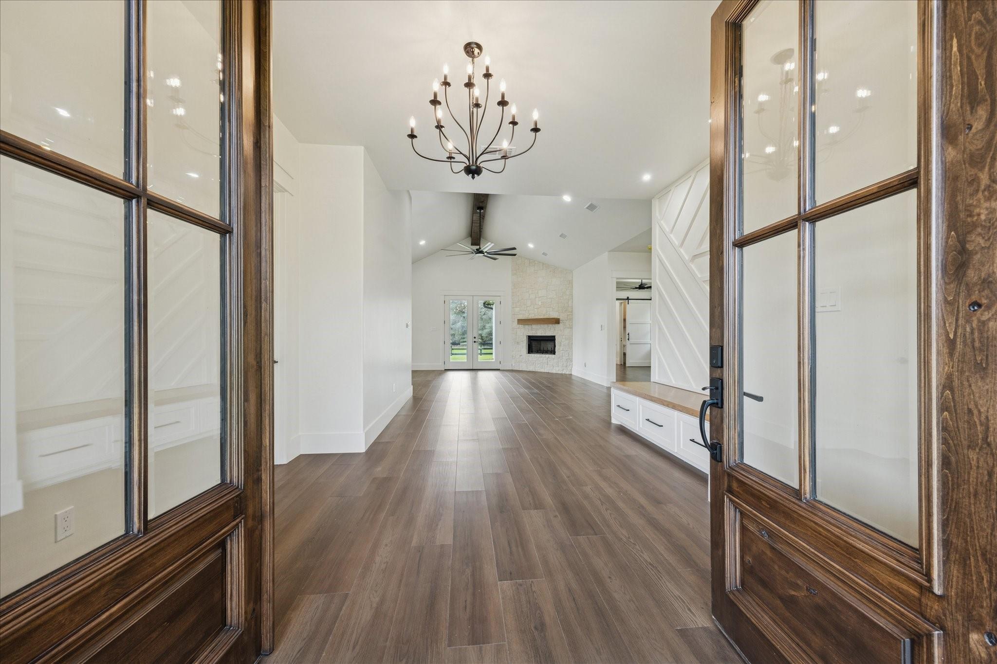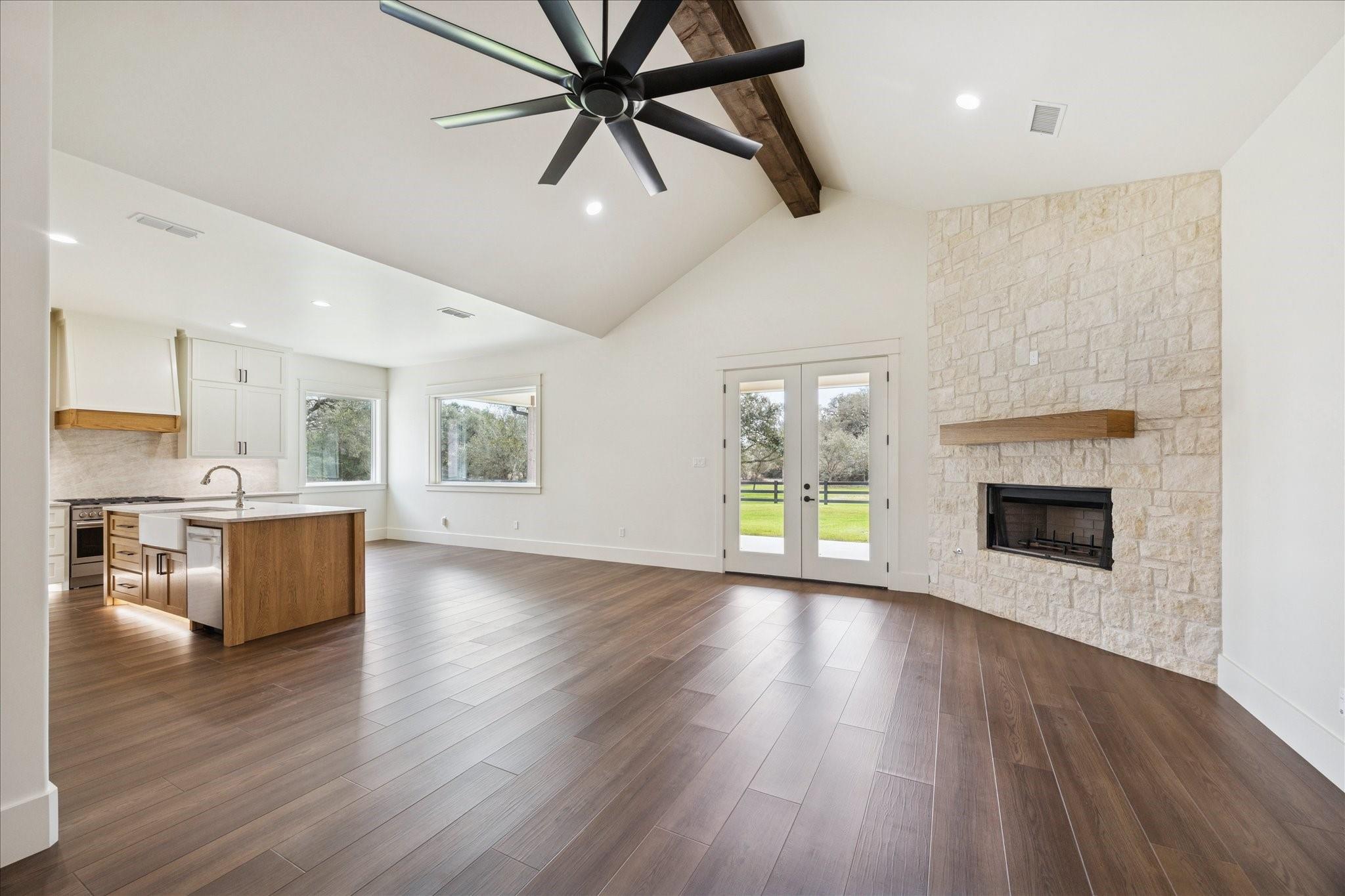 Nestled on 25 private acres at the end of a paved county road, this exceptional property offers peaceful country living surrounded by mature oak trees, abundant wildlife, a newly built pond, irrigation system, and hydro-seeded grass. The 3 bed, 3 bath home features 3,155 square feet of living space plus a 1,225-square-foot oversized garage (4,380 square feet total slab). Exterior highlights include soffit lighting, a whole-house Generac generator, and a 500-gallon in-ground propane tank, and on-demand gas water heater. Inside, you’ll find luxury vinyl flooring, custom cabinetry, and leathered Taj Mahal quartzite. The primary suite offers a custom makeup area with lighted mirror and a hidden safe door. The oversized garage includes 10-foot ceilings, a ceiling-mounted lift, oversized attic access, smart siding interior walls, and a water softener—making this property a rare blend of luxury, functionality, and serene acreage living. Message agent for FULL list of amenities and upgrade