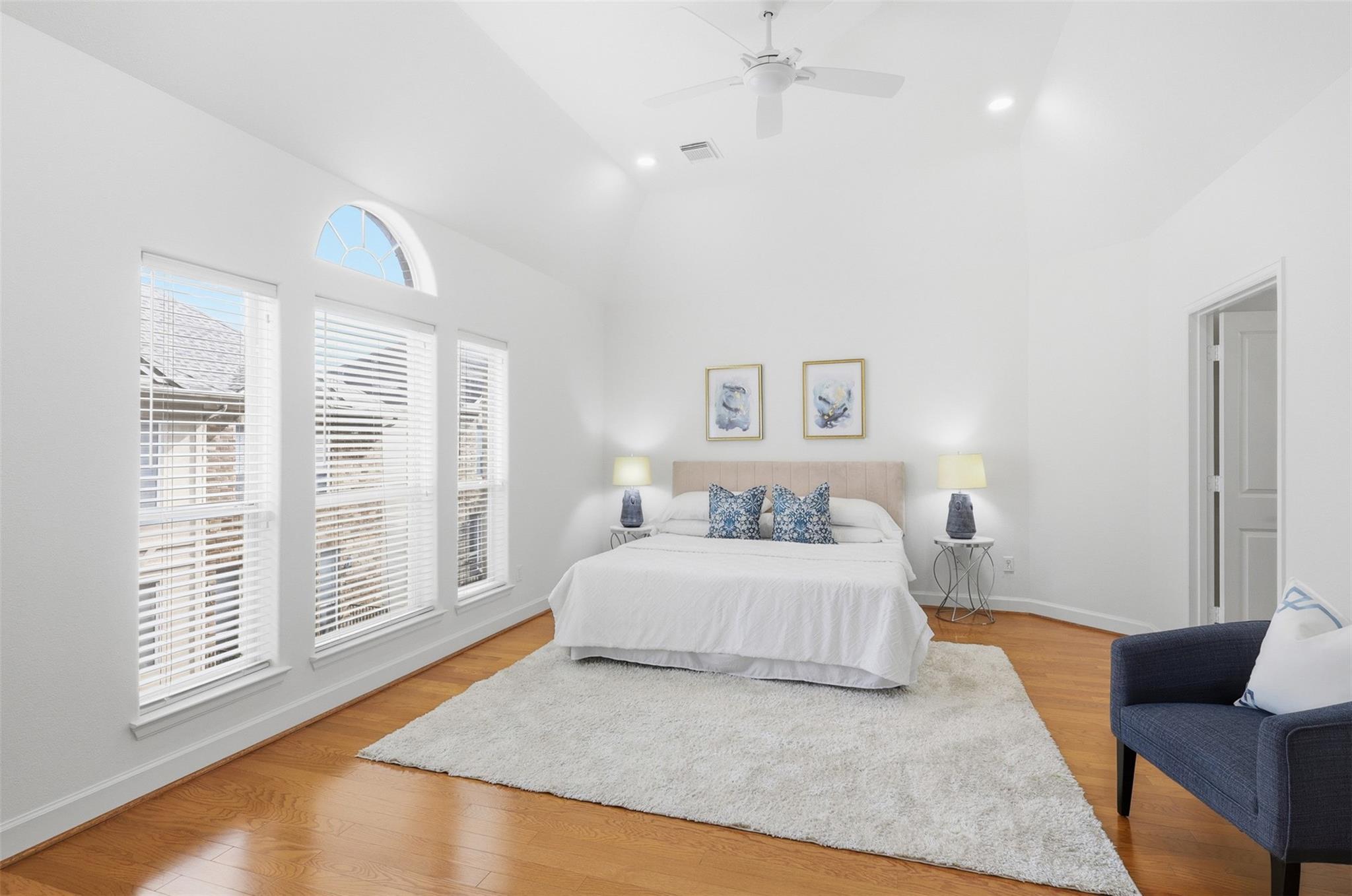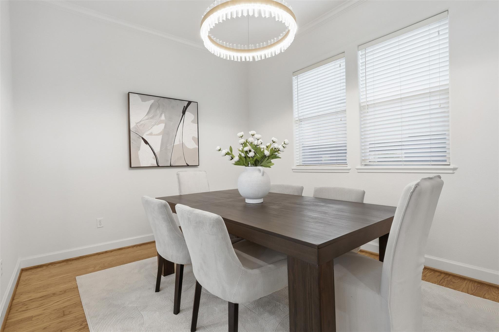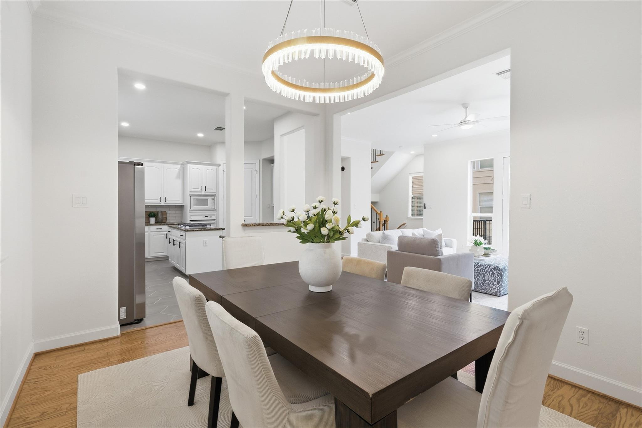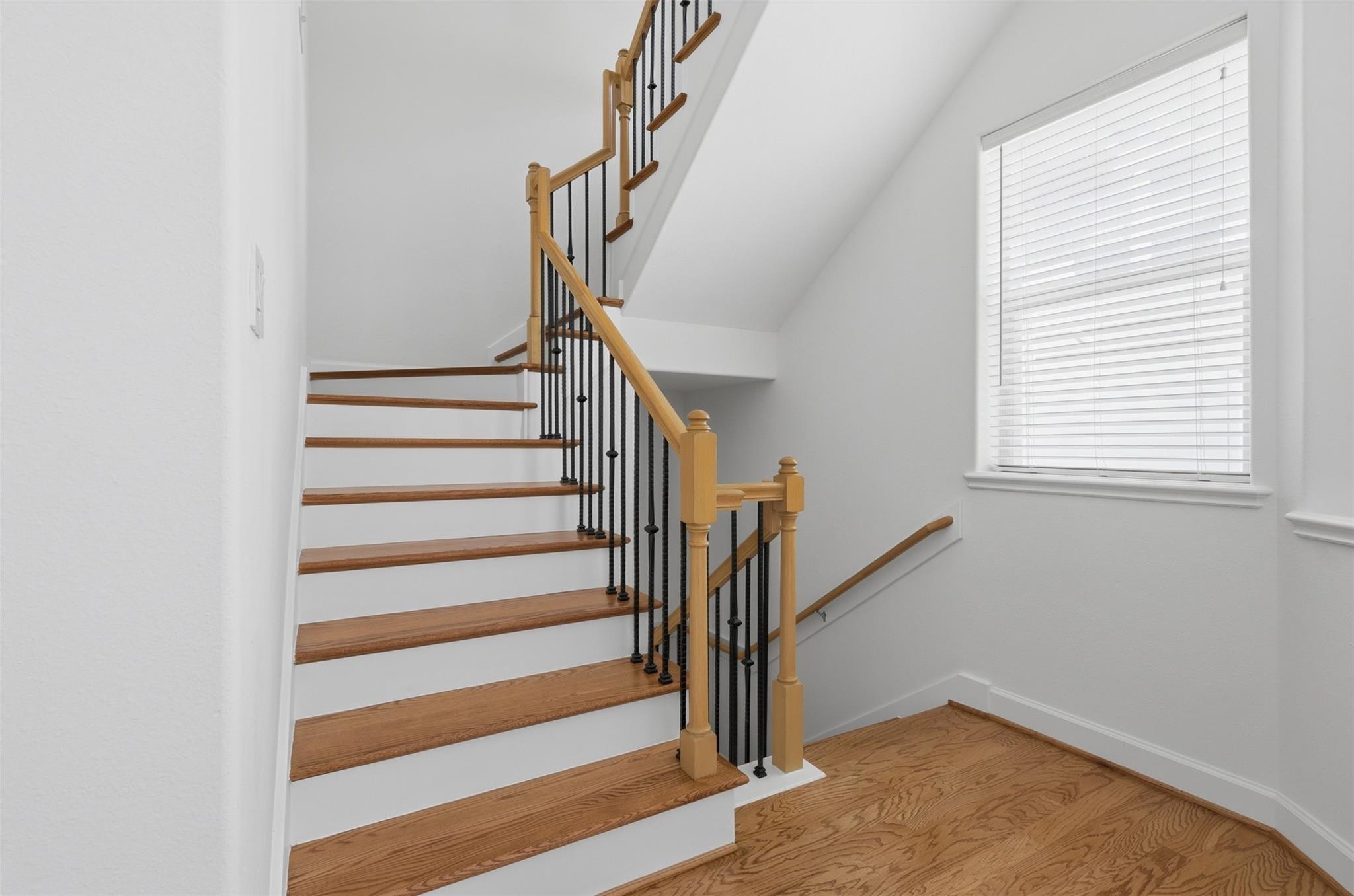 LOCATION! Elegant three story townhome just blocks from Memorial Park in a convenient location with quick access to all freeways and minutes from Downtown, Midtown, & the Galleria. NEW ROOF! Fresh interior paint throughout, updated light fixtures, & recessed lighting. Hardwood floors throughout w/ designer tile in all wet areas. No carpet. High ceilings & an open floor plan create a bright and spacious feel. Large living room features a beautiful gas log fireplace and French doors that open to a private balcony, perfect for relaxing. Spacious kitchen with slab granite countertops and a convenient office nook. First floor includes a bedroom w full bath, ideal for guests. Third floor primary suite offers high ceilings, Jacuzzi tub, separate shower, & large walk in closet. Secondary bedroom also has a full bath. Enjoy abundant natural light from large windows and a stairwell with wrought iron spindles. Nice-sized fenced backyard, perfect for entertaining! Near to parks, dining, and more.