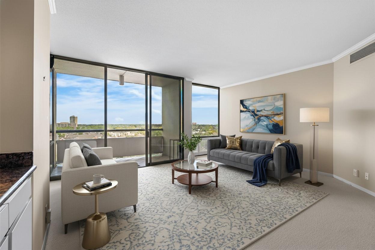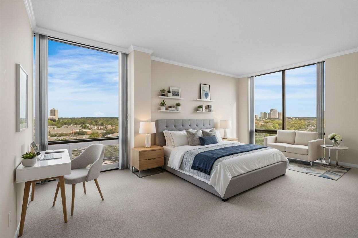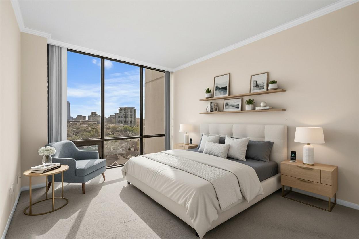 Enjoy breathtaking 10th-floor panoramic views from this beautifully maintained lock-N-leave residence at The St. Clair. This light-filled home offers 2 spacious BDRs and 2 full baths within an open, thoughtfully designed layout ideal for both everyday living & entertaining. The kitchen features granite countertops, upgraded appliances, and a wet bar with wine cooler, complemented by custom built-ins throughout. Elegant details include crown molding, accent lighting, neutral carpeting, tinted windows, and wiring for surround sound and computer networking. The updated primary bathroom adds modern comfort, while the nearly new HVAC provides efficiency and peace of mind. Residents benefit from low monthly maintenance fees and 2 assigned parking spaces. Amenities include: 24-hour concierge, tennis courts, resort-style pool, fitness center, renovated party room with catering kitchen, climate-controlled storage, and on-site dry cleaning. Be sure to view the attached video of the property.