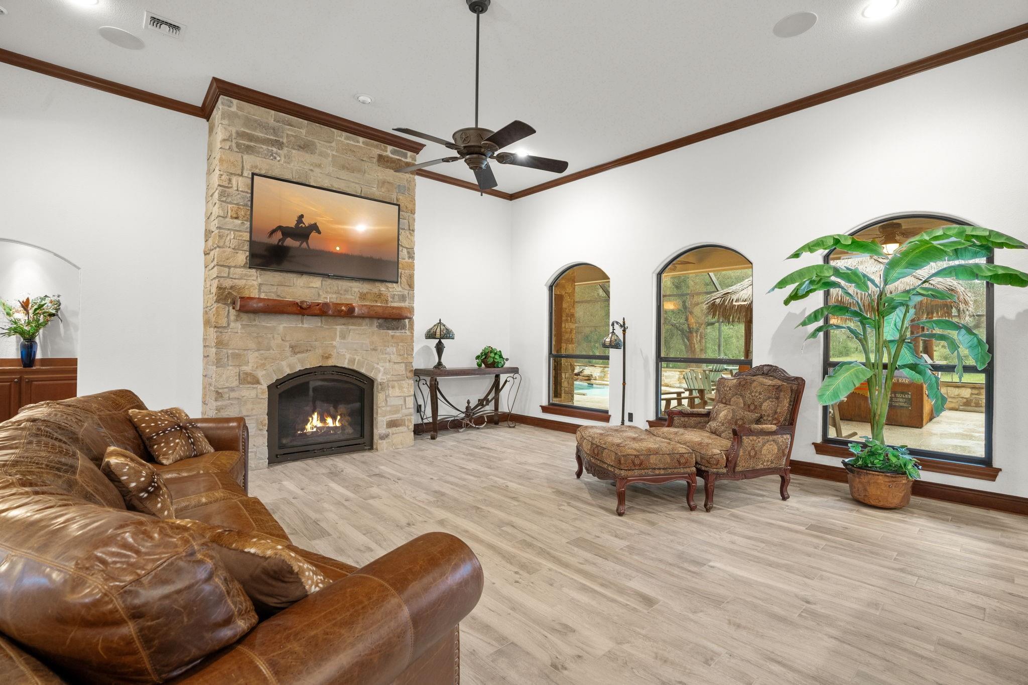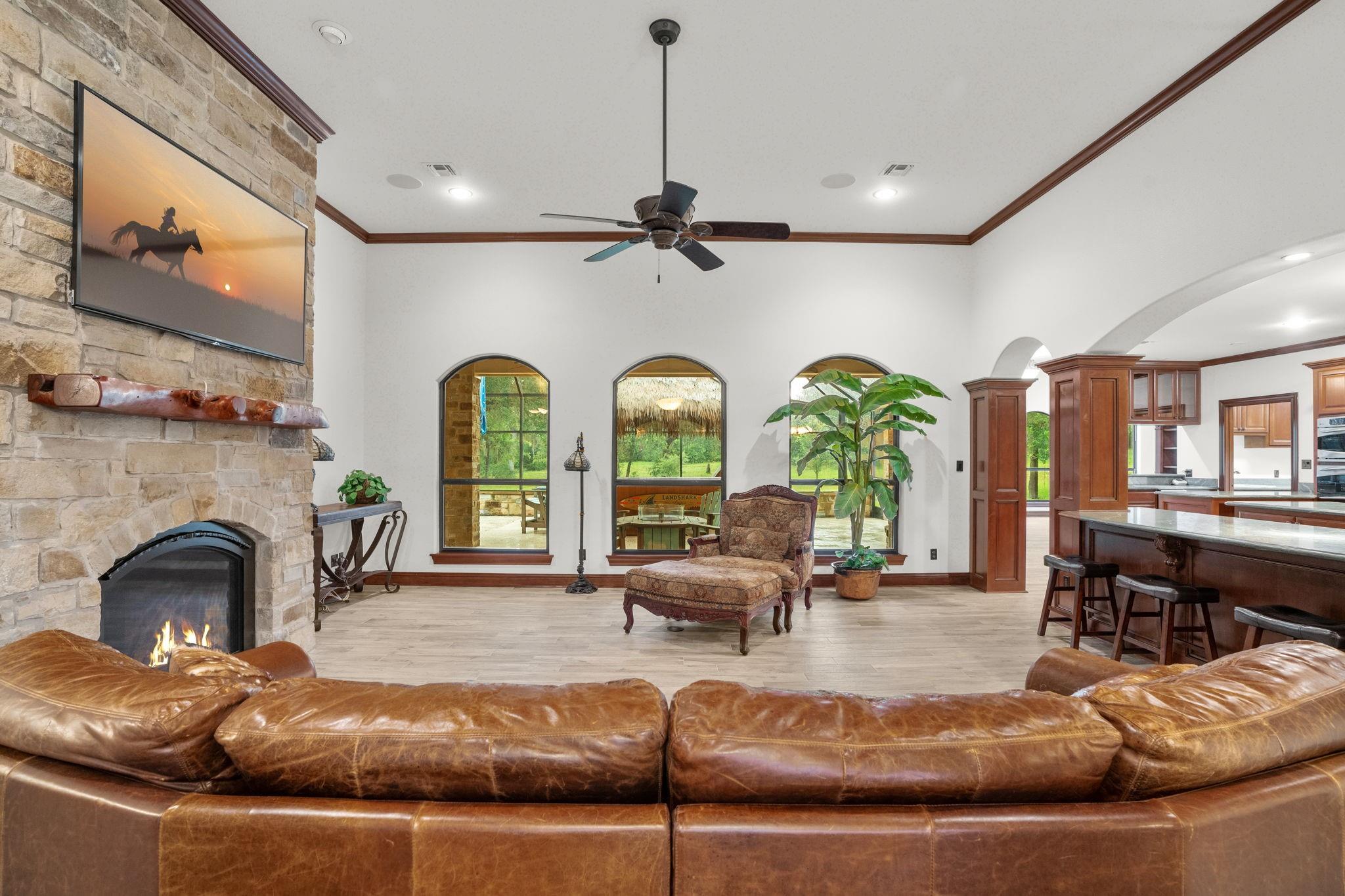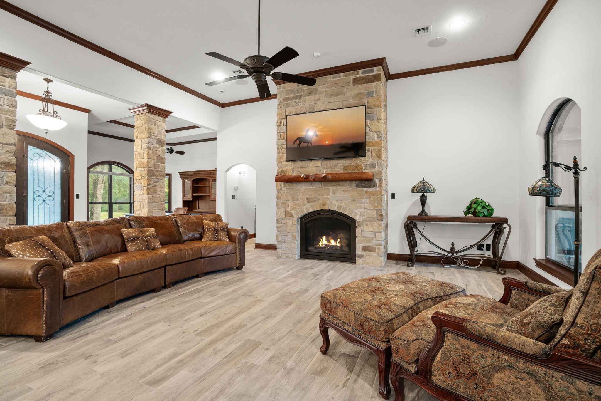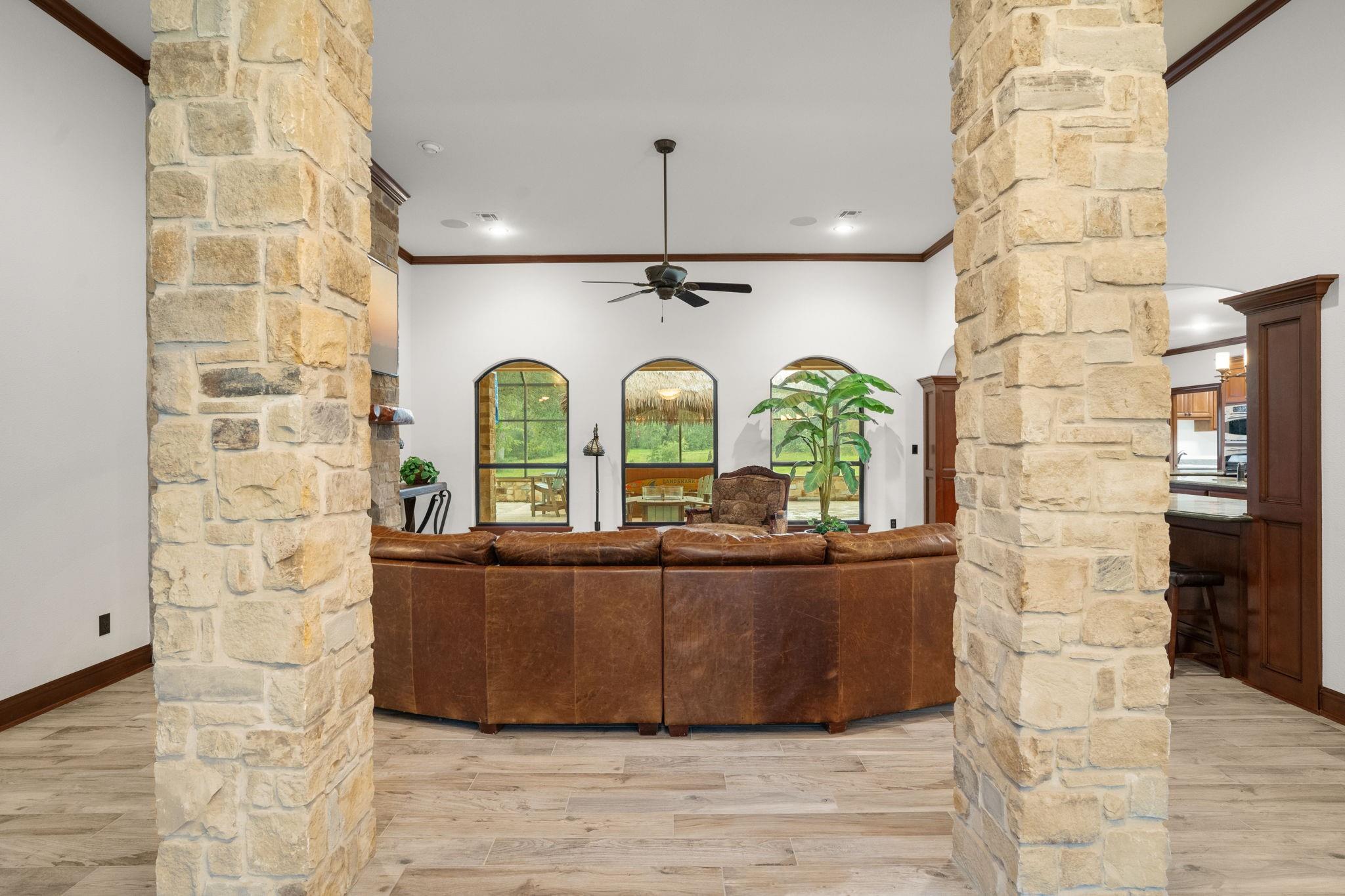 InteriorFireplace:1/Gas Connections,Gaslog FireplaceFloors:Concrete,Engineered WoodCountertop:graniteBathroom Description:Full Secondary Bathroom Down,Primary Bath: Double Sinks,Primary Bath: Jetted Tub,Primary Bath: Separate ShowerBedroom Desc:All Bedrooms DownKitchen Desc:Instant Hot Water,Island w/o Cooktop,Kitchen open to Family Room,Pantry,Pots/Pans Drawers,Second SinkRoom Description:Den,Formal Dining,Garage Apartment,Home Office/Study,Kitchen/Dining Combo,Living Area - 1st Floor,Quarters/Guest House,Utility Room in HouseHeating:Central Gas,PropaneCooling:Central ElectricConnections:Gas Dryer Connections,Washer ConnectionsDishwasher:YesMicrowave:YesRange:Gas CooktopOven:Convection Oven,Double OvenIce Maker:YesEnergy Feature:Ceiling Fans,Tankless/On-Demand H2O HeaterInterior:Crown Molding,High Ceiling,Refrigerator Included,Wet Bar