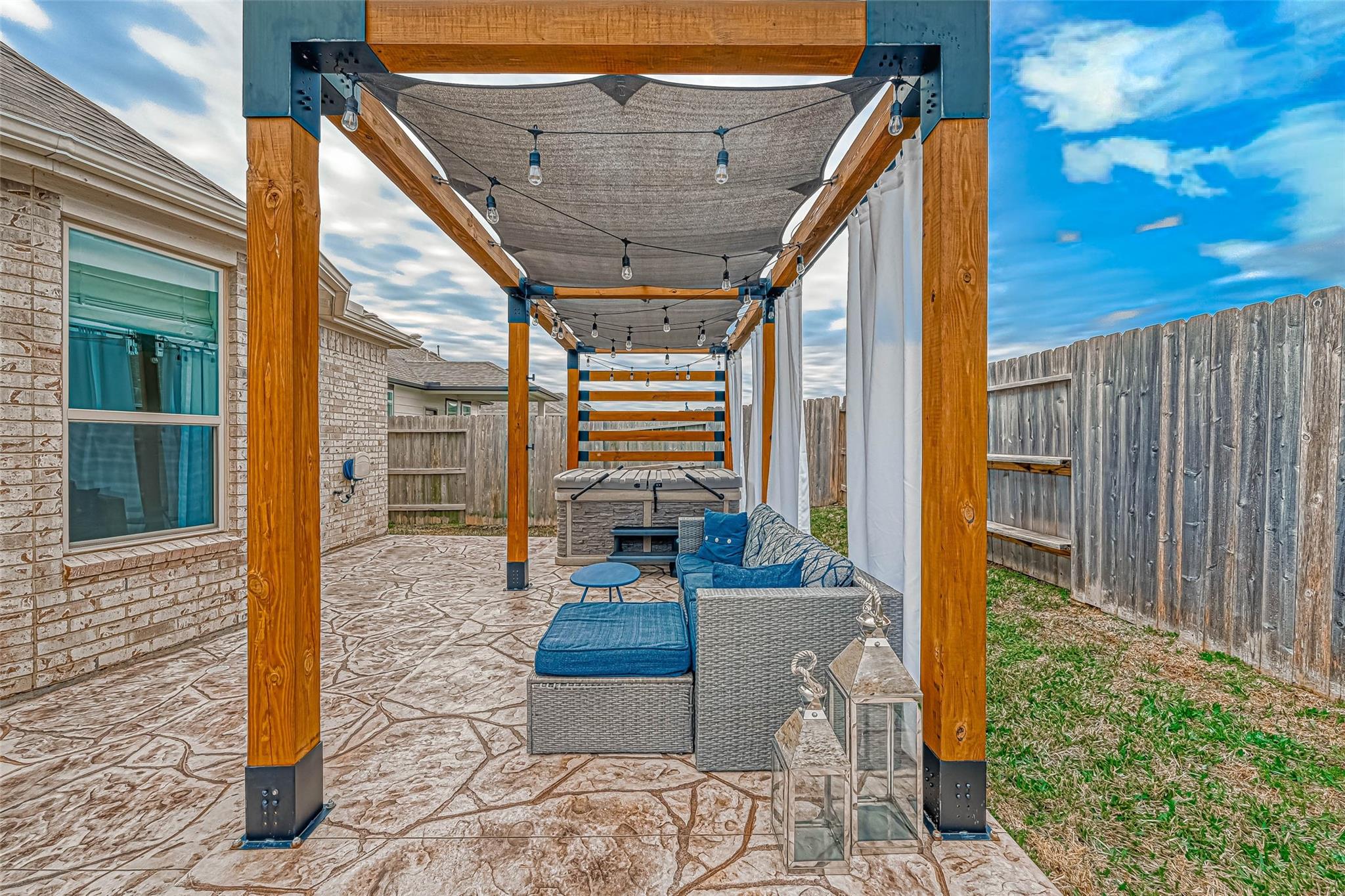 ExteriorRoof:Wood ShingleFoundation:SlabPrivate Pool:NoExterior Type:Brick,Cement BoardLot Description:Subdivision LotWater Sewer:Public Sewer,Public WaterArea Pool:YesExterior:Back Yard,Back Yard Fenced,Covered Patio/Deck,Exterior Gas Connection,Spa/Hot Tub,Sprinkler System