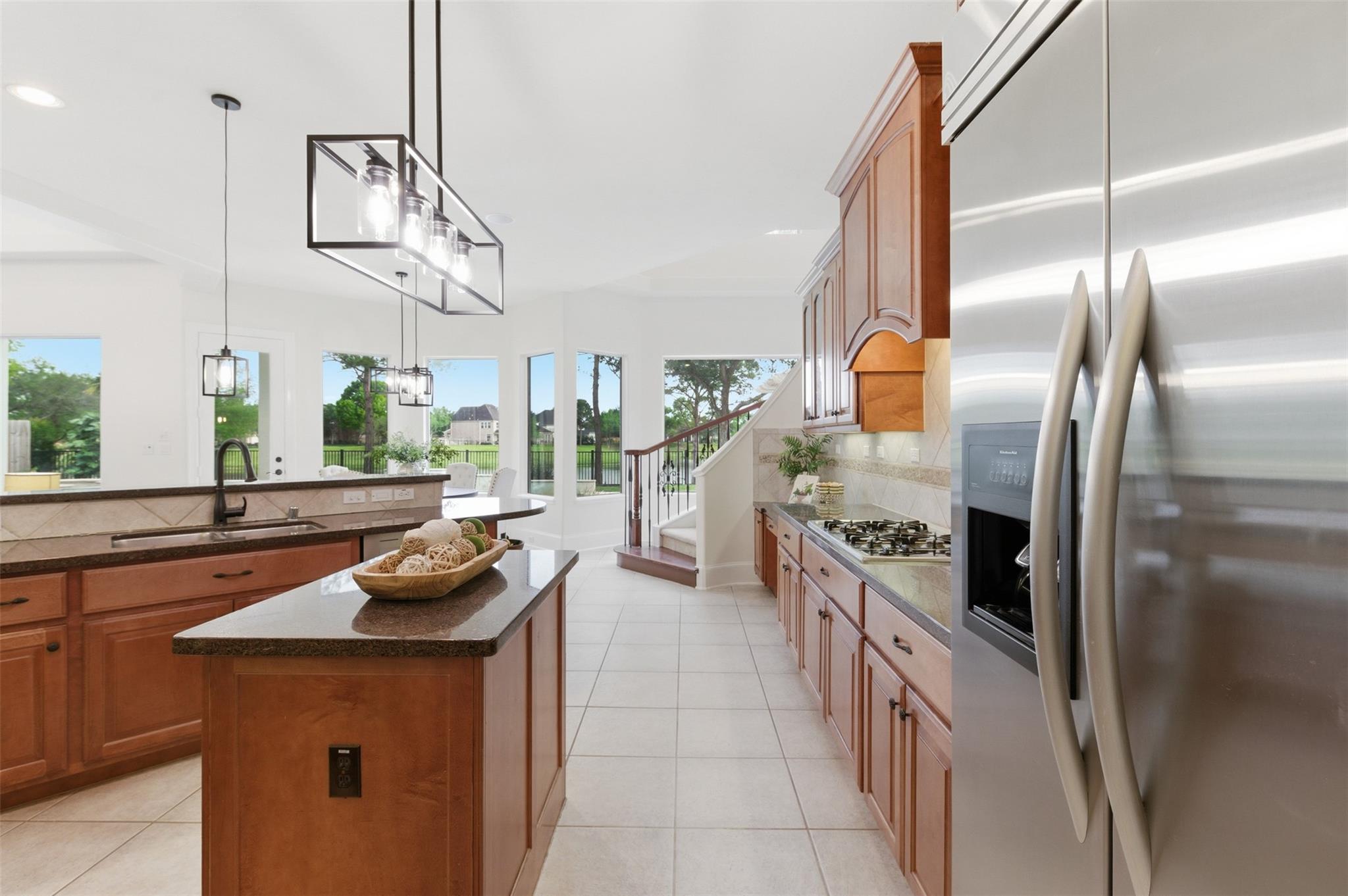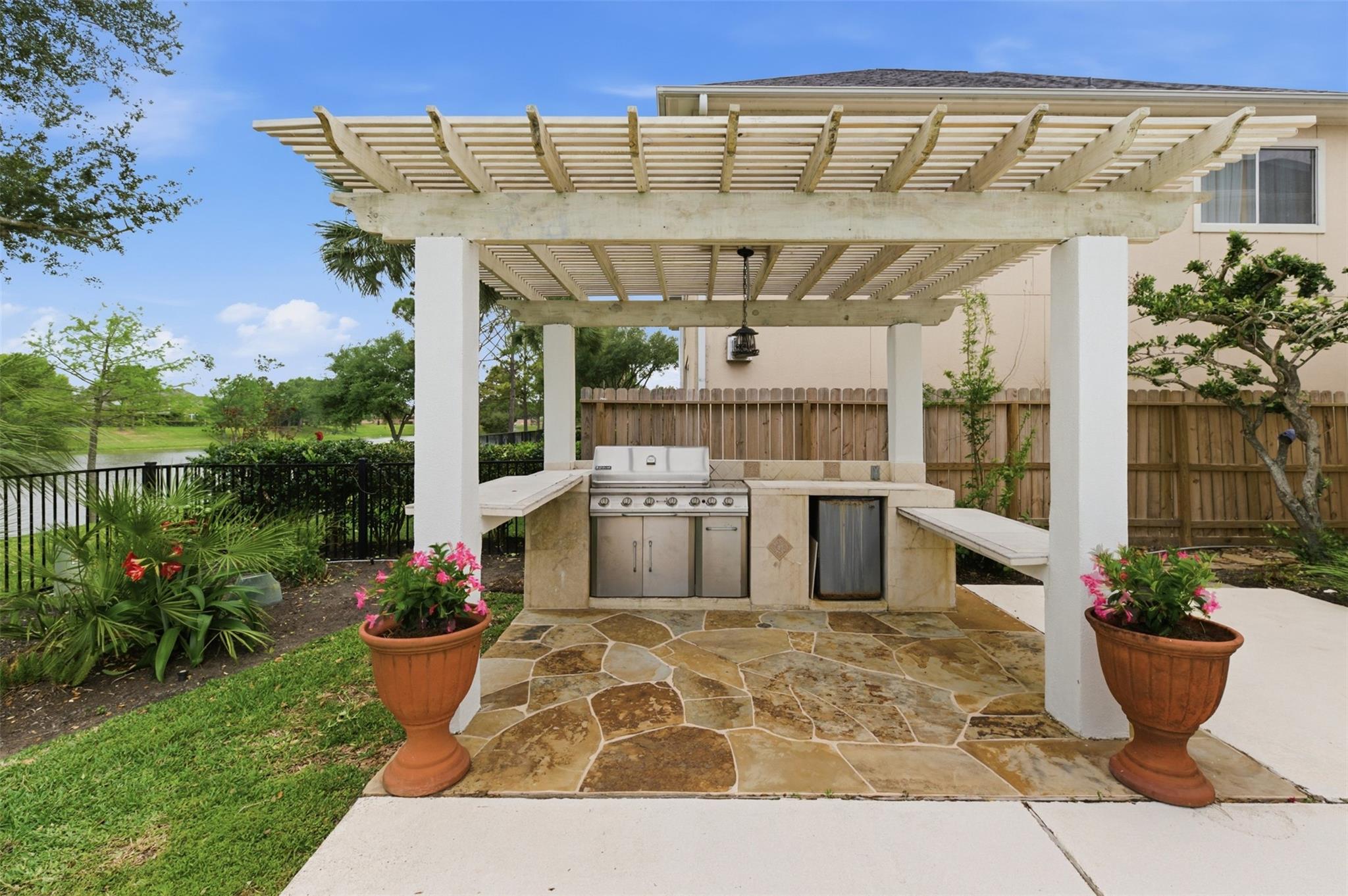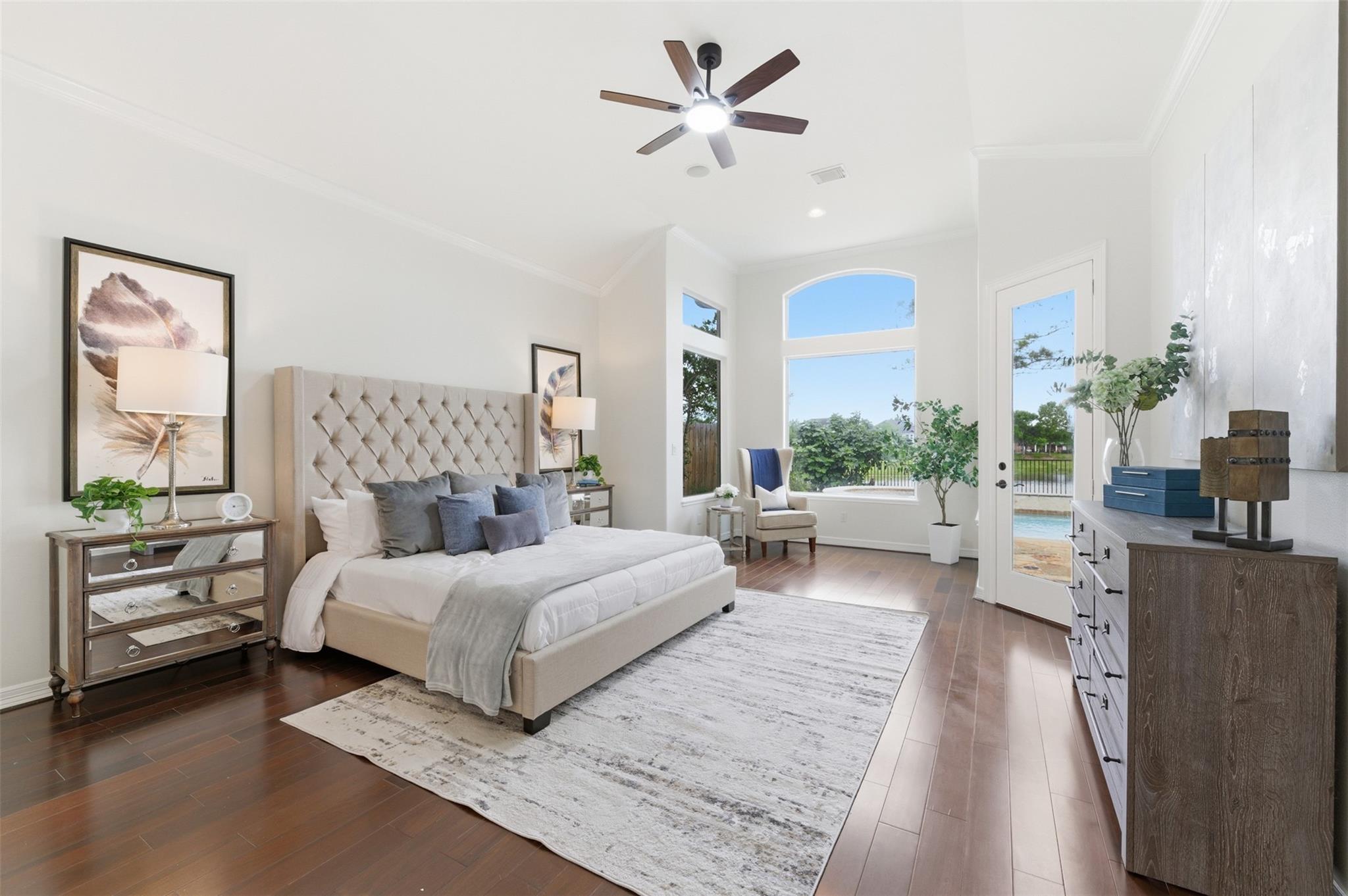 Super rare opportunity in one of Shadow Creek Ranch’s most sought-after enclaves, The Island - featuring beautiful semi-custom homes on large lakefront estate lots. Homes don't come on the market in here very often. This elegant stucco residence offers soaring ceilings, abundant natural light and an open-concept layout ideal for entertaining. The study showcases floor-to-ceiling built-ins, while the flexible plan includes a rare first-floor secondary bedroom with full en-suite bath. The primary suite features a sitting area, backyard access and serene views. Step outside to your private oasis and relax in the pool or hottub while enjoying the breathtaking TX sunset over the lake. Upstairs, you will find a game room, two bedrooms connected by a jack-n-jill bathroom and aother flex-room that can be used as a bedroom or a number of other uses. The upstairs balcony also offers yet another tranquil space. Move-in ready with easy access to highways, shopping, dining, and top-rated schools.