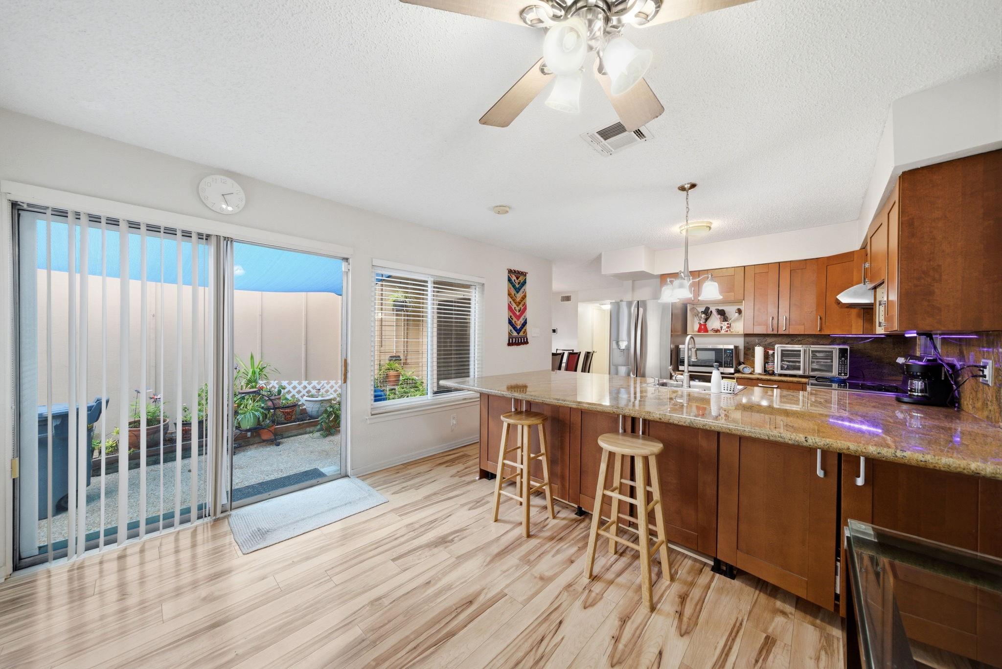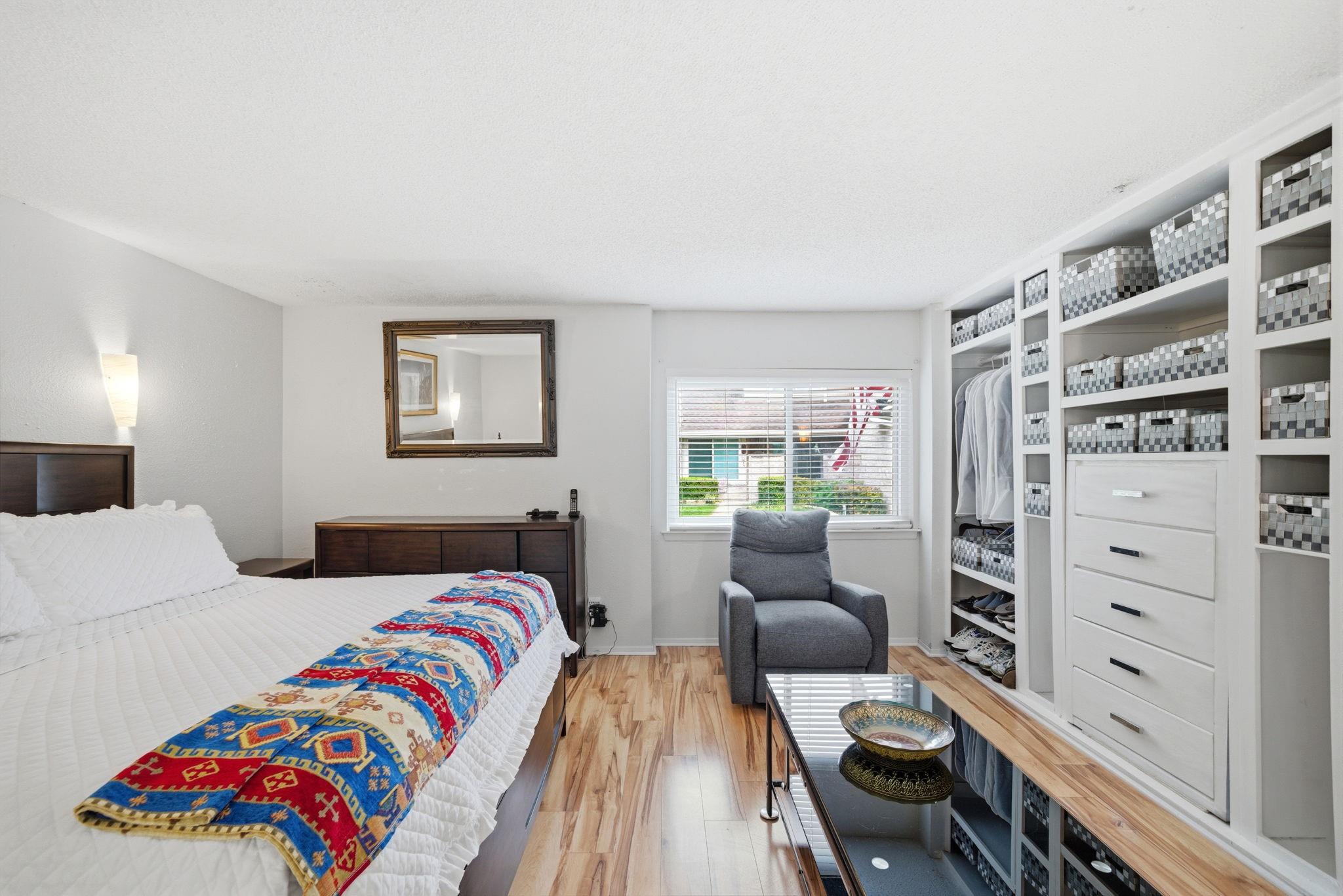 This beautifully updated 2 bed/2 bath townhome offers functional plan paired with an array of desirable features. The living room showcases soaring 2-story vaulted ceilings accented by shiplap details & neutral laminate wood floors throughout. The spacious 1st floor primary is warm & inviting featuring a custom closet with added cabinetry & ensuite bath with dual sinks. The kitchen is thoughtfully designed with SS appliances, ample storage, & a breakfast bar opening to a breakfast nook, along with a generous formal dining area. Upstairs a versatile office/bonus space leads to the second bedroom with full bath conveniently located down the hall. Enjoy outdoor living in the spacious patio with deck connecting to an oversized 2-car garage. With a full-size utility area located within the half bath & a charming gated front porch from a lush, green courtyard. Ideally situated near shopping, dining, grocery stores & Beltway 8, this home offers both comfort & convenience for easy commuting.