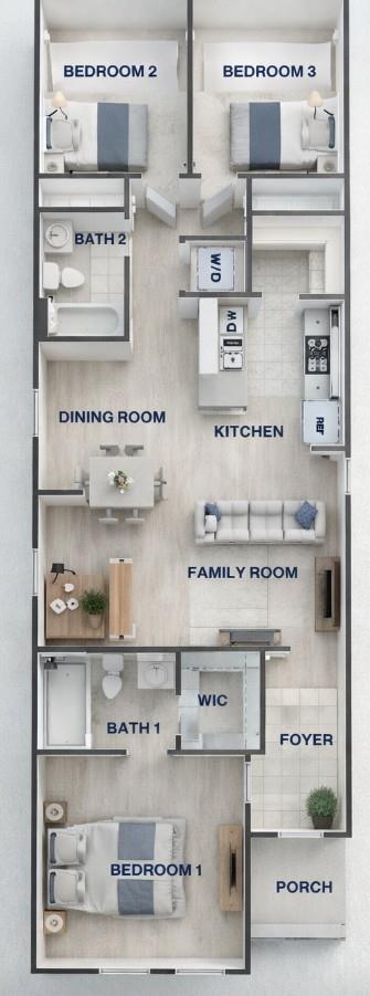 Step inside through the inviting Wyeth into a spacious family room that flows seamlessly into the dining area and kitchen perfect for entertaining and everyday living. The kitchen offers a central island, ample cabinet space, and a layout that keeps everyone connected. The private primary suite (Bedroom 1) is tucked away at the rear of the home and features a walk-in closet and an en-suite bath for added comfort and privacy. Two additional bedrooms are positioned on the opposite side of the home with a shared full bath ideal for family, guests, or a home office setup. Enjoy indoor outdoor living with a covered patio, perfect for relaxing evenings, morning coffee, or weekend gatherings.
