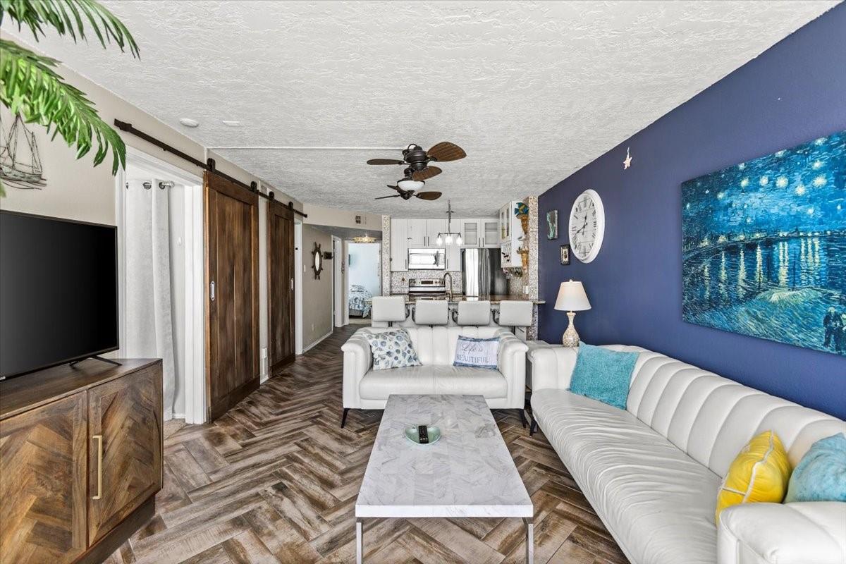 Experience coastal living at its finest in this stunning beachfront condo, perfectly positioned on a sought-after west corner. Step inside to discover beautiful herringbone-patterned faux wood tile flooring that flows seamlessly through the living room, kitchen, and baths. The modern ceiling texture adds a fresh, updated touch throughout. The gourmet kitchen is a showstopper, featuring sleek granite countertops, elegant tiled walls, soft-close cabinetry, stainless steel appliances, and a built-in wine cooler—ideal for entertaining or relaxing in style. Custom handmade sliding barn doors add charm and character as they welcome you into the serene master suite and the second bath. Both the master and third bedrooms, along with the spacious living area, open up to private balconies that showcase breathtaking views of the beach and Gulf—your personal front-row seat to every sunset.