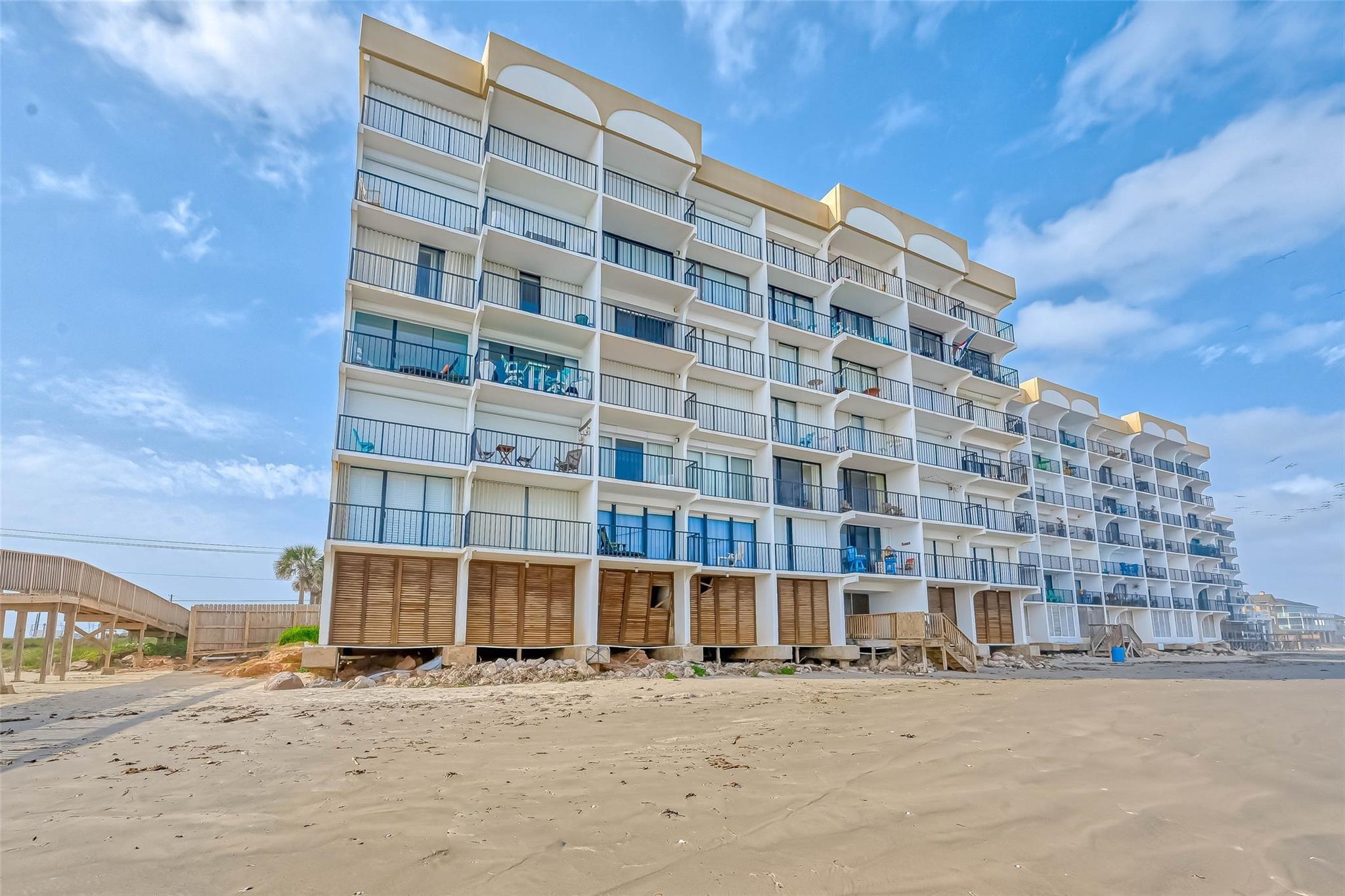 WOW Beautiful, fully furnished, two-bedroom, two bath condo located on the 2ND floor of the Riviera Condos, an oceanfront, mid-rise condo building w/ 7 floors & 18 units. This building is located behind a private gate & offers a beautiful, quiet beach w/ fabulous views. Discover beach living at its finest, priced to sell at just $185,000! The condo is gorgeous inside w/ ceramic tile floors, beautiful light & bright kitchen & floor to ceiling glass doors that open to a private balcony that runs outside the main living area & the primary bedroom overlooking the ocean from both the living area and primary suite. The unobstructed beach & ocean views are stunning. Additional building features include private beach access to residents, well maintained grounds, elevator access, central laundry, storage units and a beach rinse station. The location is great w/ close proximity to Moody Gardens, Moody Golf Course & Schlitterbahn. Galveston's historic strand is less than 10 miles away.