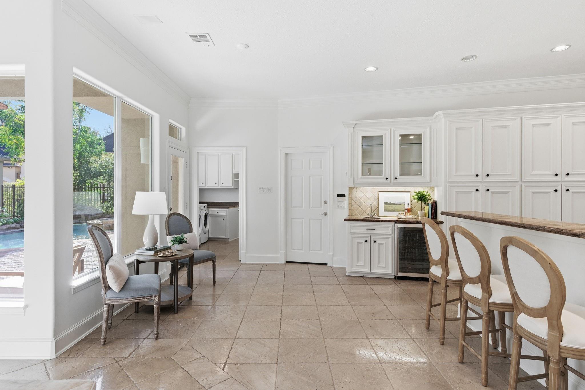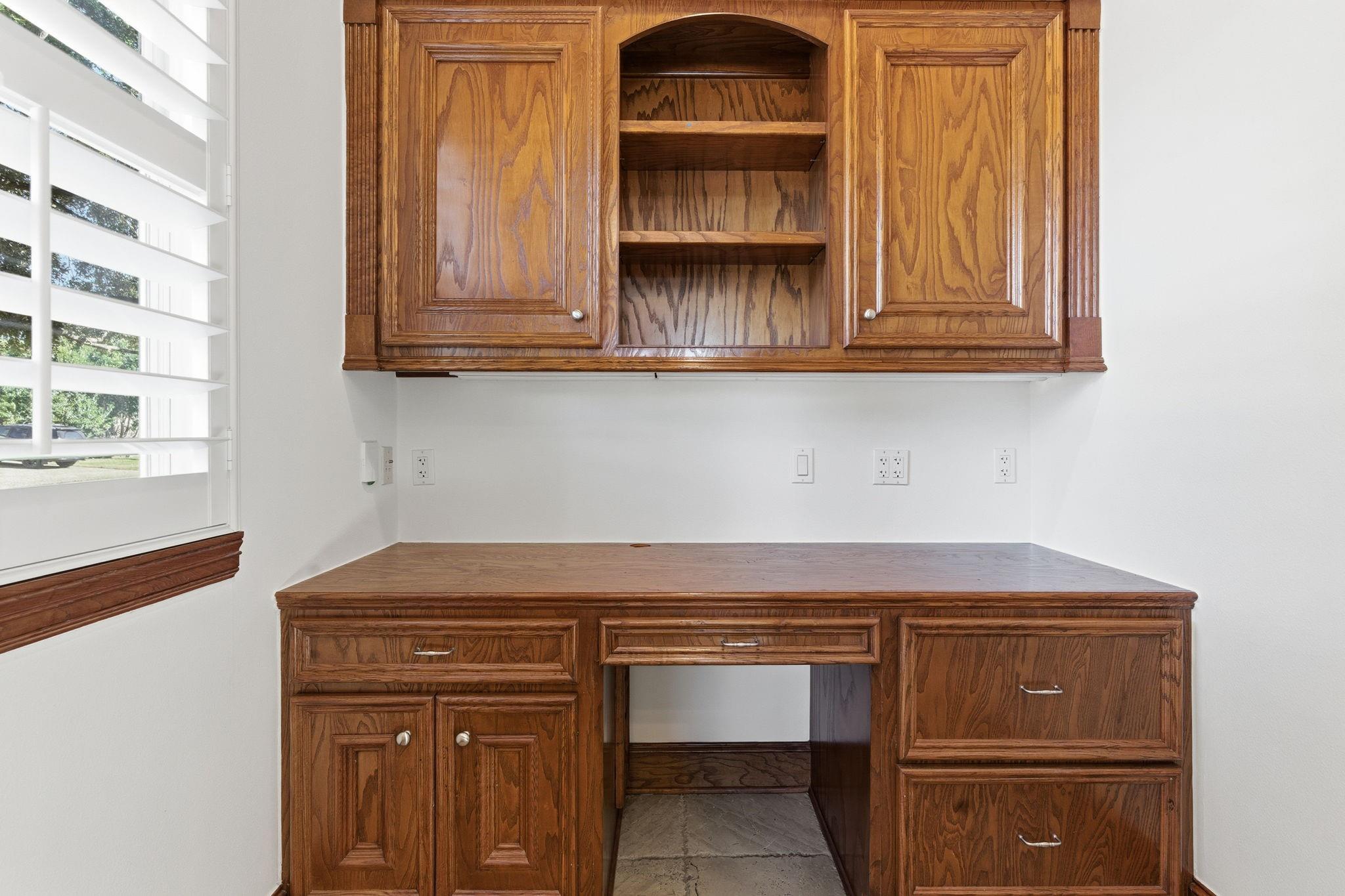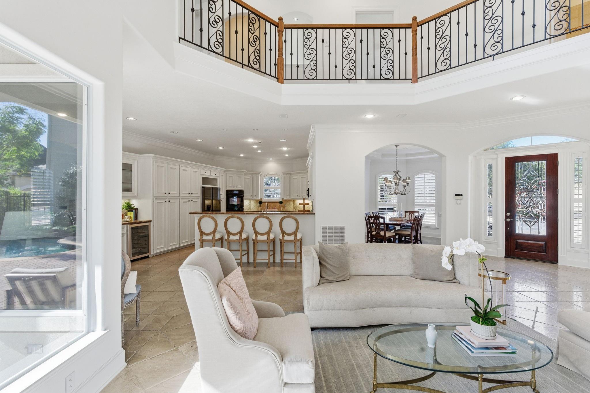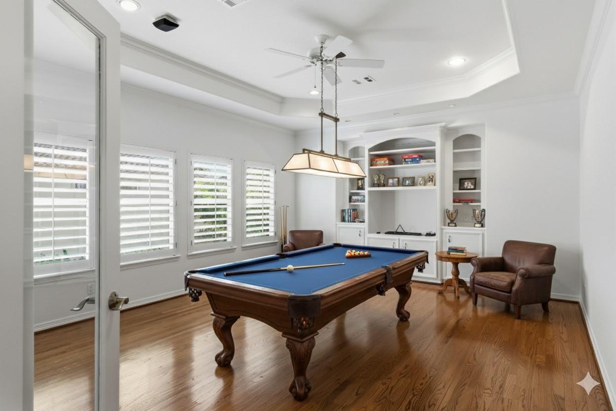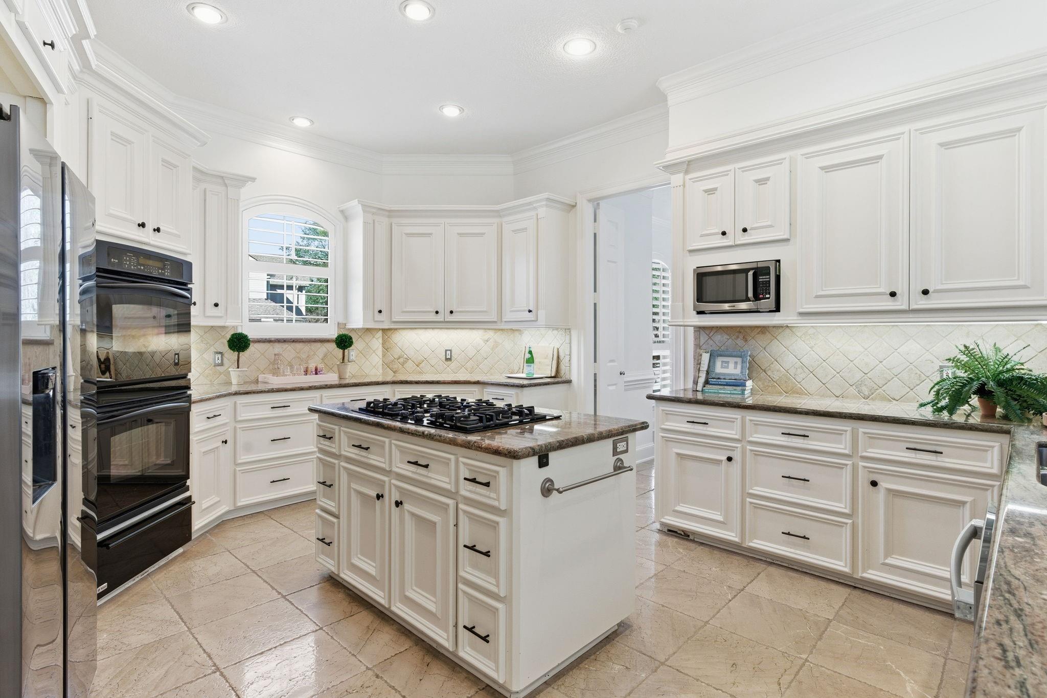 Step inside this charming 5 bed, 3.5 bath home in the Energy Corridor! The island kitchen features stone floors, granite counters w/ tile backsplash, gas cooktop, double electric ovens, built-in microwave, built-in pantry, eat-in breakfast bar, under cabinet lighting & SS refrigerator. The island kitchen is open to the family room which has high ceilings, built-in entertainment nook, gas-log fireplace, wet bar w/ mini wine fridge & views of the backyard. The primary suite is on the 1st floor w/ built-ins, tray ceilings, plantation shutters, a ceiling fan & views of the backyard. There are stone floors, double sinks, granite counters, walk-in closet, over sized jetted soaking tub & separate standing shower w/ tile surround in the primary bath. All secondary bedrooms are upstairs with carpet floors & nice size closets. Other home features include: Gameroom up, central vacuum, sprinkler system, pool/spa with rock fountain, 2 full baths up, corner lot, built-in study nook and so much more!