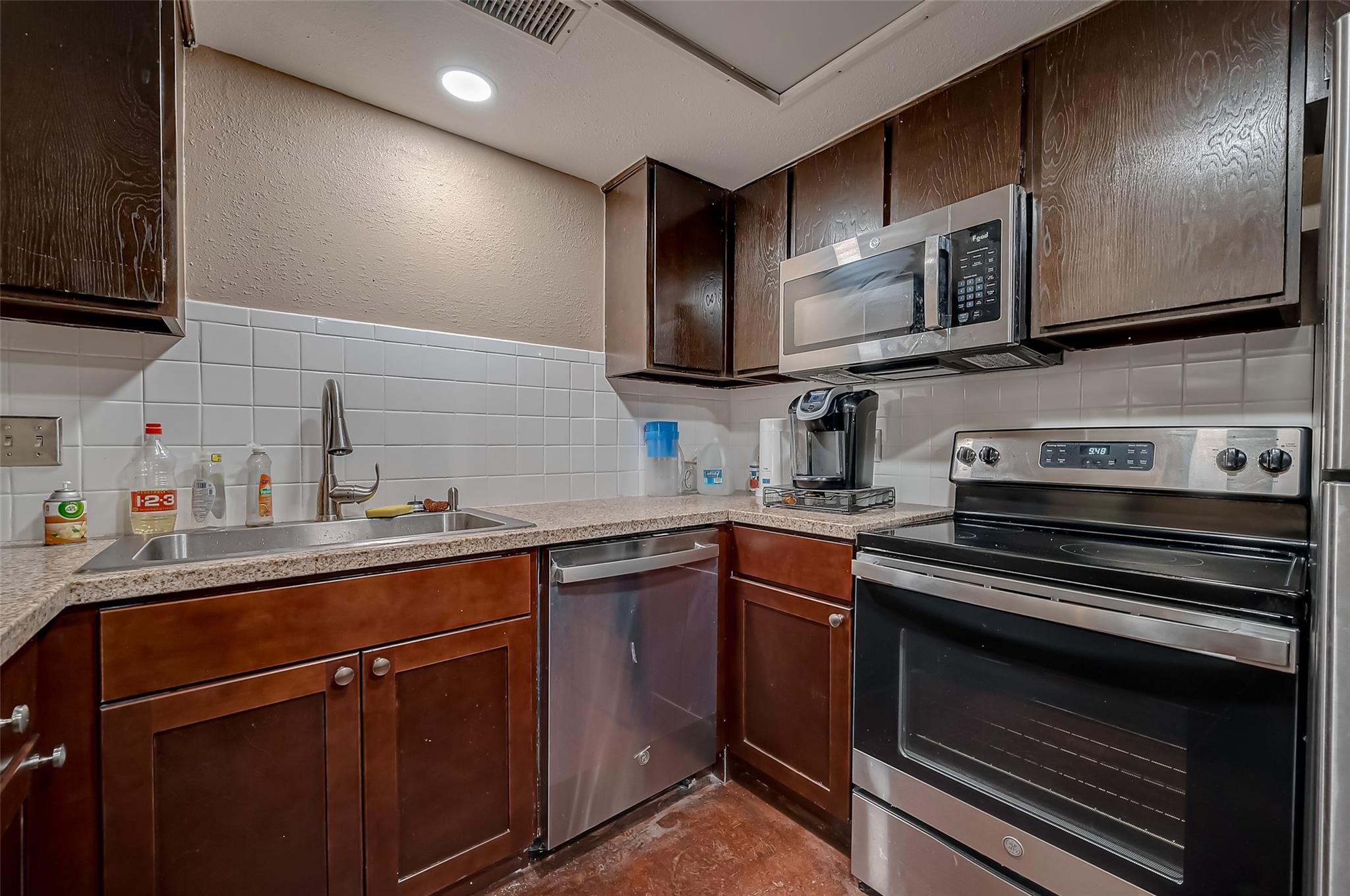 Re-imagined home boasts luxe updates such as glass tile countertops, stainless steel appliances, European tilt & turn argon-filled double pane windows and vinyl plank flooring. Bathrooms are breathtaking, exuding elegance and the primary features a floating European commode. Recent updates include flooring, windows, kitchen cabinets, light fixtures, AC system, roof, fence, and side-paneling among others. Community also boasts clubhouse with amenities and a pool! Sought after schools are walking distance! If you have discerning taste; look no further; it's time to see 12042 Mighty Oak #B in person!!