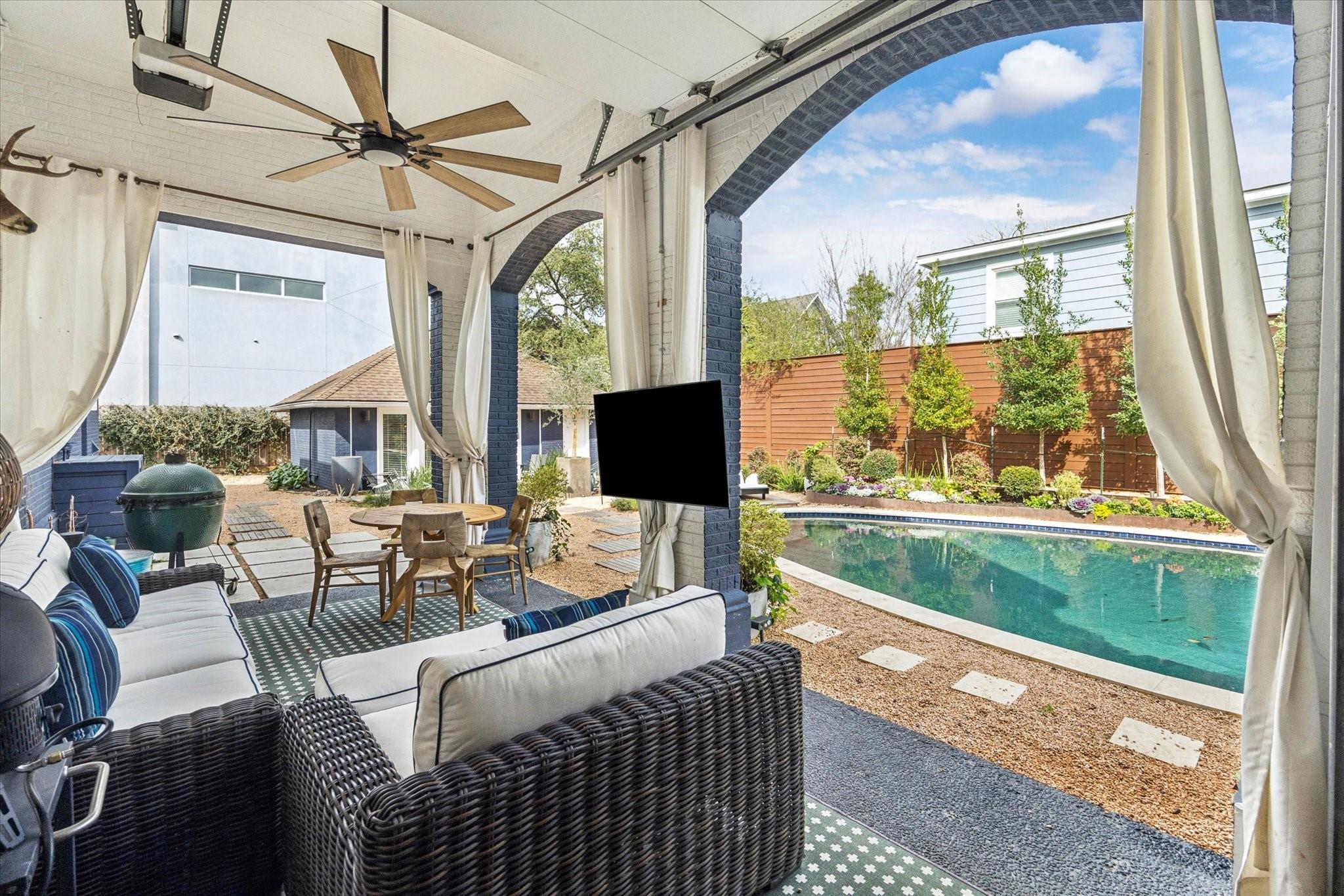 Beautifully updated 1920s home in the heart of Montrose blending historic charm with modern updates. This 3-bedroom, 3-bath residence features great formal spaces, versatile living spaces, designer finishes throughout and ample natural light. Two secondary bedrooms downstairs, each with an en-suite bathroom, and one with a bonus room: perfect for an at home office or workout room. The upstairs primary suite has gorgeous views of the back yard, multiple large closets, and a fabulous bathroom with a walk-in shower and soaking tub. Detached guest quarters provides an extra bedroom and full bathroom. The backyard is a true retreat with lush, professional landscaping, sparkling pool, and covered patio — perfect for entertaining year-round. All just steps from Montrose’s top dining, shopping, and entertainment. This is one you won't want to miss!