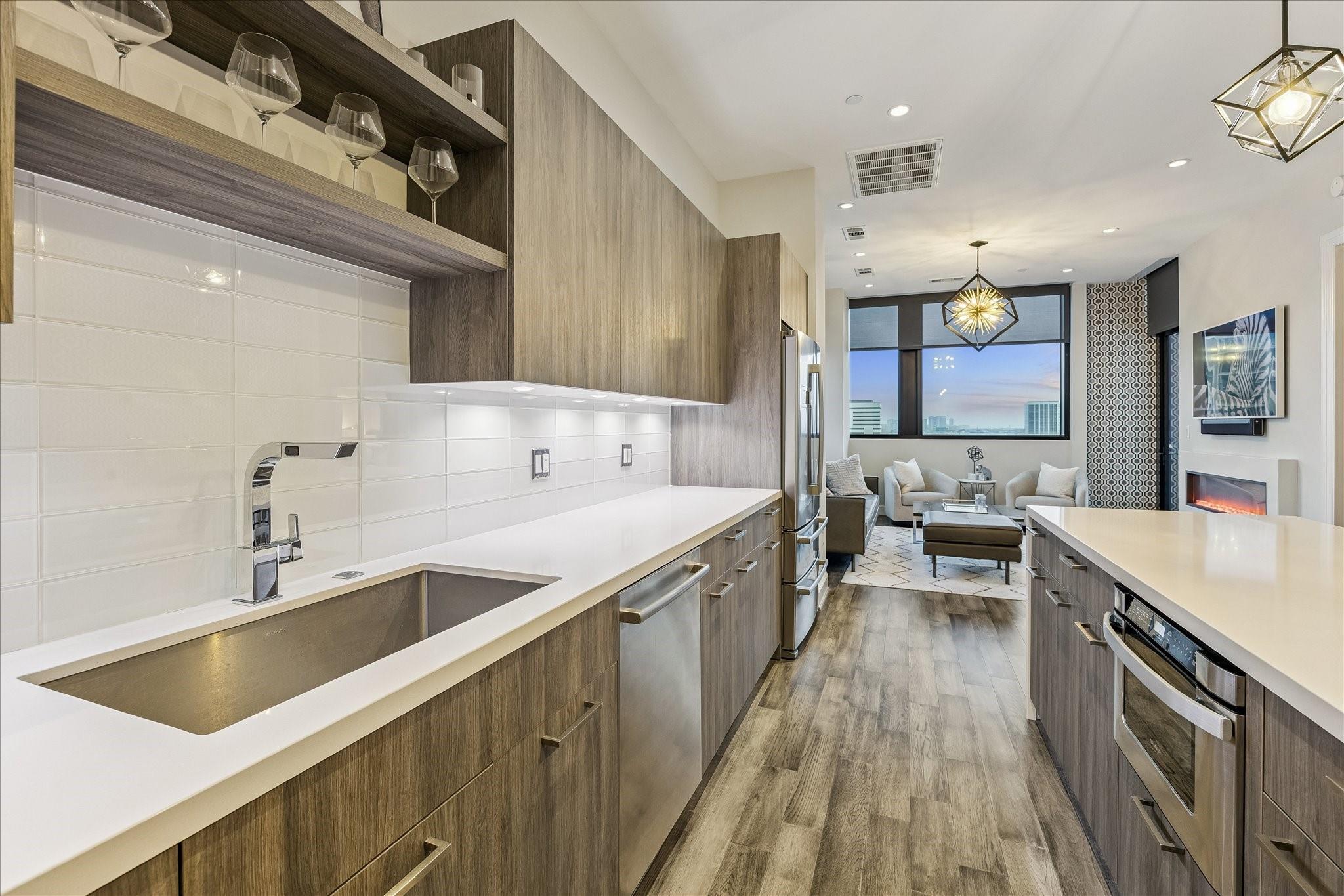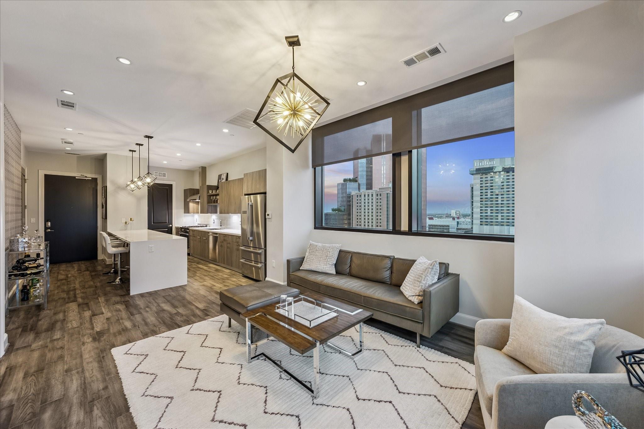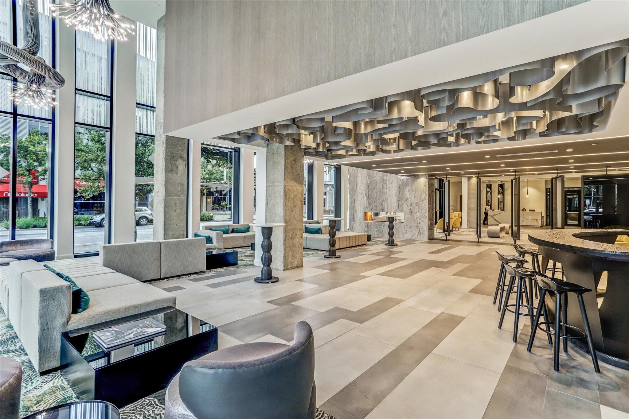 STUNNING CORNER UNIT WITH AMAZING VIEWS, UPGRADES, AND FANTASTIC LOCATION! Attention to detail shows with this meticulously maintained and owner-occupied unit since new. Thoughtful upgrades include sleek wall-paper accents and black interior doors, unique electric fireplace, Savant smart system with automated lighting, automated window shades with second black-out shade in bedroom, 2 flush-mounted QLED Art TV's, Sonos soundbar, washer/dryer and wine fridge all included! Custom closet, pantry, and additional storage built into utility room. Be sure to watch the video tour! Enjoy all of the convenience of downtown Dining, Entertainment, Sporting Events, and a quick stroll to the Phoenicia market! The MARLOWE offers first class amenities with an extensive Fitness Center, Sauna, Pool Deck, Secure Garage, Concierge, Dog Run and more! Outdoor Pool/Kitchen area currently under remodel and set to re-open this summer. Come enjoy life at the MARLOWE! Owner is a Licensed Texas Real Estate Agent.
