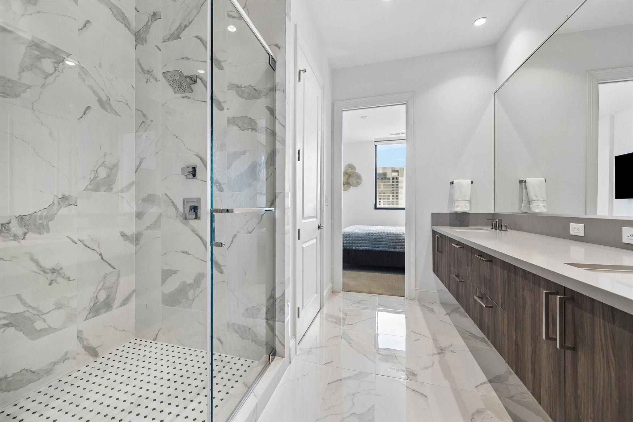 Welcome to Unit 1503 at The Marlowe, where modern design meets elevated city living. This impeccably maintained 2-bedroom, 2.5-bath residence features 10’ ceilings, floor-to-ceiling windows, and stunning northeast views. The chef’s kitchen offers a quartz waterfall island, Bosch stainless steel appliances, Bertazzoni gas range, and sleek Pedini cabinetry, complemented by hardwood floors and custom closets. The spacious primary suite includes a spa-like bath with dual sinks and a large walk-in closet, while the secondary bedroom features an en-suite bath—ideal for guests or a home office—plus a half bath and in-unit laundry. Enjoy 24-hour concierge, rooftop pool, fitness center, sauna, steam room, and outdoor kitchen, all just steps from Discovery Green, Phoenicia, Toyota Center, Four Seasons, and Downtown’s best dining and entertainment.