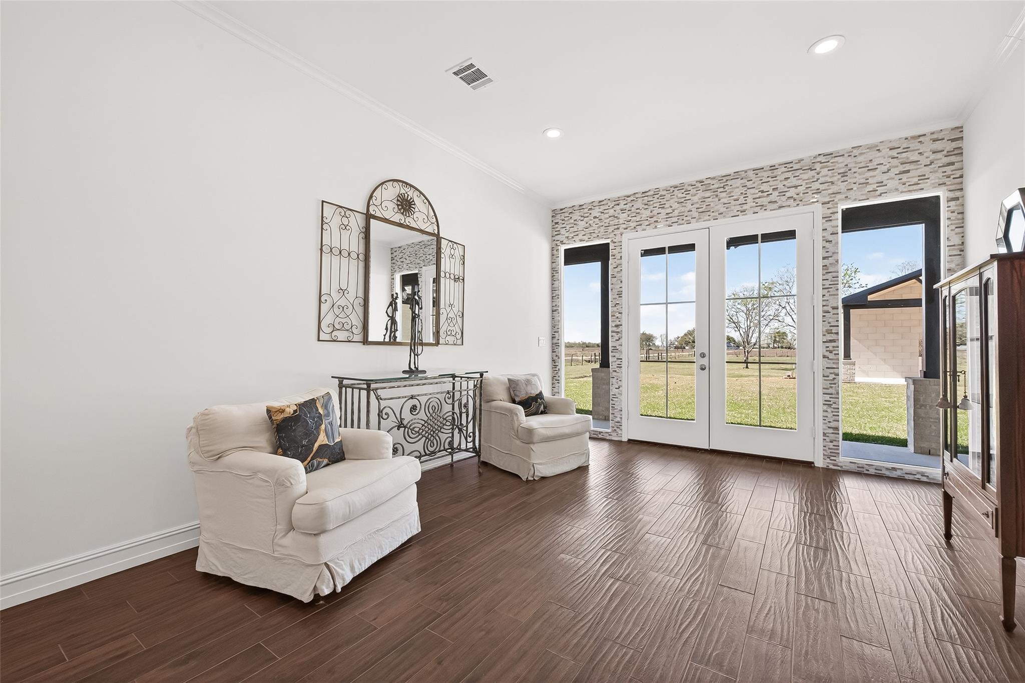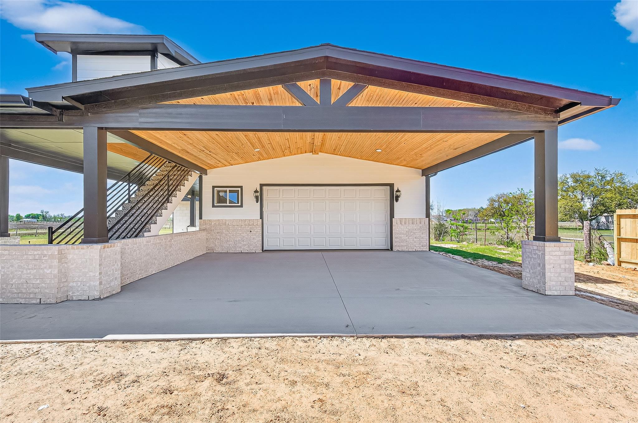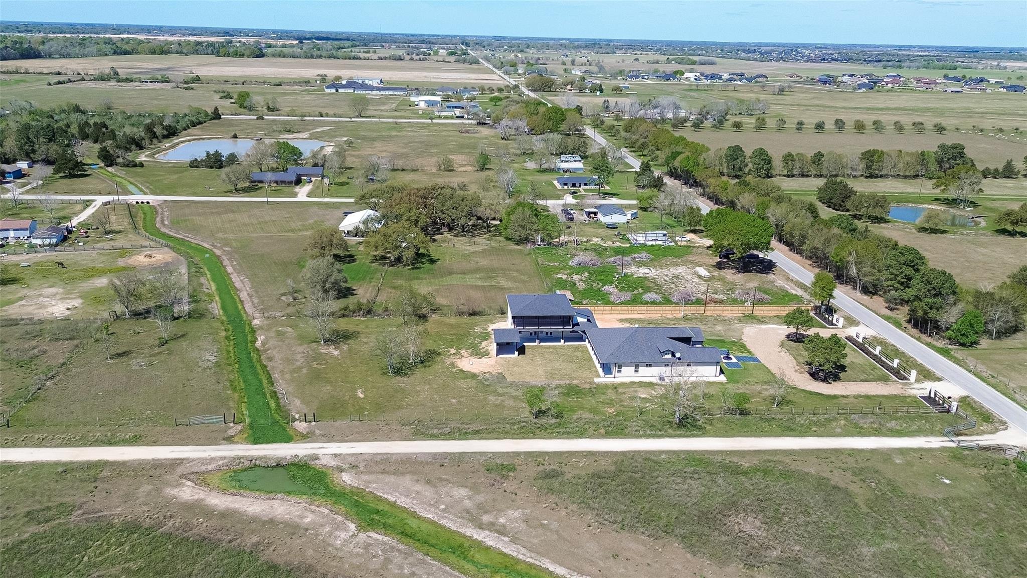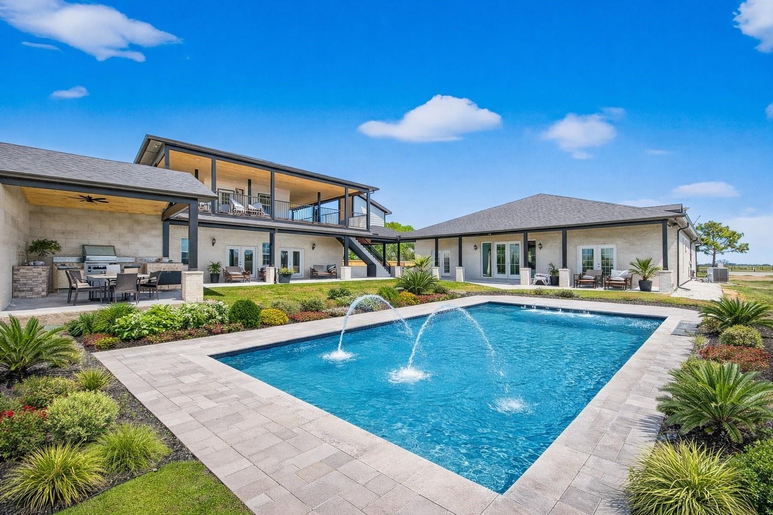 This thoughtfully designed Custom property offers privacy, space, and elevated Needville country living. A grand entry welcomes you into the home where the gourmet kitchen opens to the living and dining areas, creating an ideal layout for everyday living and entertaining.The home features three bedrooms with en-suite bathrooms and a versatile media or game room. The upstairs layout also offers space to add an additional bathroom and closet. A oversized two-car garage includes living quarters above with two bedrooms and a full bathroom. A large covered balcony provides expansive 180-degree views overlooking the property. The lower level includes the garage, a full bathroom with shower, and two additional flex rooms ideal for office, fitness, or studio space. Covered porch walkways connect the home, garage, and outdoor living areas. The outdoor kitchen includes cabinetry, sink, and space ready for a grill, overlooking the backyard with room for a future pool. Schedule your showing today!