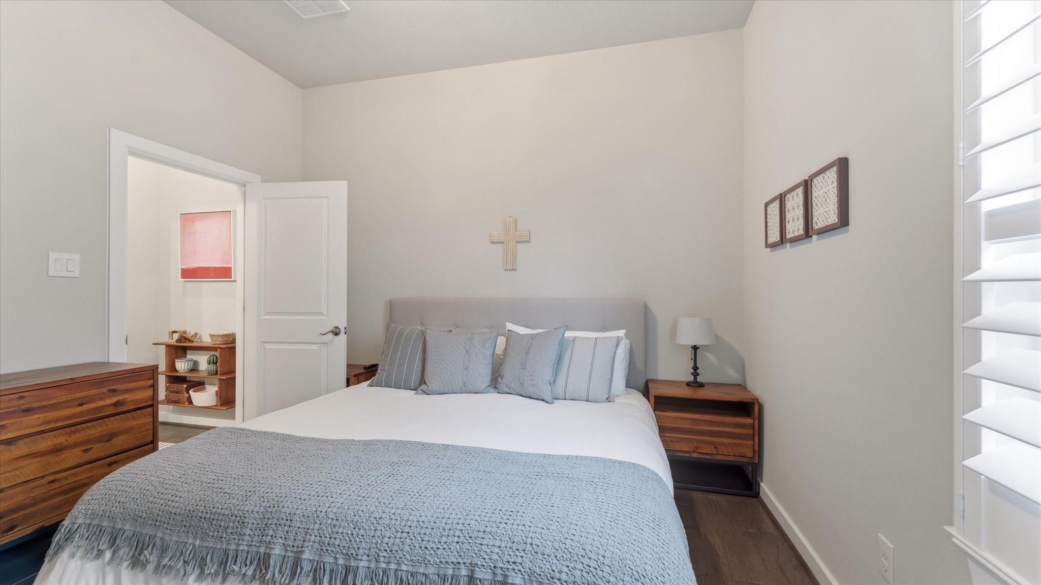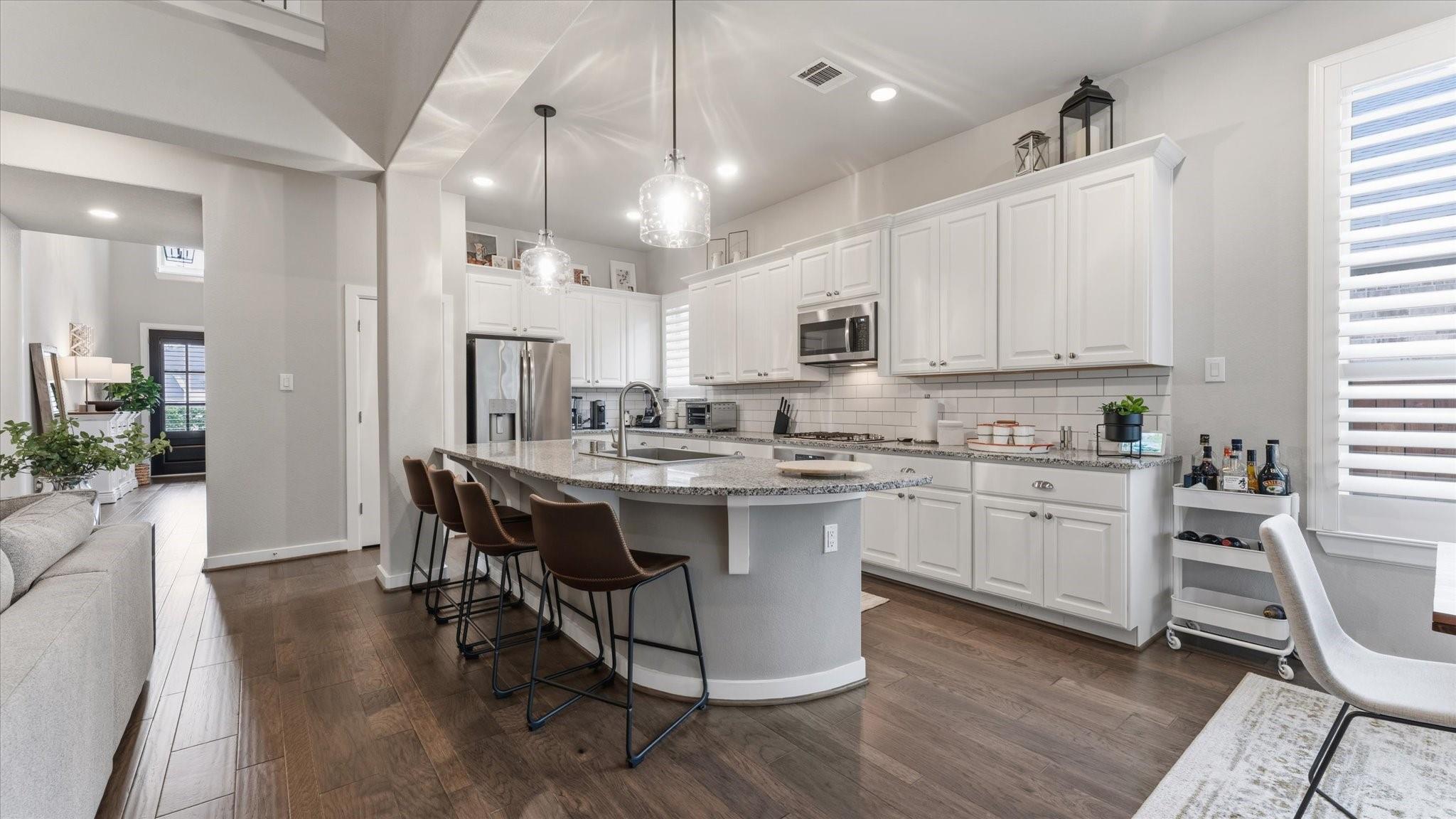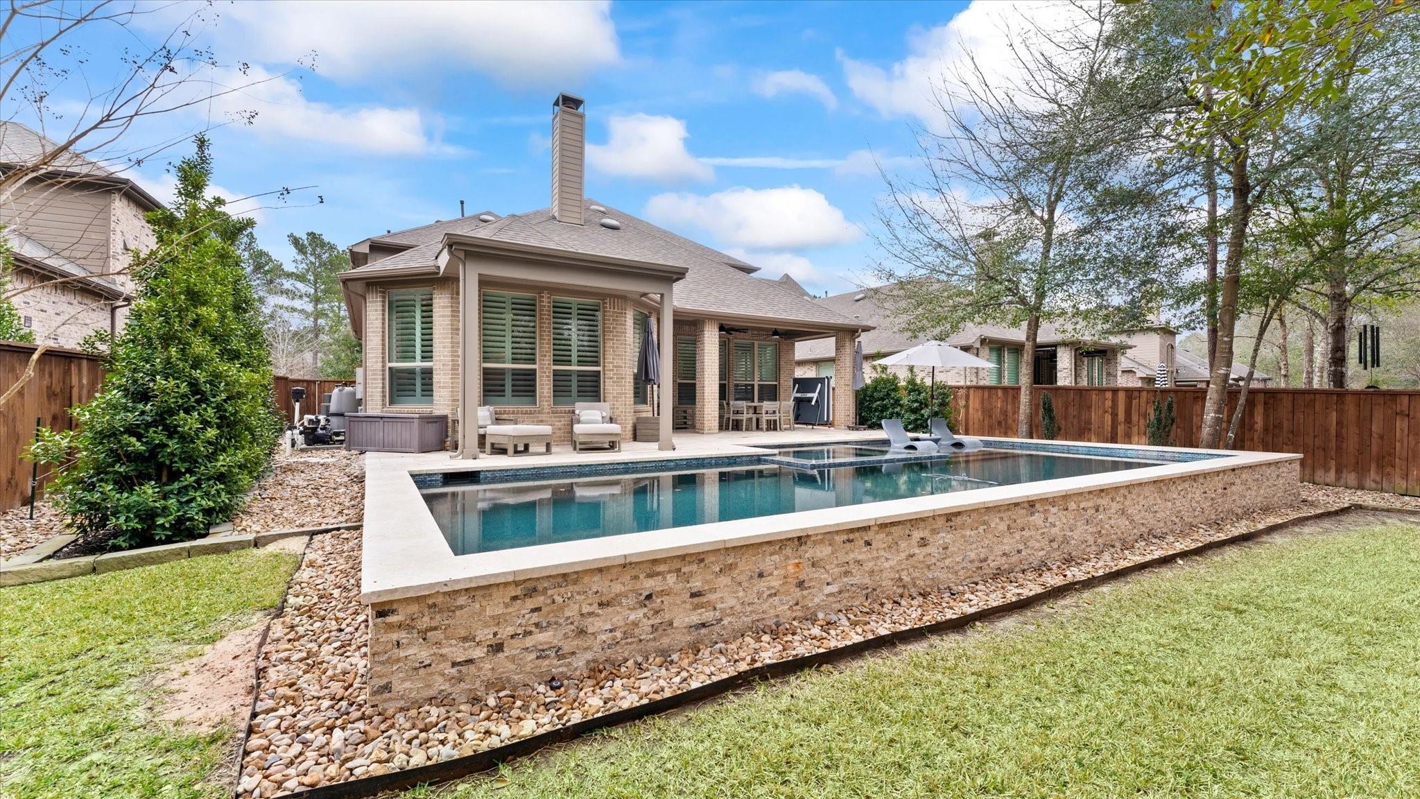 POOL HOME IN GATED WOODFOREST Located within a PRIVATE GATED SECTION of the highly sought-after master-planned community of Woodforest, this like-new 5-bedroom, 4.5-bathroom home blends style, function & resort-style living. Inside, you’ll find soaring ceilings, rich wood flooring, and an open-concept layout designed for everyday living and entertaining. The primary suite & a secondary bedroom with full bath are conveniently located downstairs, ideal for guests or multi-generational living. The chef’s kitchen features granite countertops, ss appliances & generous prep space overlooking the main living area. The spacious primary retreat offers a spa-like ensuite w/ dual vanities, soaking tub, custom walk-in shower & large walk-in closet. Upstairs includes additional bedrooms & a game room. Step outside to your private backyard oasis with a covered patio & Pool & spa — perfect for relaxing or entertaining. Enjoy golf, trails, parks & resort-style amenities.