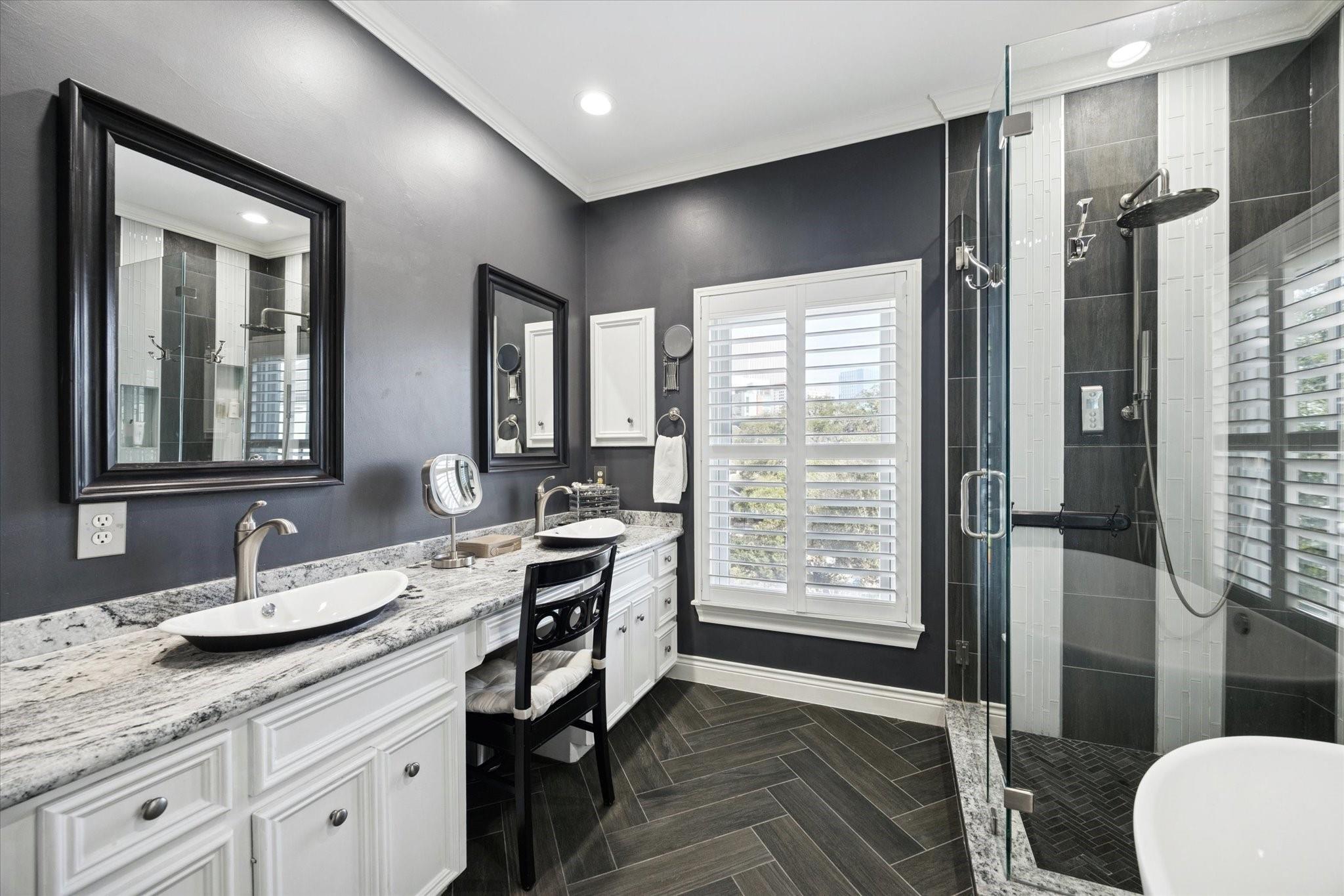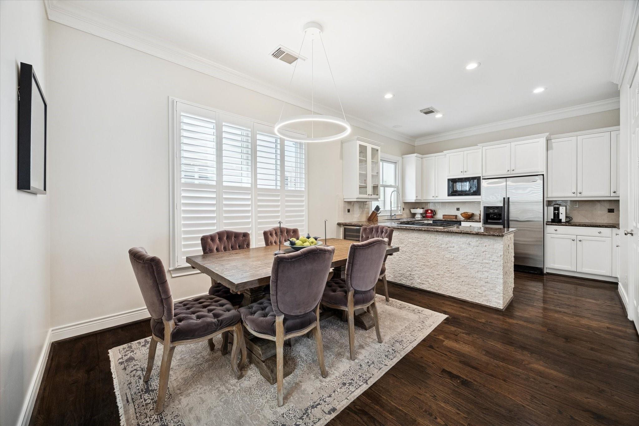 Private elevator-served residence within the gated enclave of Oak Place Court. Thoughtfully renovated with improvements exceeding typical market offerings, the home presents three exposures, tall windows appointed with custom wood louvered shutters, and layered treetop views. The main level is defined by a sunken living salon with fireplace and custom millwork, refinished hardwood floors, substantial crown molding, and a discreet powder room. The kitchen offers granite surfaces, island seating, wine storage, and tailored lighting. The primary suite includes a five-piece bath with freestanding tub, glass shower, and dual vanities. Nest climate controls, surround pre-wiring, and extensive mechanical and energy-efficient upgrades complete this refined offering.