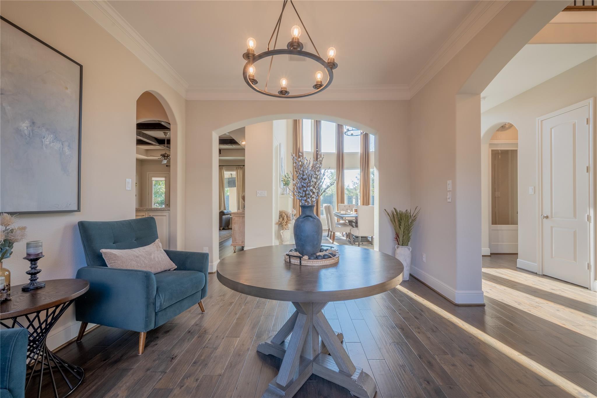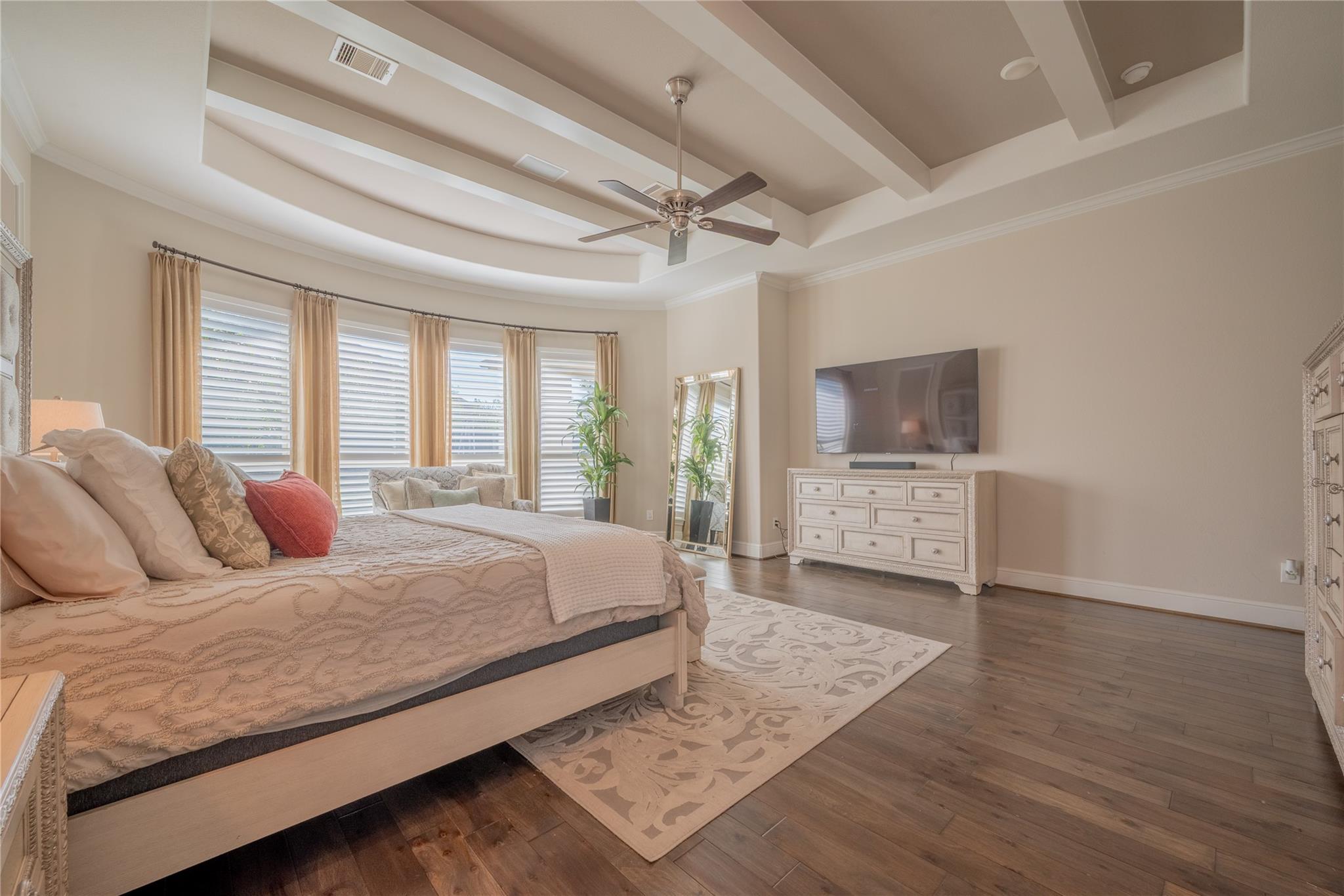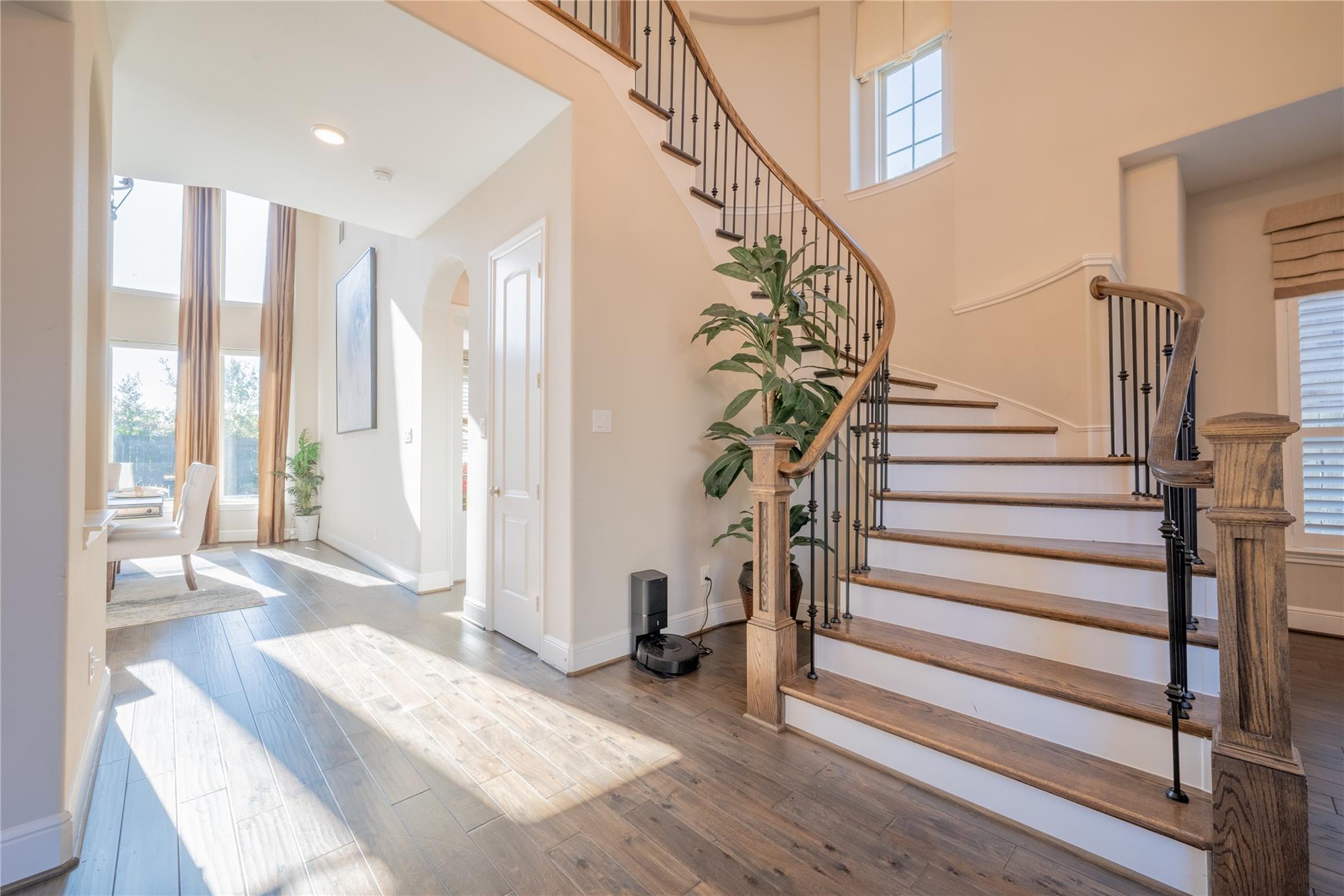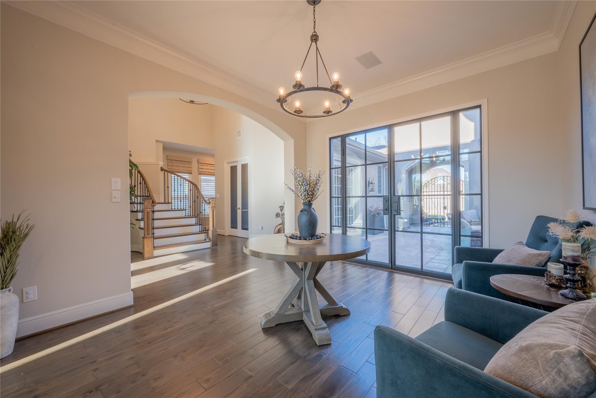 Welcome to this appointed former model home by Coventry Homes, nestled inside the gated and prestigious Bridle Creek community. From the moment you arrive, this exceptional residence impresses with its elegant design, thoughtful upgrades, and inviting spaces made for both everyday living and unforgettable entertaining. Built in 2017, this stunning 5-bedroom, 4-bathroom home offers 5,142 square feet of refined living space on an expansive 10,800 square foot lot. Inside, you’ll find rich hardwood floors, a private study, a bright breakfast area, and a dramatic spiral staircase that makes a lasting first impression. The gourmet kitchen is a chef’s dream, featuring quartz countertops, stainless steel appliances, and ample space to gather.