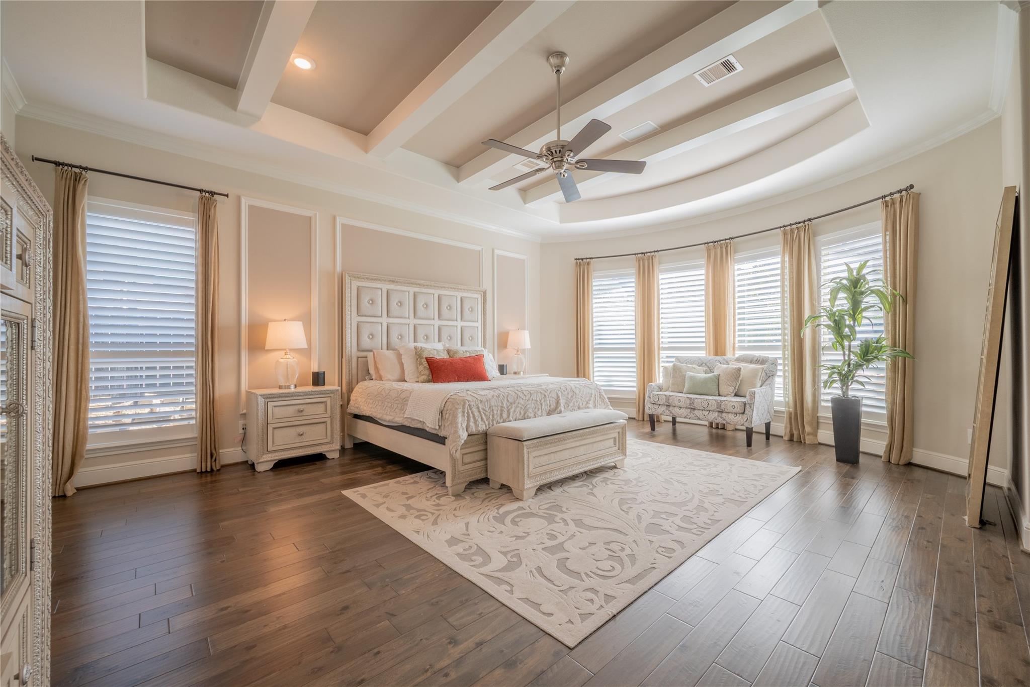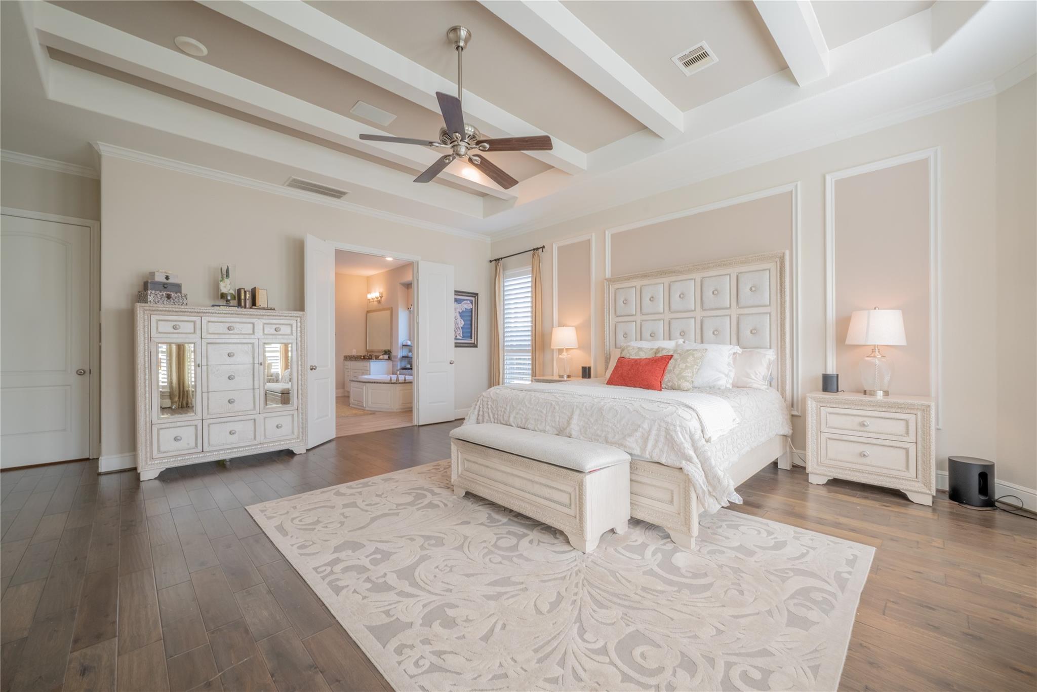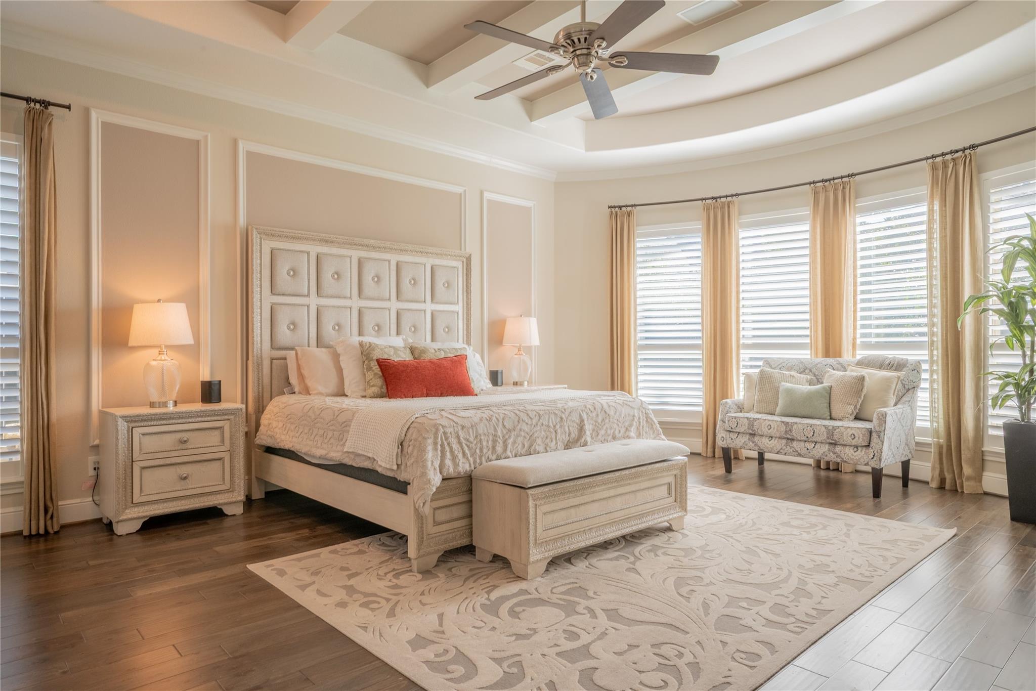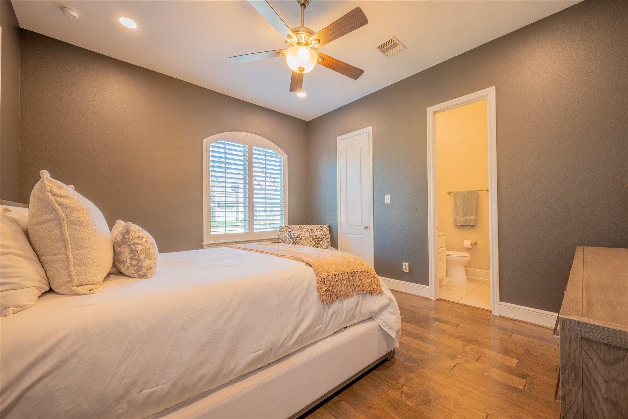 Welcome to this appointed former model home by Coventry Homes, nestled inside the gated and prestigious Bridle Creek community. From the moment you arrive, this exceptional residence impresses with its elegant design, thoughtful upgrades, and inviting spaces made for both everyday living and unforgettable entertaining. Built in 2017, this stunning 5-bedroom, 4-bathroom home offers 5,142 square feet of refined living space on an expansive 10,800 square foot lot. Inside, you’ll find rich hardwood floors, a private study, a bright breakfast area, and a dramatic spiral staircase that makes a lasting first impression. The gourmet kitchen is a chef’s dream, featuring quartz countertops, stainless steel appliances, and ample space to gather.