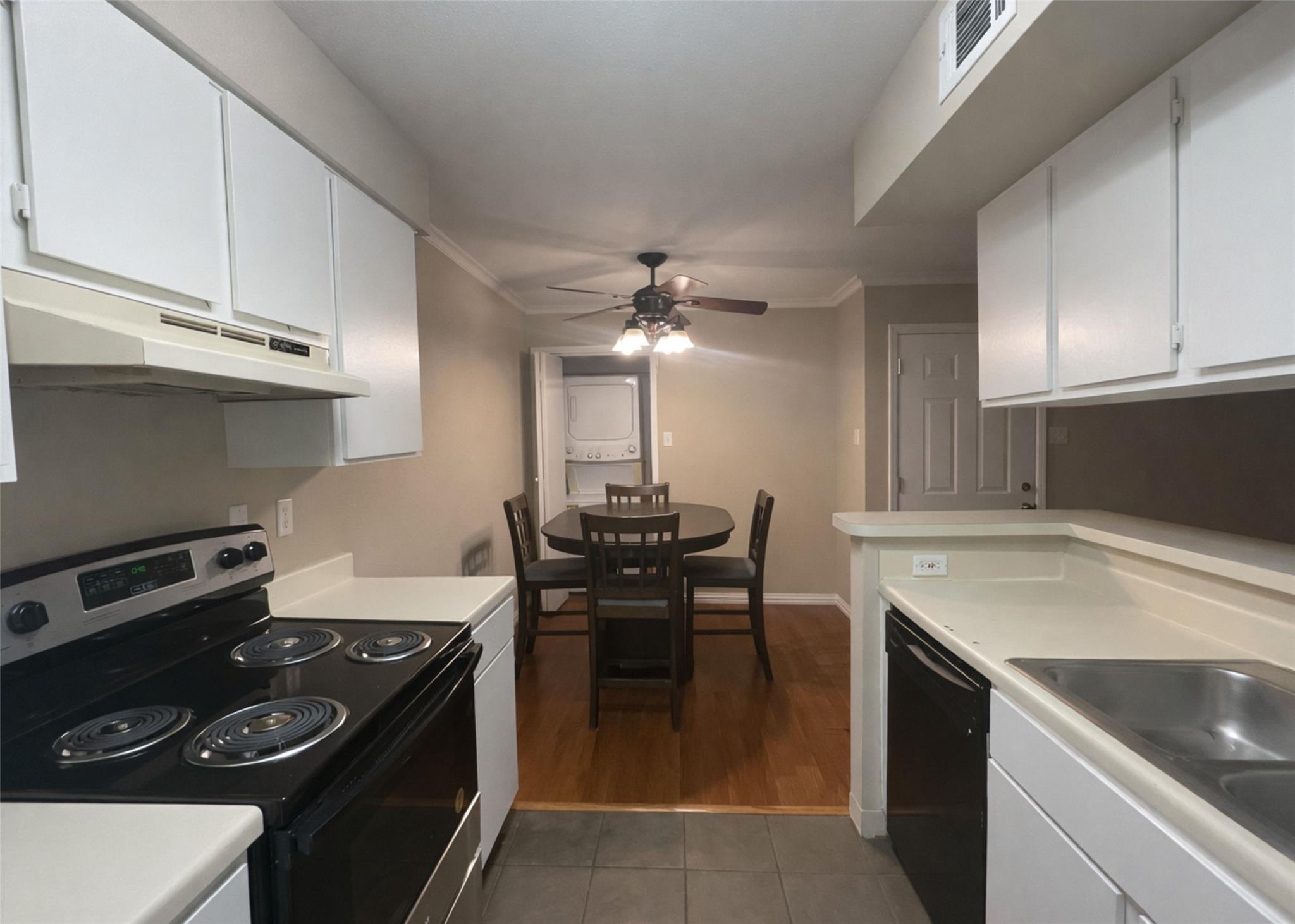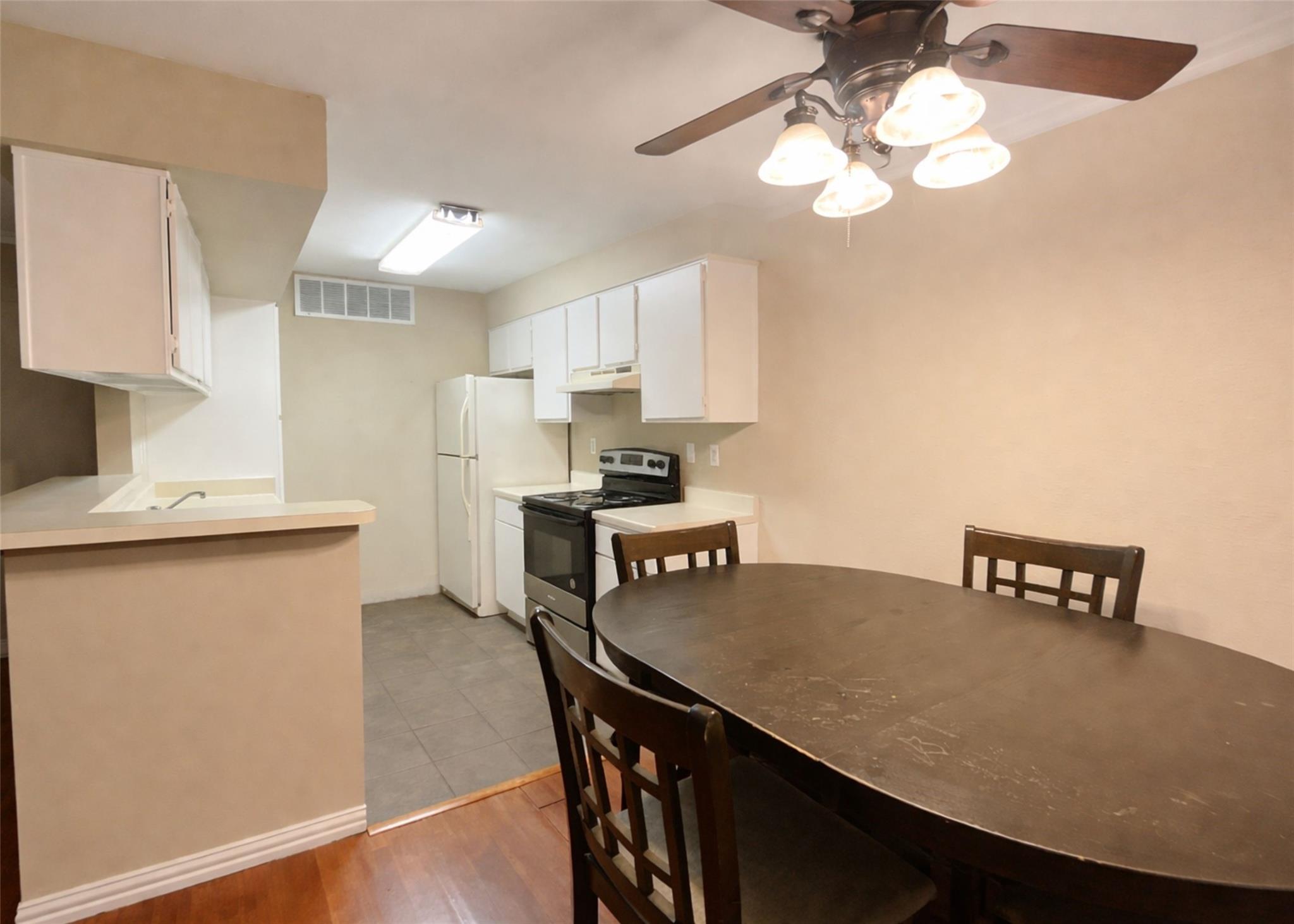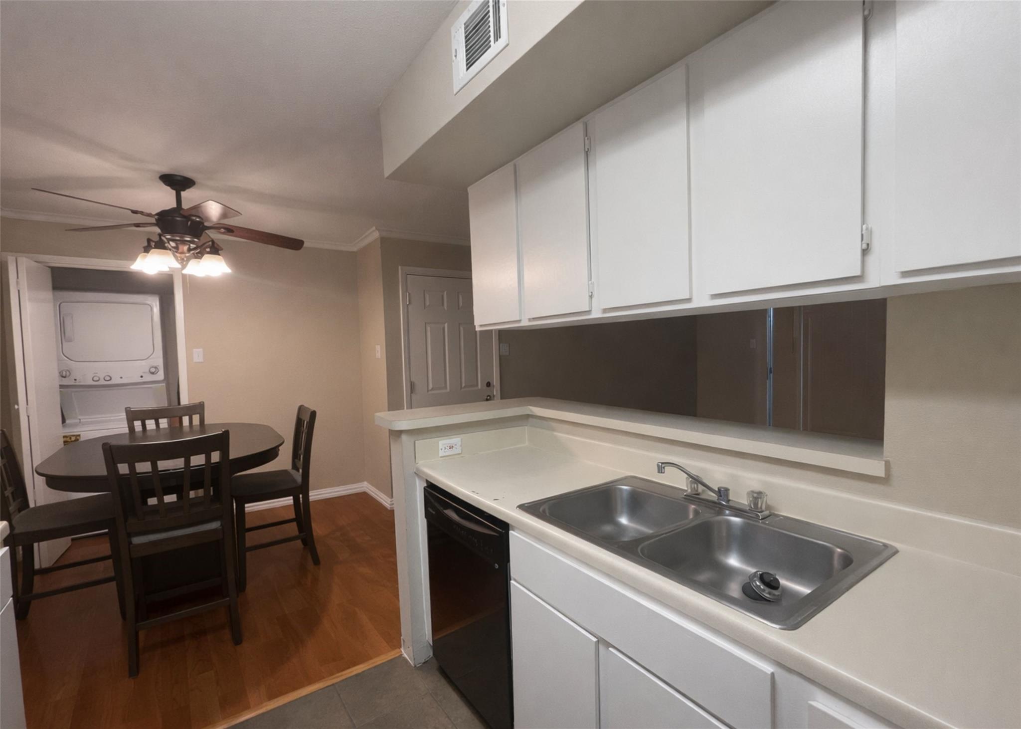Very charming 1-bedroom, 1-bath ground-level condo in a desirable corner building location! This inviting unit features an open living and kitchen layout with a cozy breakfast dining area, perfect for everyday living or entertaining. Enjoy the convenience of an inside utility room with a double-stack washer and dryer, plus all appliances included. Fresh interior paint and laminate wood flooring add warmth and style throughout. The updated bathroom showcases neutral tones and tasteful modern touches. Just steps from the community pool, surrounded by beautifully maintained grounds and landscaping. Includes 1 dedicated covered parking space. This one is a keeper!