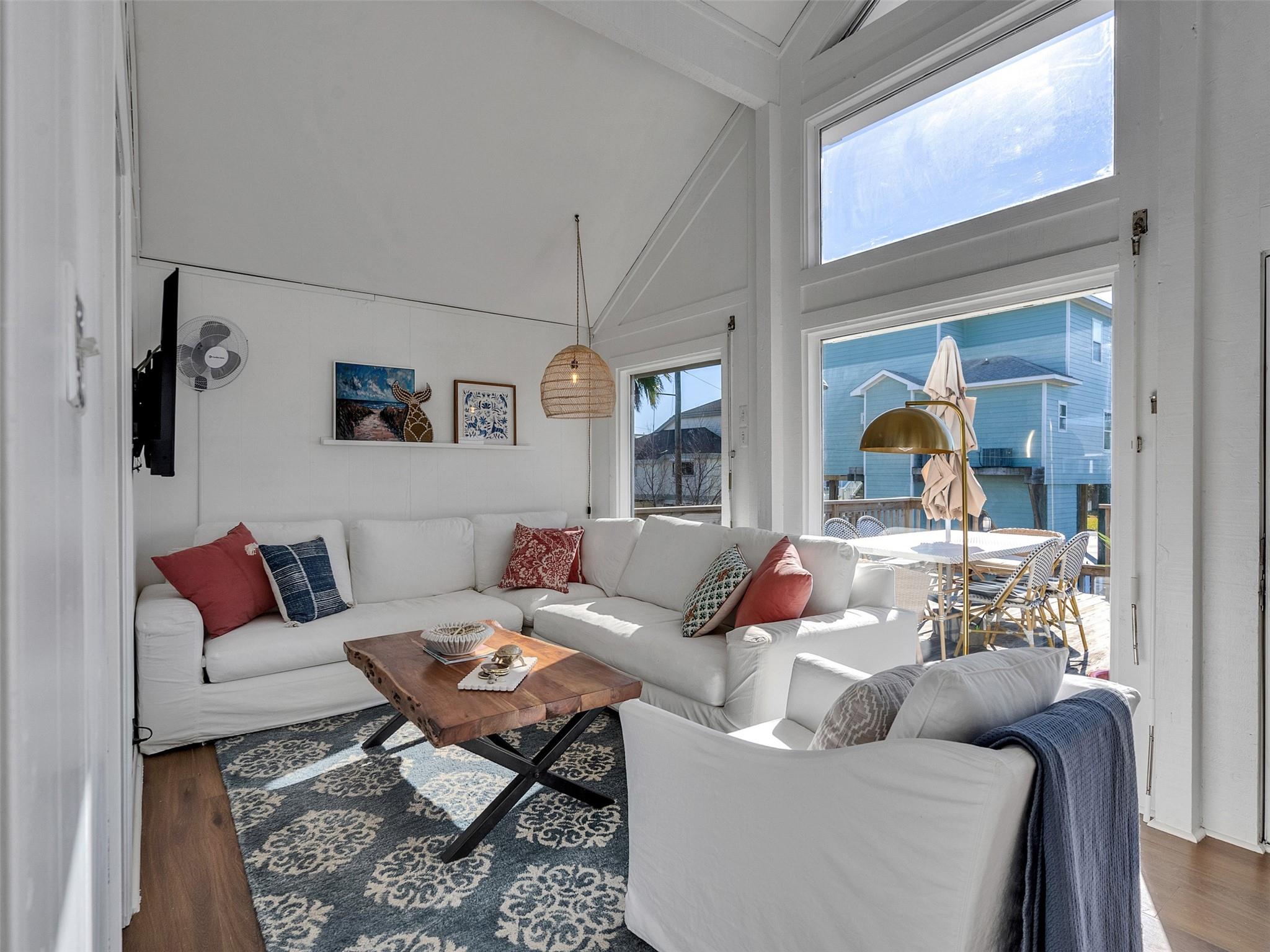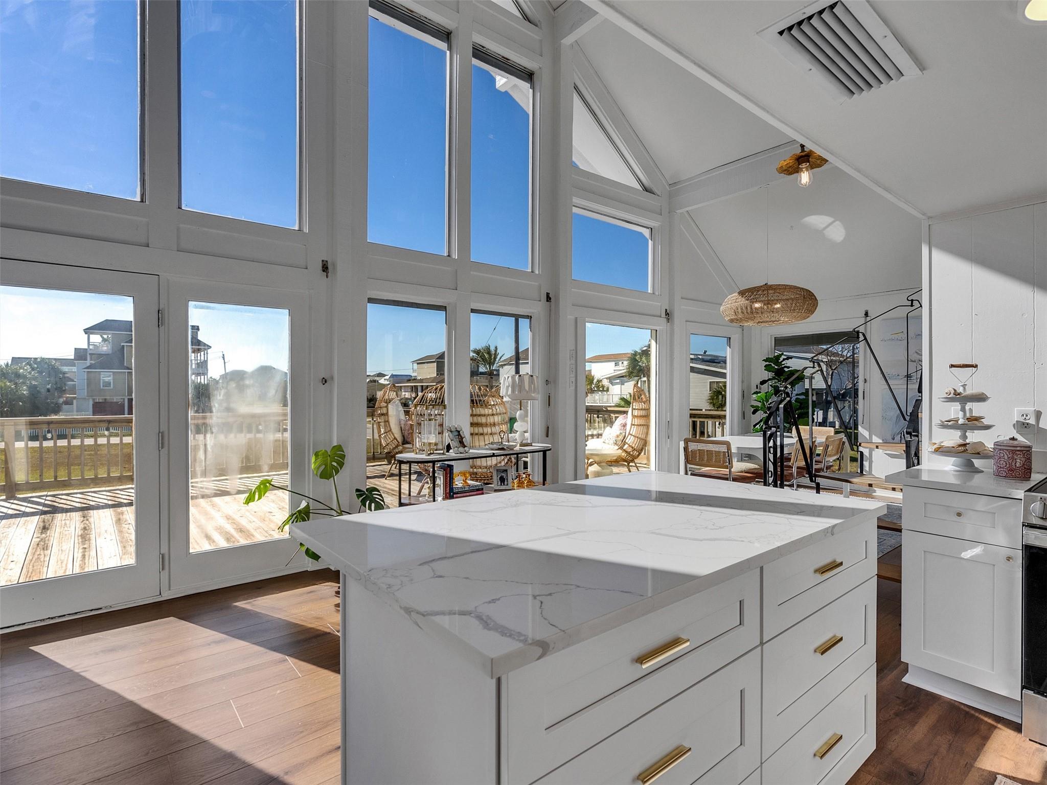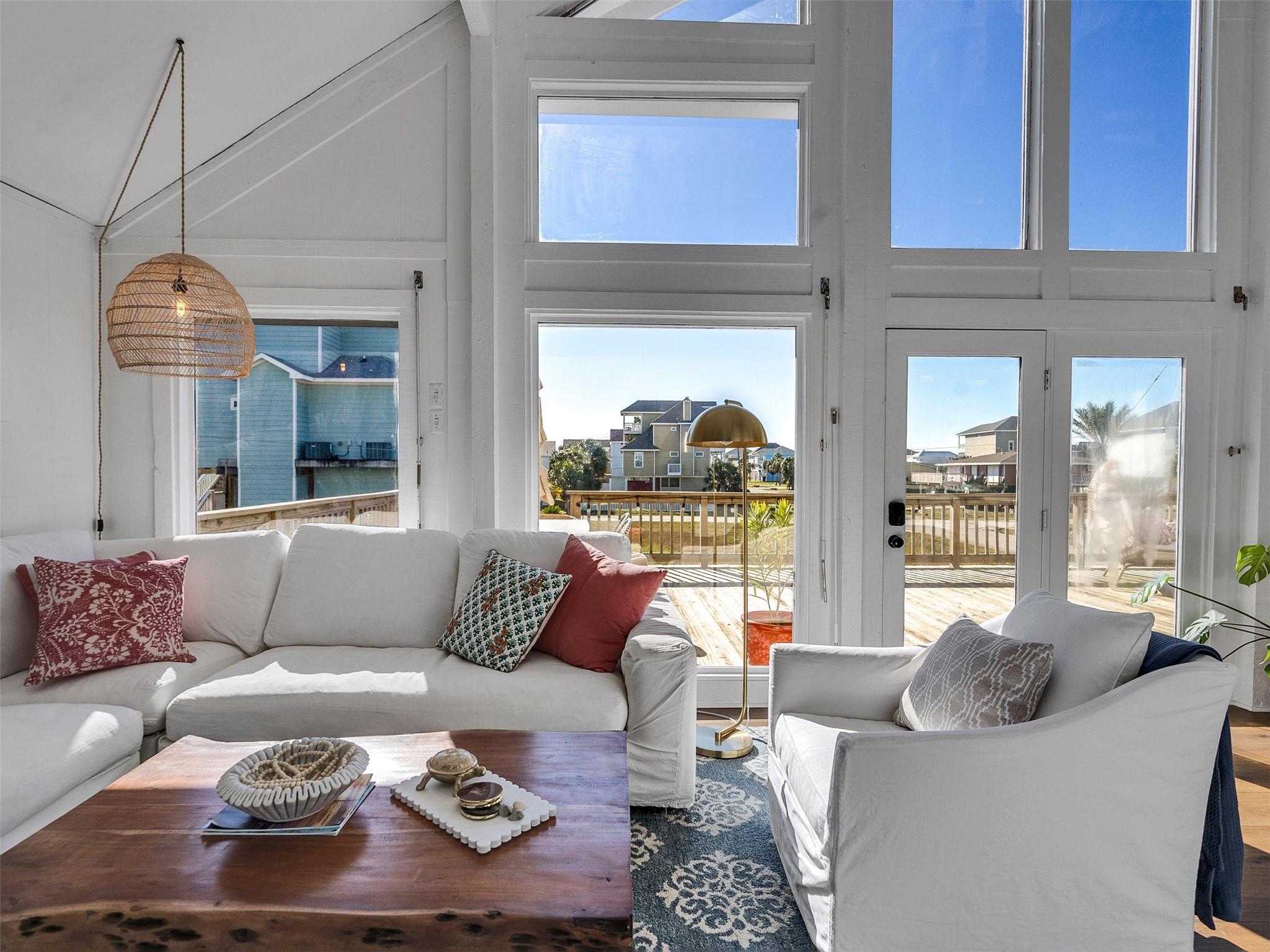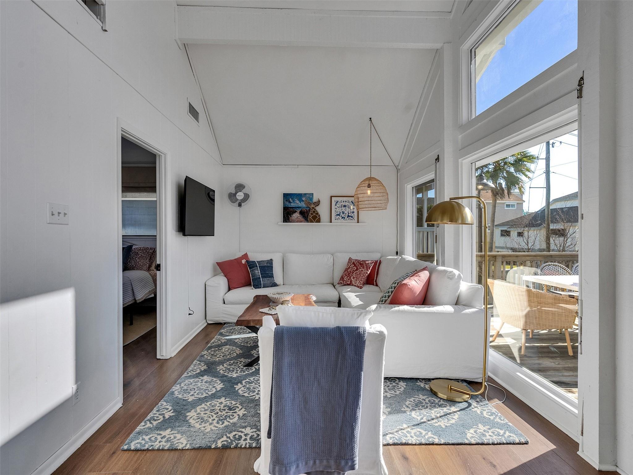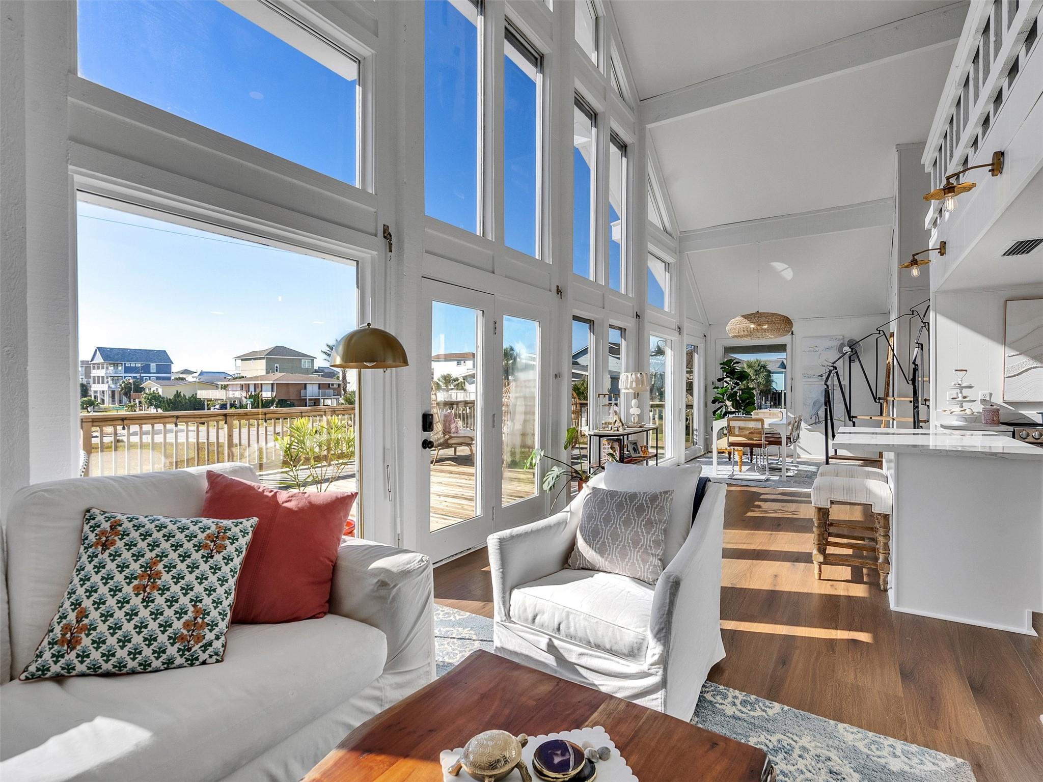 This beautifully designed beach home is located just a few blocks from the sand, offering the perfect balance of privacy and easy beach access. Inside, fresh wood floors and crisp white walls glow in the afternoon light, while expansive windows and double French doors invite natural light and coastal breezes. Ocean views can be enjoyed from the deck and upstairs loft, which serves as an additional living room or sleeping area. The updated kitchen features quartz countertops, white shaker cabinetry, and brushed brass fixtures, creating a clean, coastal aesthetic that feels modern and inviting. A thoughtfully designed Jack-and-Jill bathroom connects the bedrooms. Enjoy your morning coffee from the deck or rinse off in the convenient outdoor shower after a day at the beach. Offered fully furnished w/ some exclusions and move-in ready—a cover image that suggests calm, space, and modern coastal luxury.