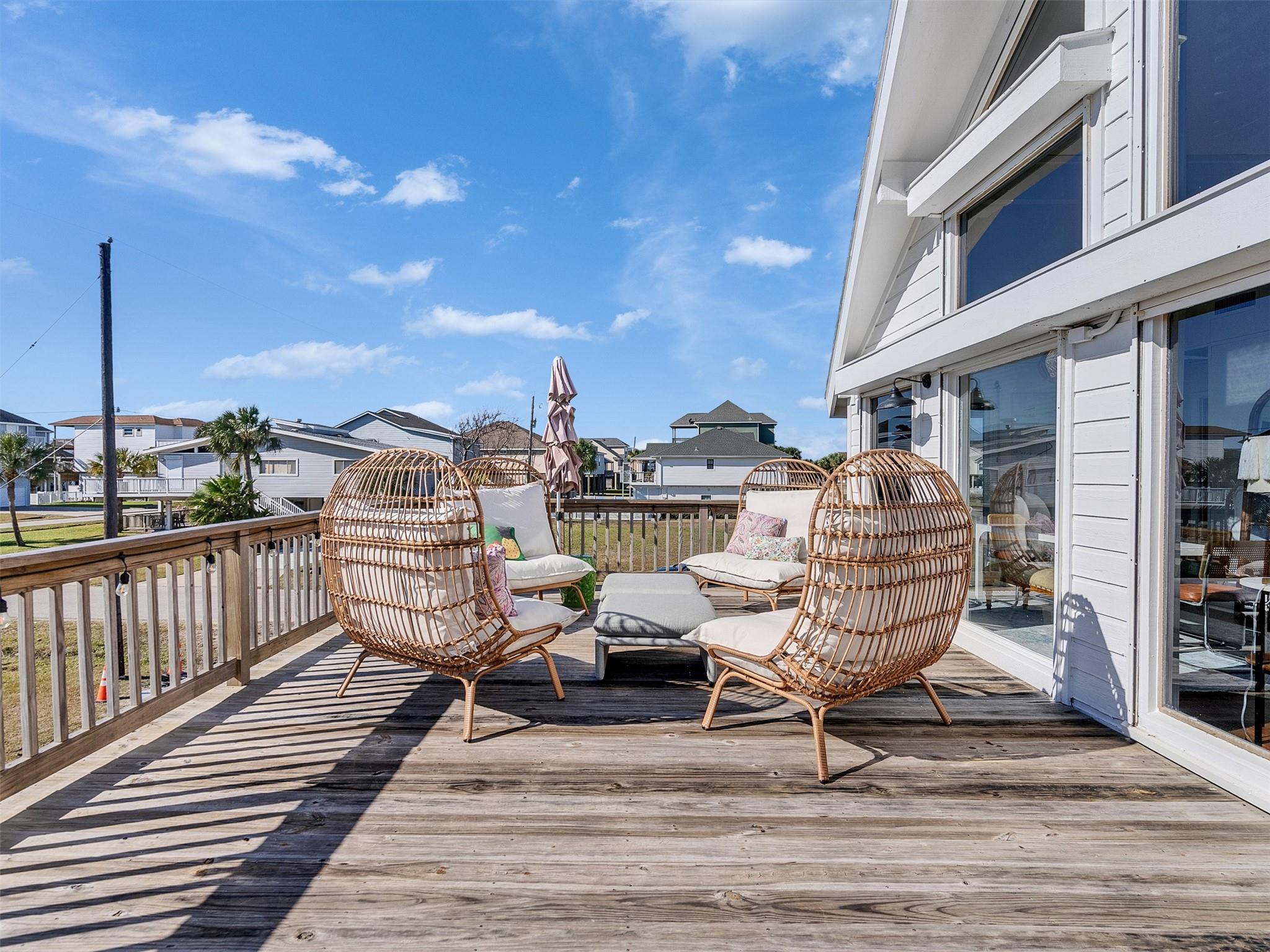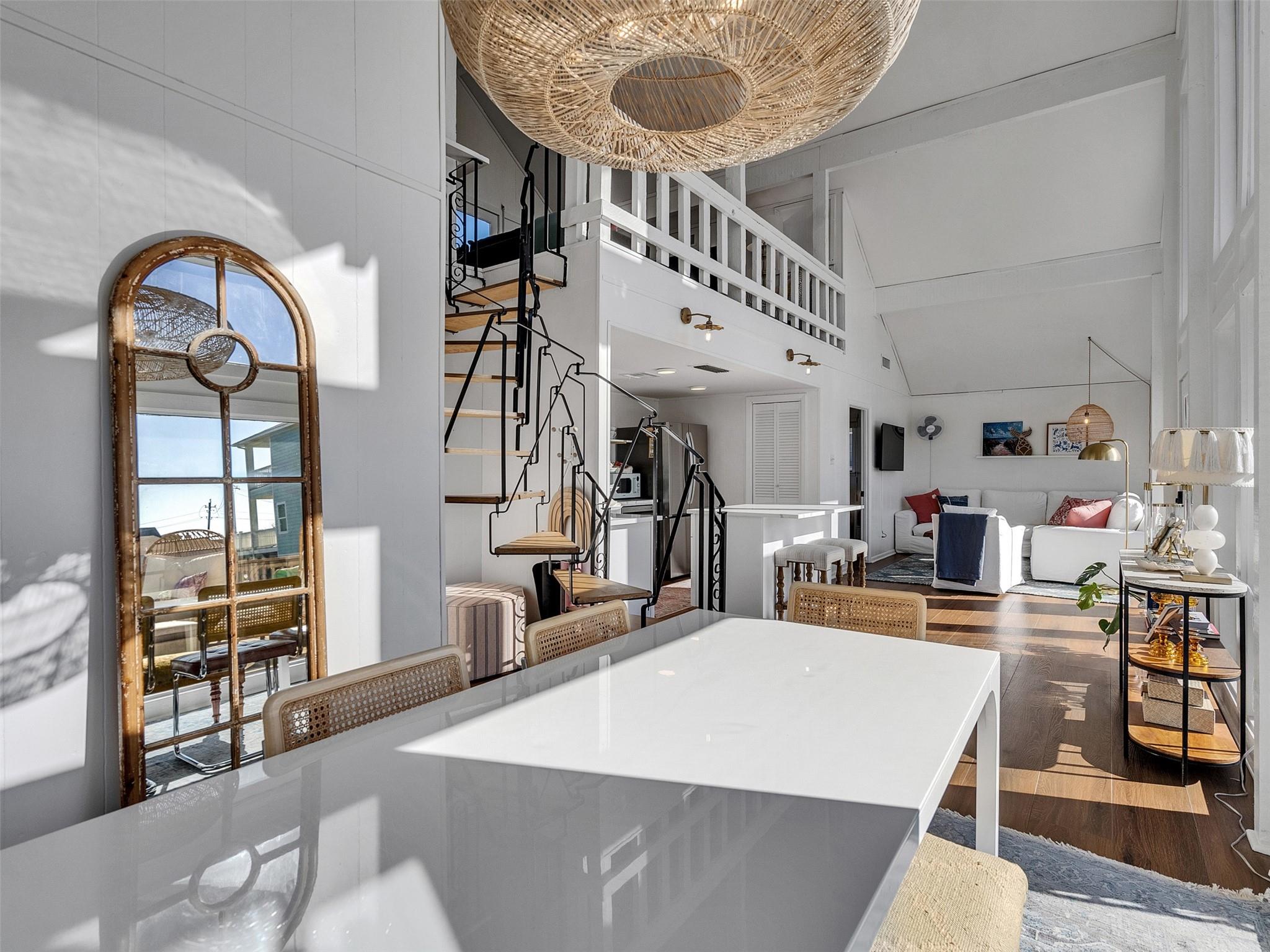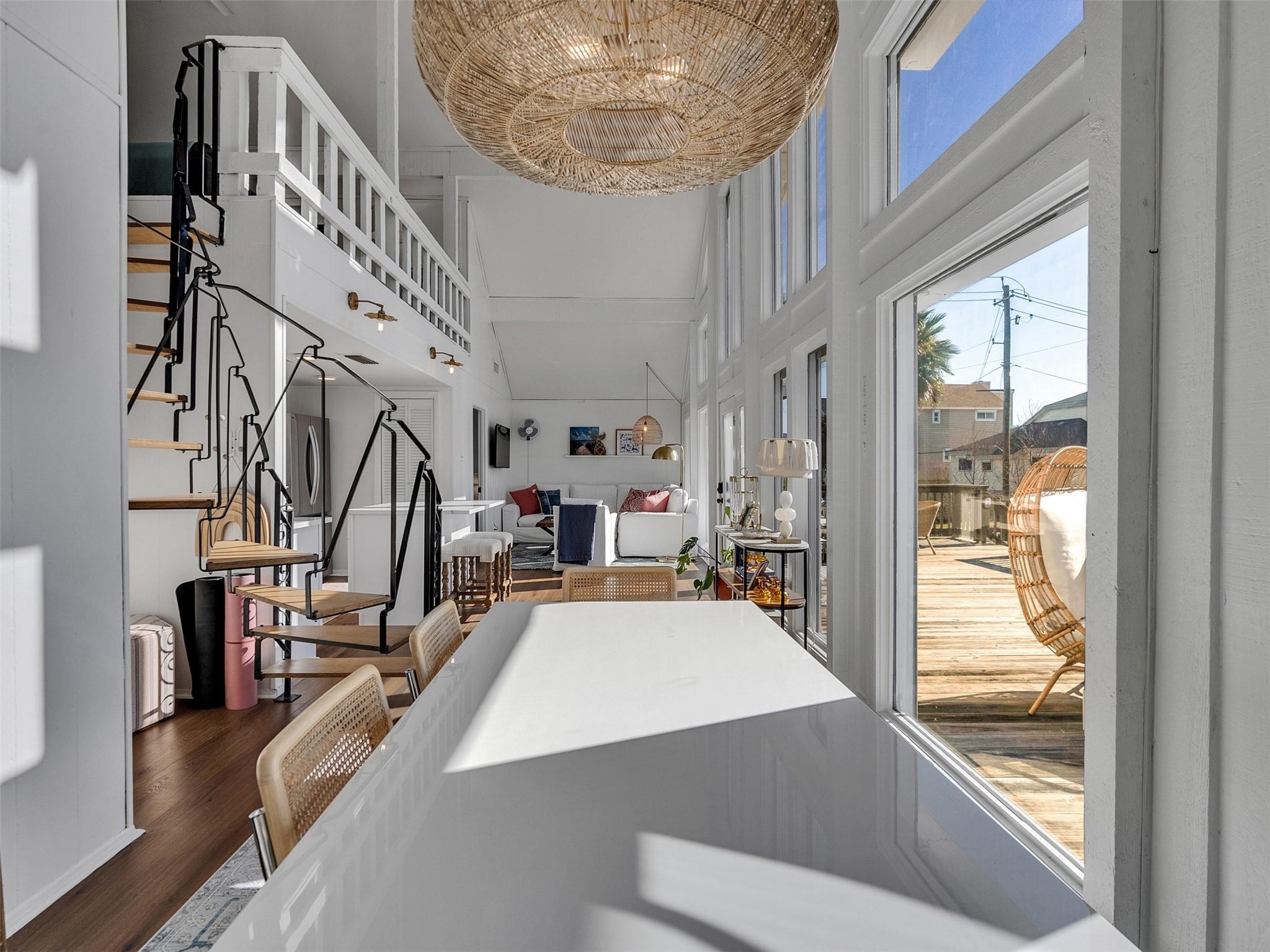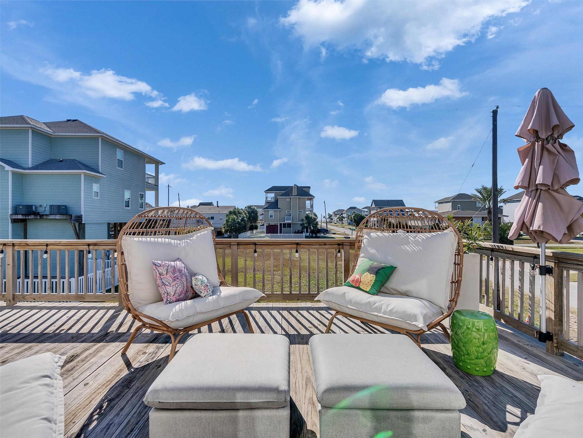 This beautifully designed beach home is located just a few blocks from the sand, offering the perfect balance of privacy and easy beach access. Inside, fresh wood floors and crisp white walls glow in the afternoon light, while expansive windows and double French doors invite natural light and coastal breezes. Ocean views can be enjoyed from the deck and upstairs loft, which serves as an additional living room or sleeping area. The updated kitchen features quartz countertops, white shaker cabinetry, and brushed brass fixtures, creating a clean, coastal aesthetic that feels modern and inviting. A thoughtfully designed Jack-and-Jill bathroom connects the bedrooms. Enjoy your morning coffee from the deck or rinse off in the convenient outdoor shower after a day at the beach. Offered fully furnished w/ some exclusions and move-in ready—a cover image that suggests calm, space, and modern coastal luxury.