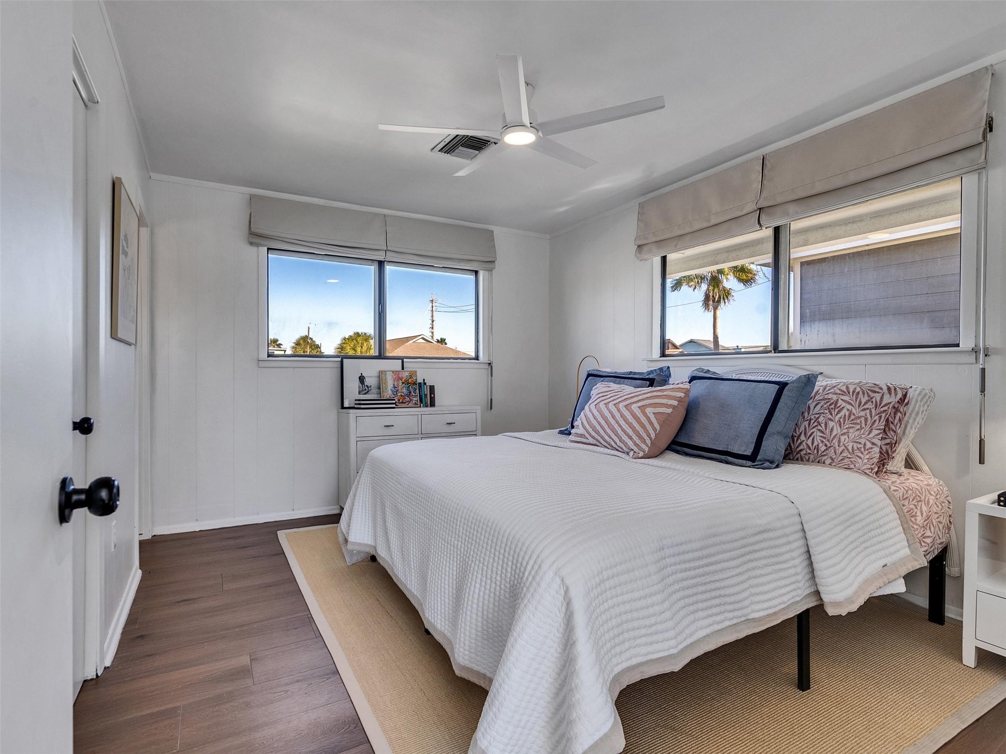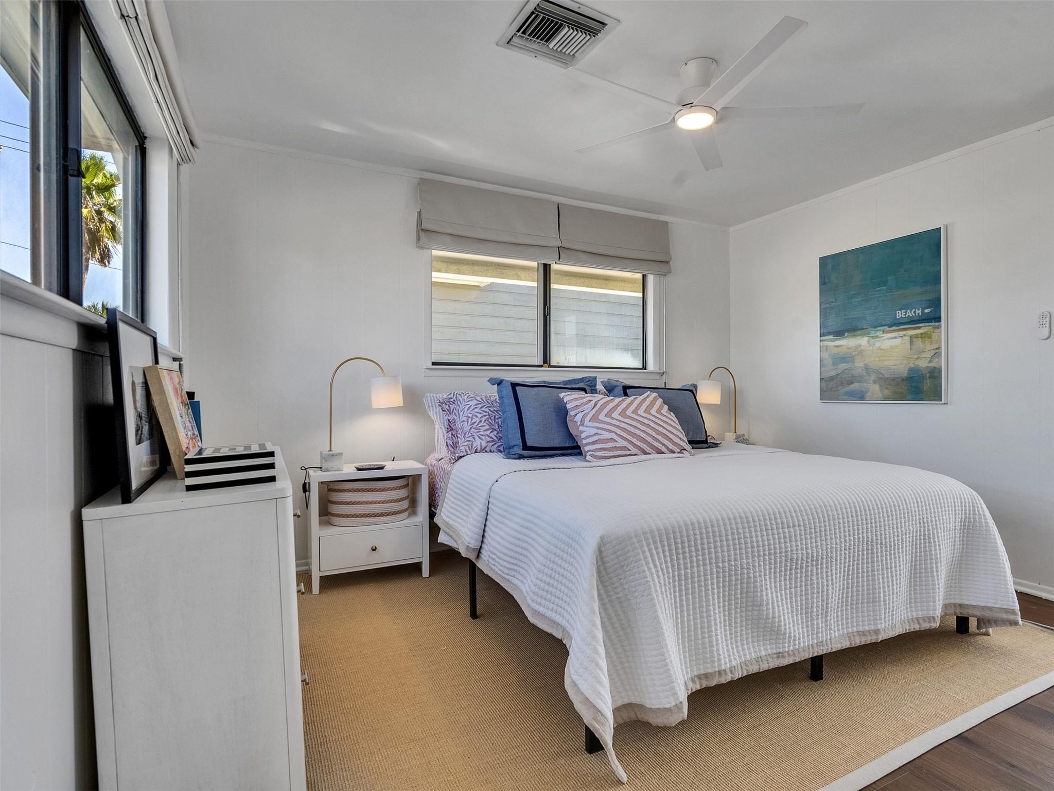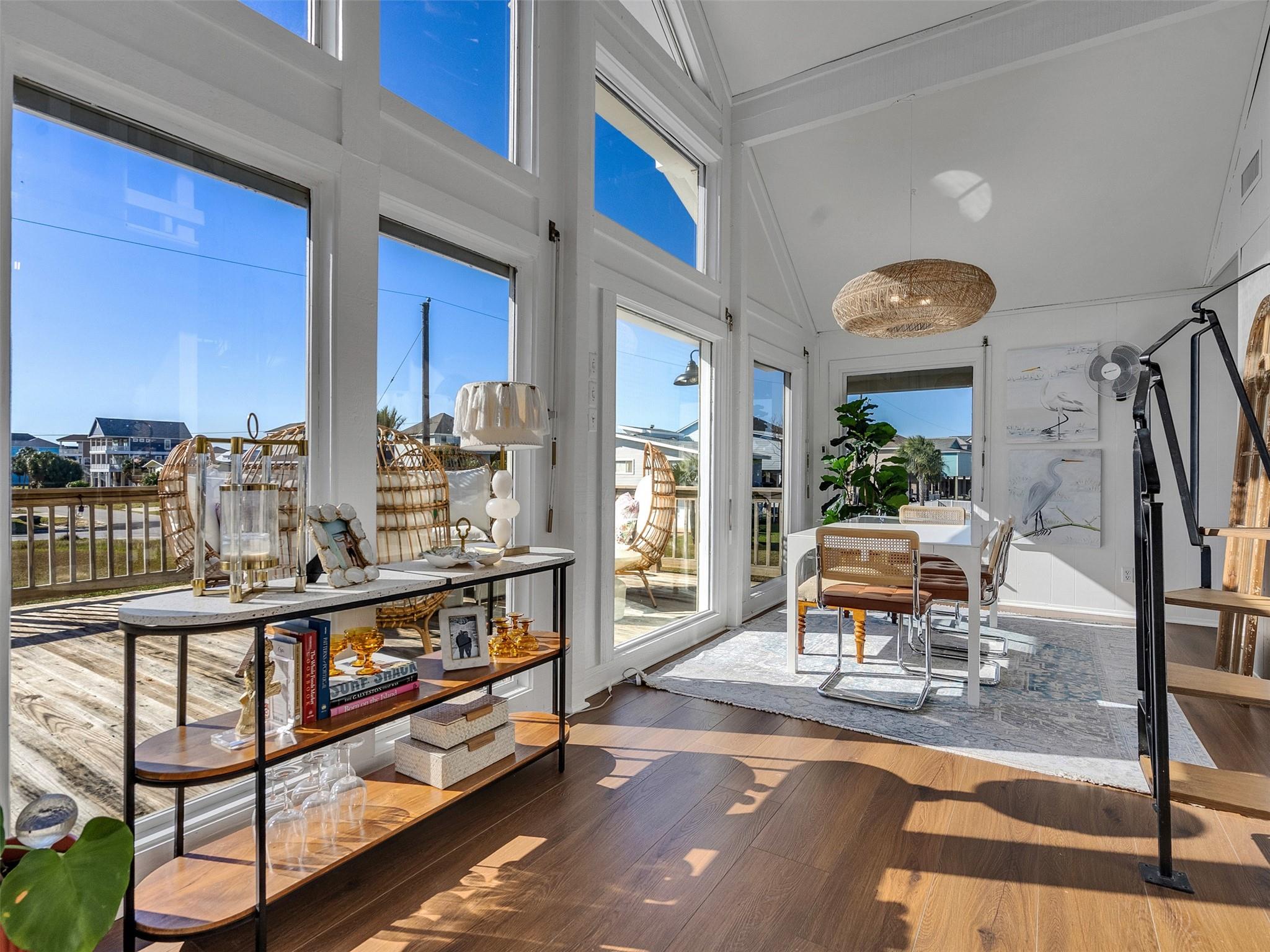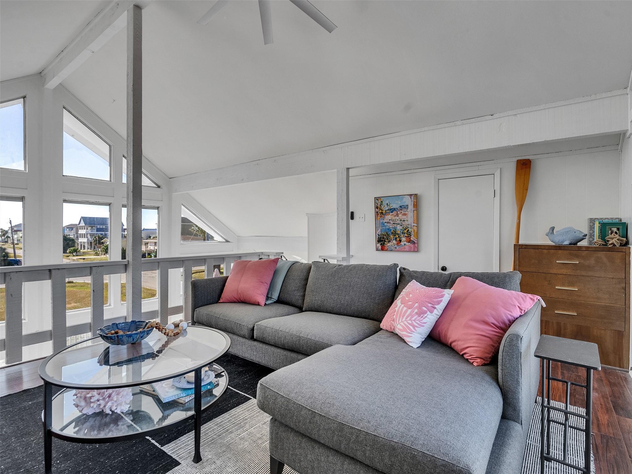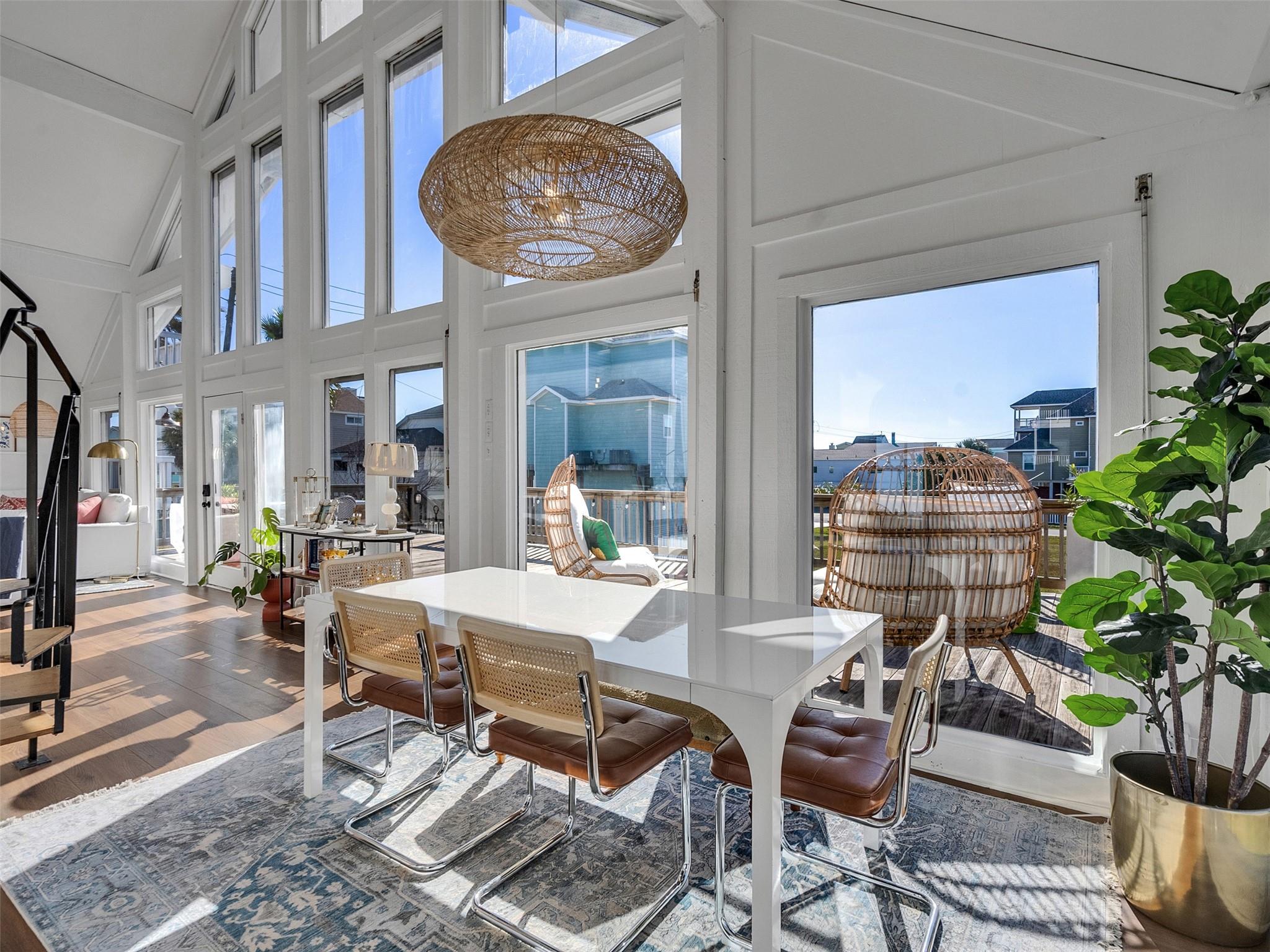 This beautifully designed beach home is located just a few blocks from the sand, offering the perfect balance of privacy and easy beach access. Inside, fresh wood floors and crisp white walls glow in the afternoon light, while expansive windows and double French doors invite natural light and coastal breezes. Ocean views can be enjoyed from the deck and upstairs loft, which serves as an additional living room or sleeping area. The updated kitchen features quartz countertops, white shaker cabinetry, and brushed brass fixtures, creating a clean, coastal aesthetic that feels modern and inviting. A thoughtfully designed Jack-and-Jill bathroom connects the bedrooms. Enjoy your morning coffee from the deck or rinse off in the convenient outdoor shower after a day at the beach. Offered fully furnished w/ some exclusions and move-in ready—a cover image that suggests calm, space, and modern coastal luxury.