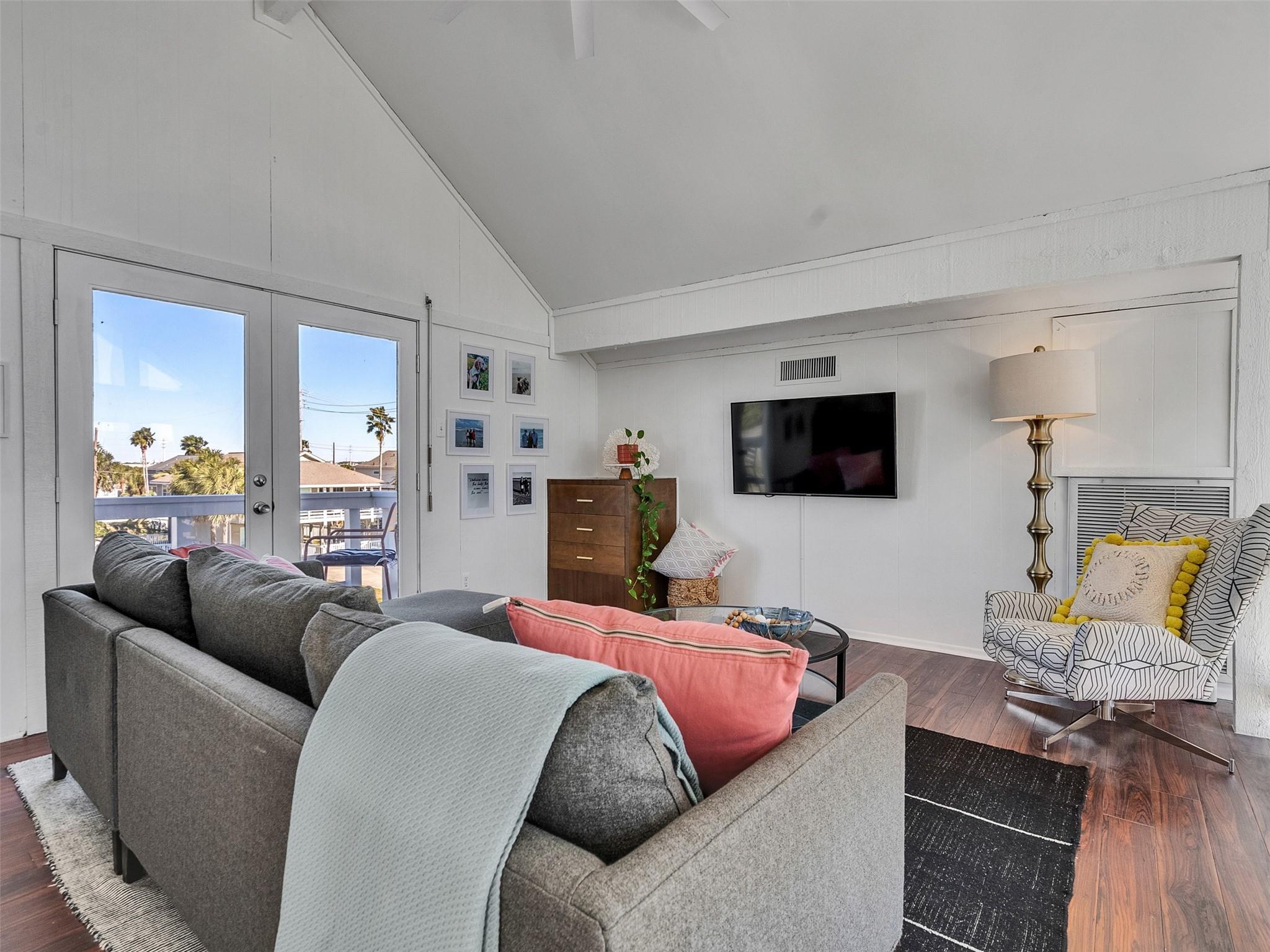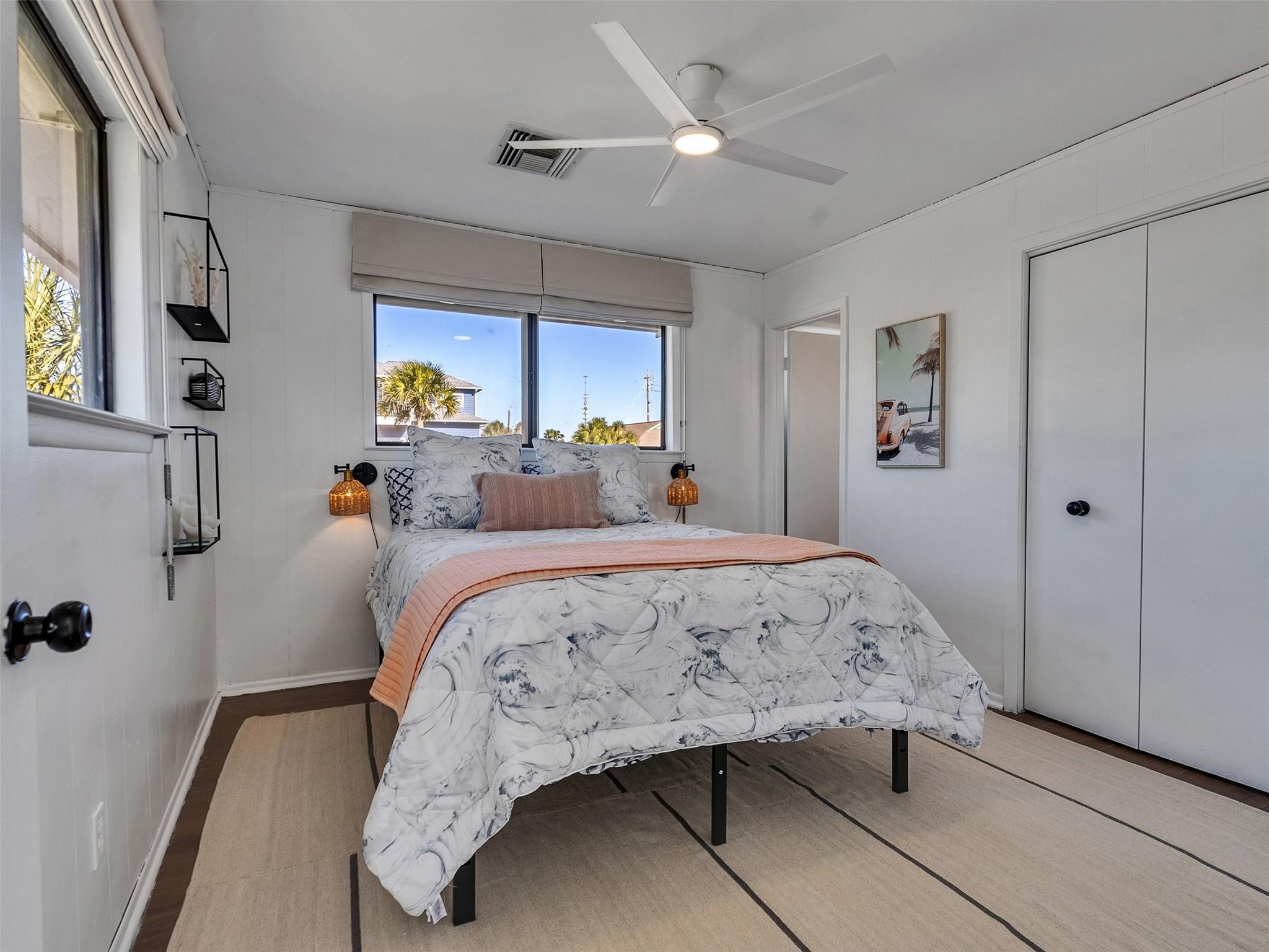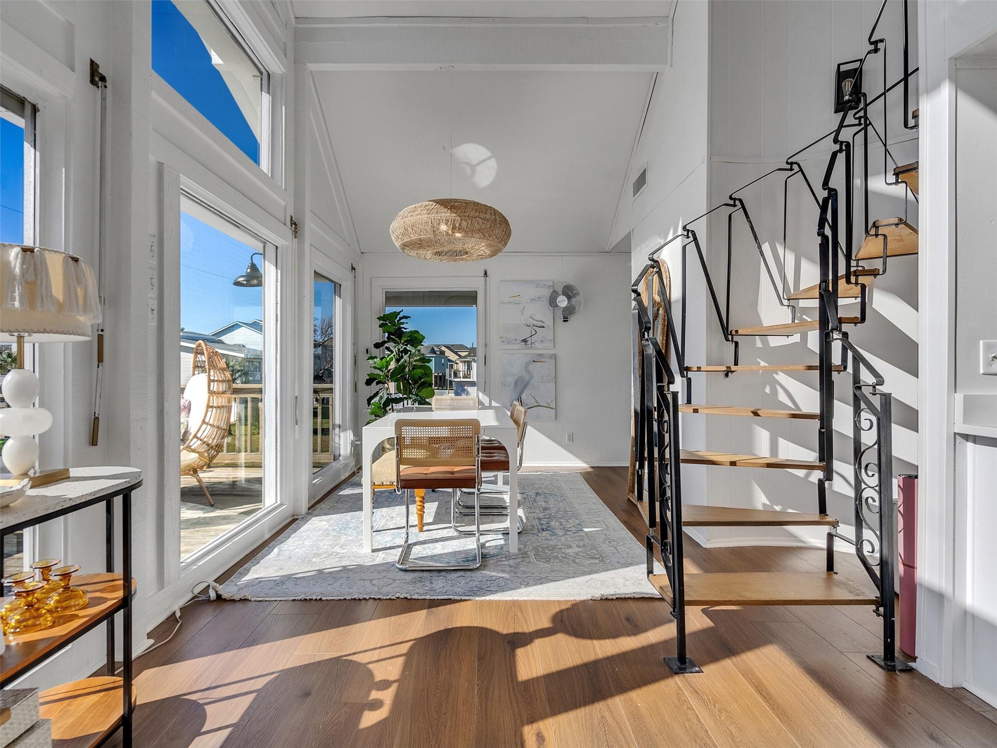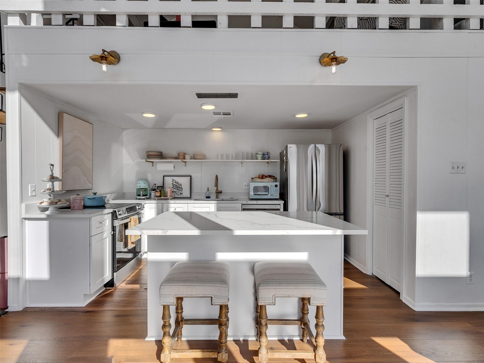This beautifully designed beach home is located just a few blocks from the sand, offering the perfect balance of privacy and easy beach access. Inside, fresh wood floors and crisp white walls glow in the afternoon light, while expansive windows and double French doors invite natural light and coastal breezes. Ocean views can be enjoyed from the deck and upstairs loft, which serves as an additional living room or sleeping area. The updated kitchen features quartz countertops, white shaker cabinetry, and brushed brass fixtures, creating a clean, coastal aesthetic that feels modern and inviting. A thoughtfully designed Jack-and-Jill bathroom connects the bedrooms. Enjoy your morning coffee from the deck or rinse off in the convenient outdoor shower after a day at the beach. Offered fully furnished w/ some exclusions and move-in ready—a cover image that suggests calm, space, and modern coastal luxury.