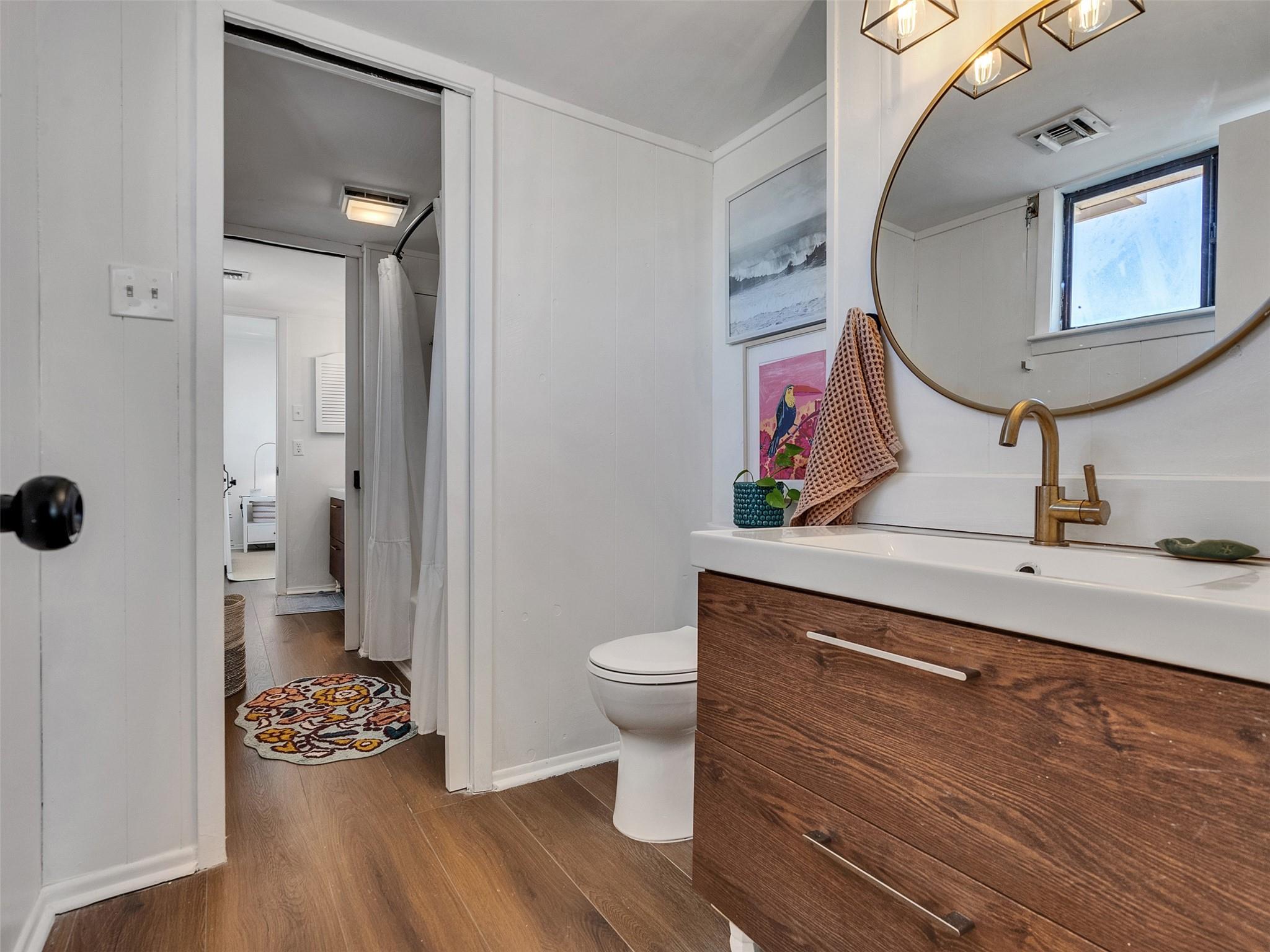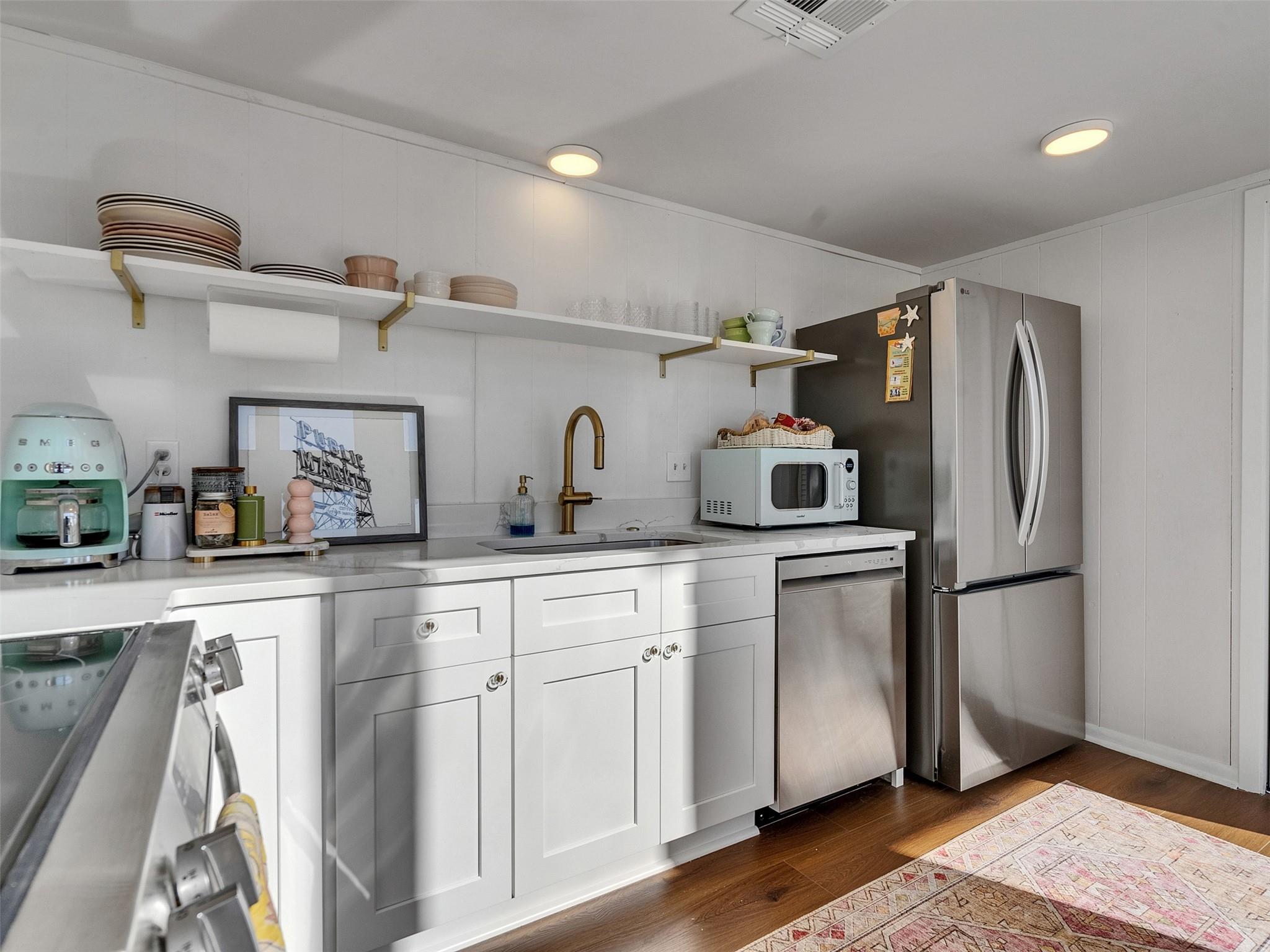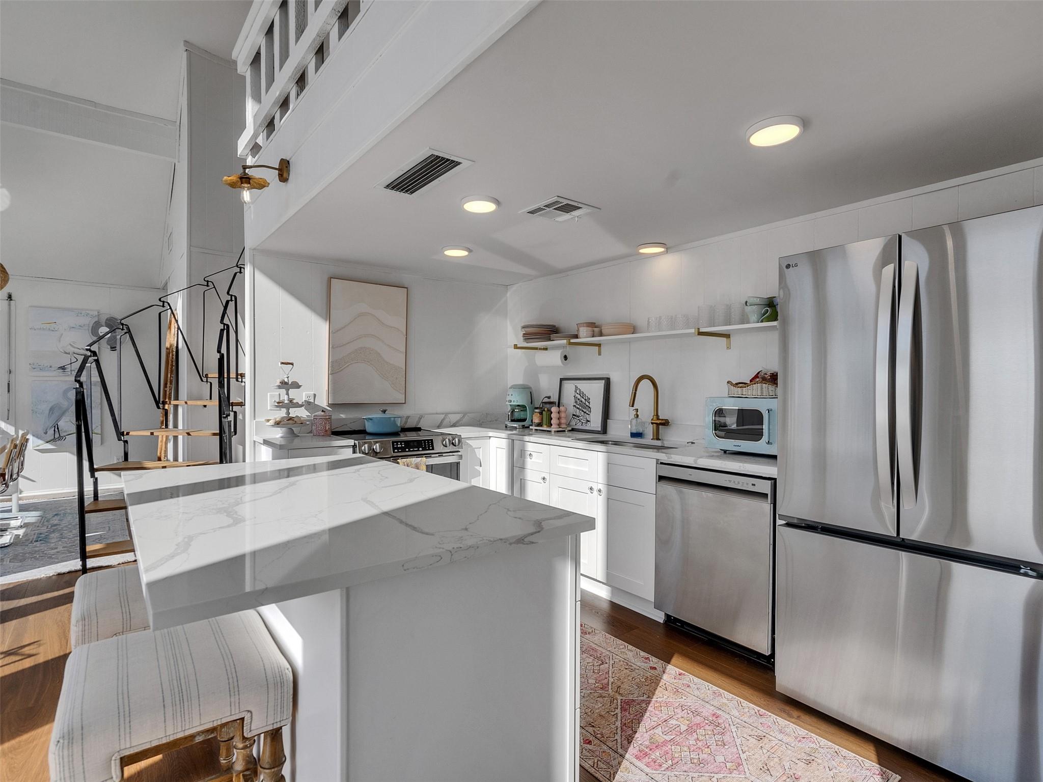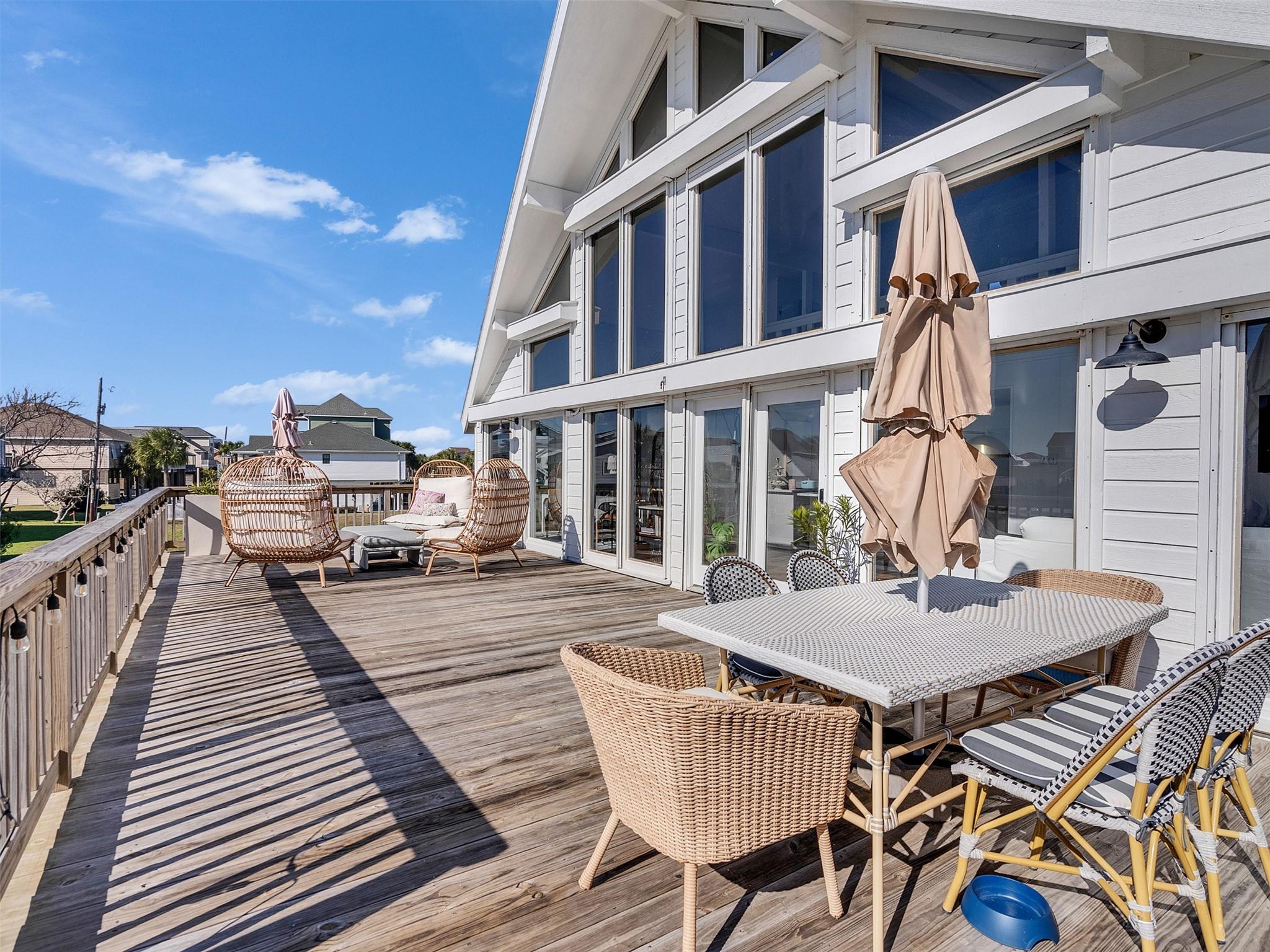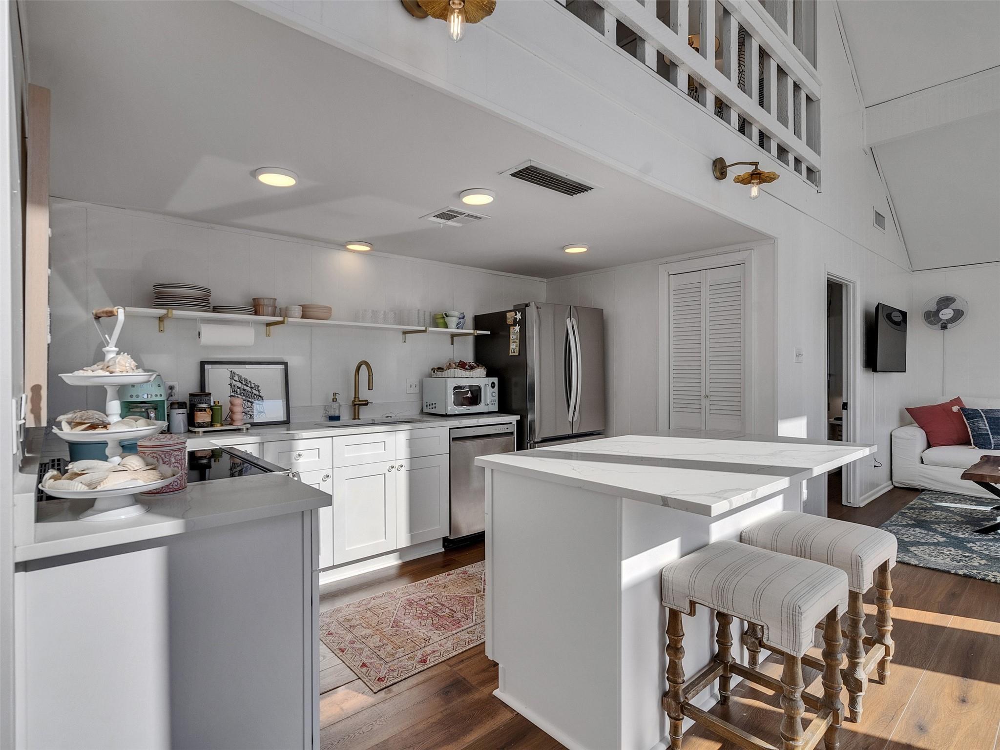 This beautifully designed beach home is located just a few blocks from the sand, offering the perfect balance of privacy and easy beach access. Inside, fresh wood floors and crisp white walls glow in the afternoon light, while expansive windows and double French doors invite natural light and coastal breezes. Ocean views can be enjoyed from the deck and upstairs loft, which serves as an additional living room or sleeping area. The updated kitchen features quartz countertops, white shaker cabinetry, and brushed brass fixtures, creating a clean, coastal aesthetic that feels modern and inviting. A thoughtfully designed Jack-and-Jill bathroom connects the bedrooms. Enjoy your morning coffee from the deck or rinse off in the convenient outdoor shower after a day at the beach. Offered fully furnished w/ some exclusions and move-in ready—a cover image that suggests calm, space, and modern coastal luxury.