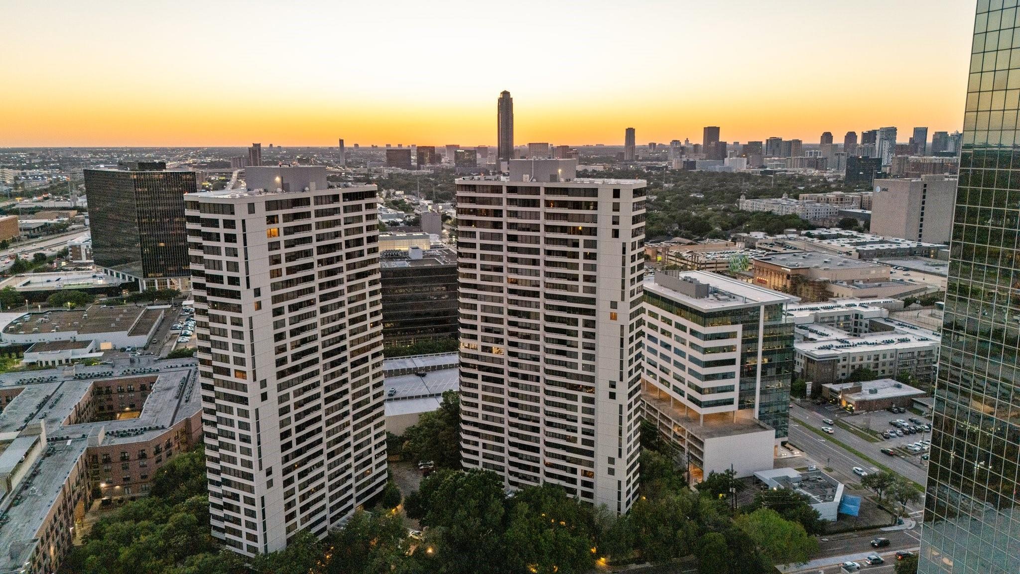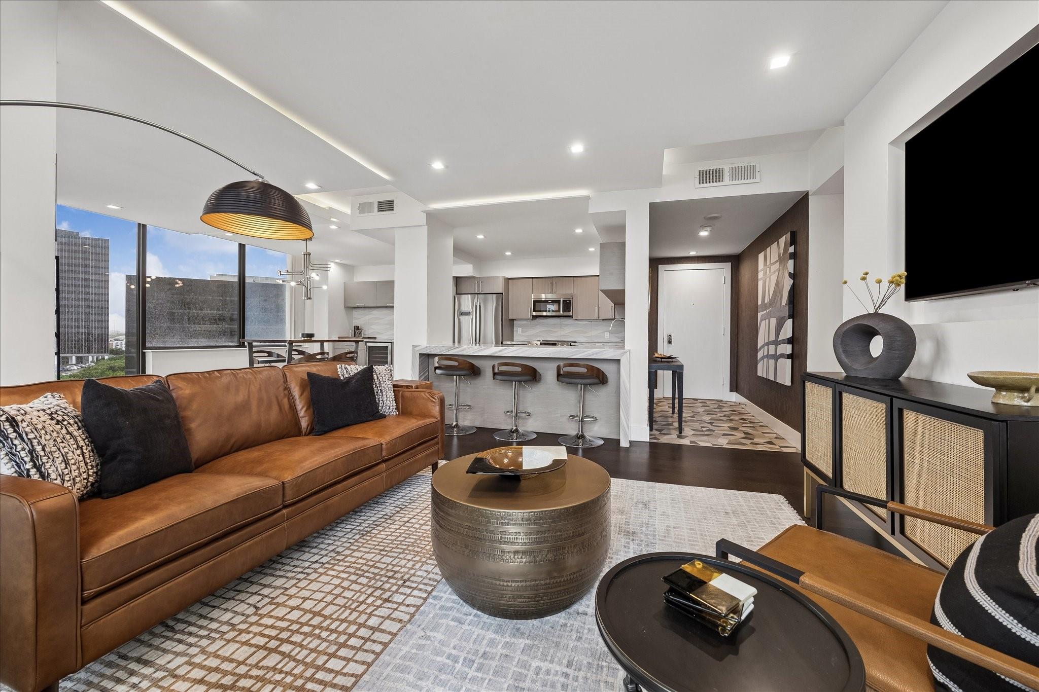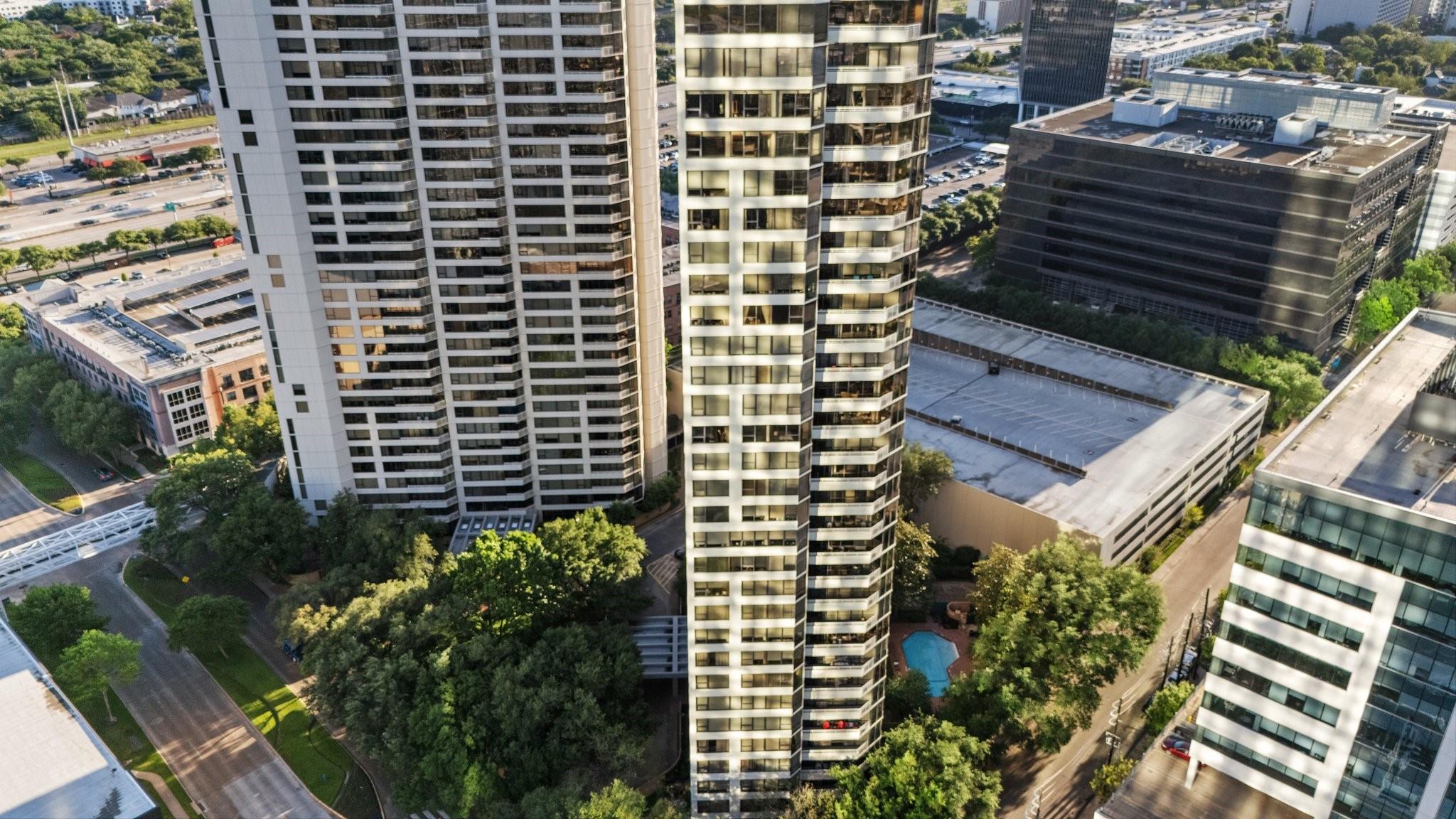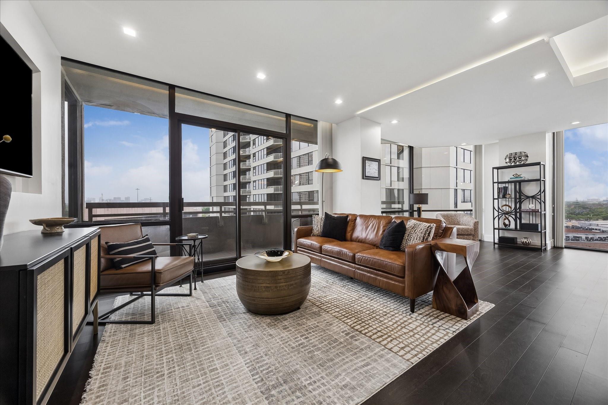 Fully renovated and spacious corner residence with designer finishes offering open concept living. Floor to ceiling windows, recessed and cove lighting, hardwood floors. Gourmet kitchen with marble counters, custom cabinetry and stainless appliances. Primary suite with walk-in closet and luxurious bathroom with double sinks, vanity and oversized seamless glass shower. Spacious second bedroom and hall bathroom with designer tile, custom cabinetry and marble counters. Walk-in laundry room with generous storage. Private balcony with panoramic Southeast views of Greenway Plaza and the Texas Medical Center skyline. Full service high rise living with doorman, valet, porter, 24 hour security and heated pool. Convenient location within close proximity to shopping, dining, the Texas Medical Center, Downtown and the Galleria.