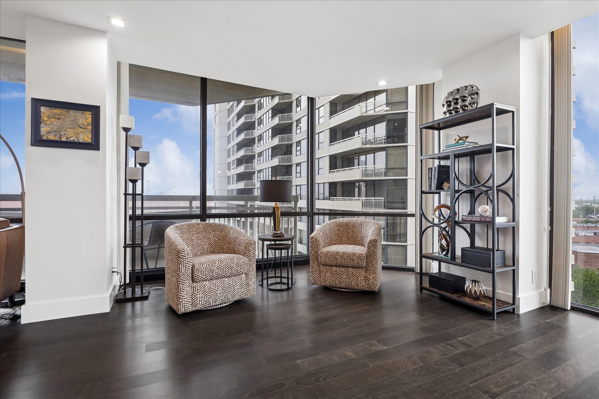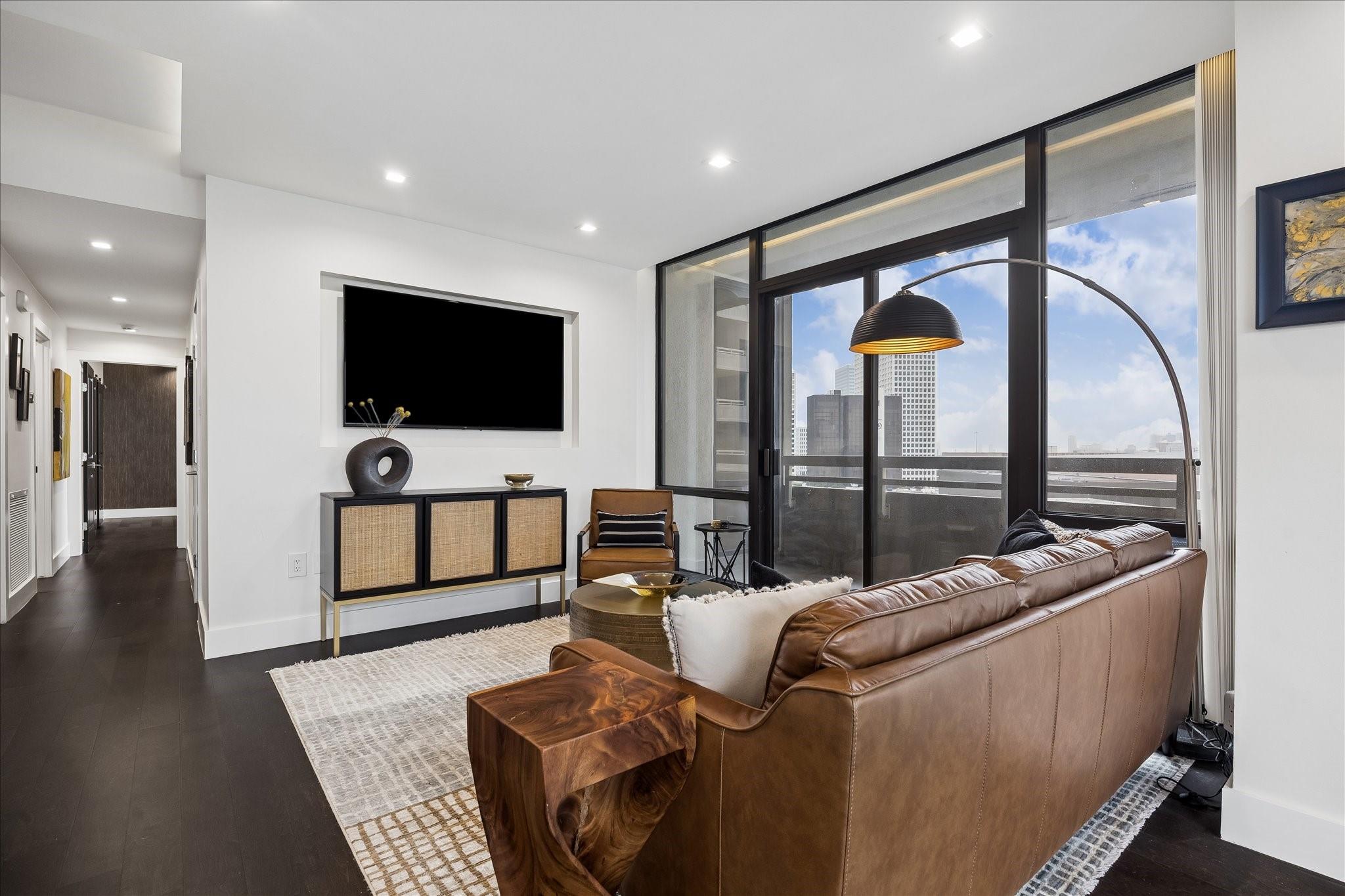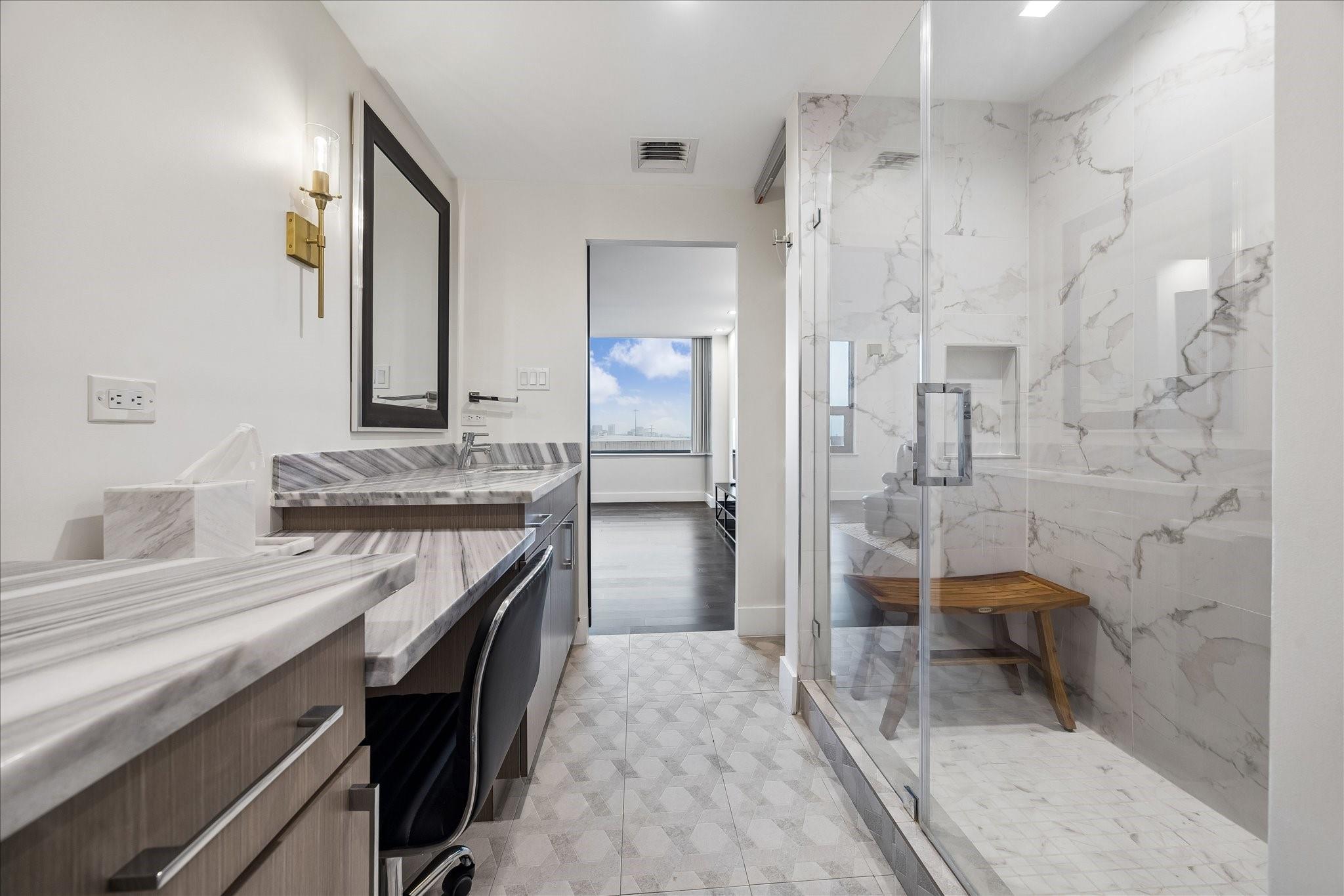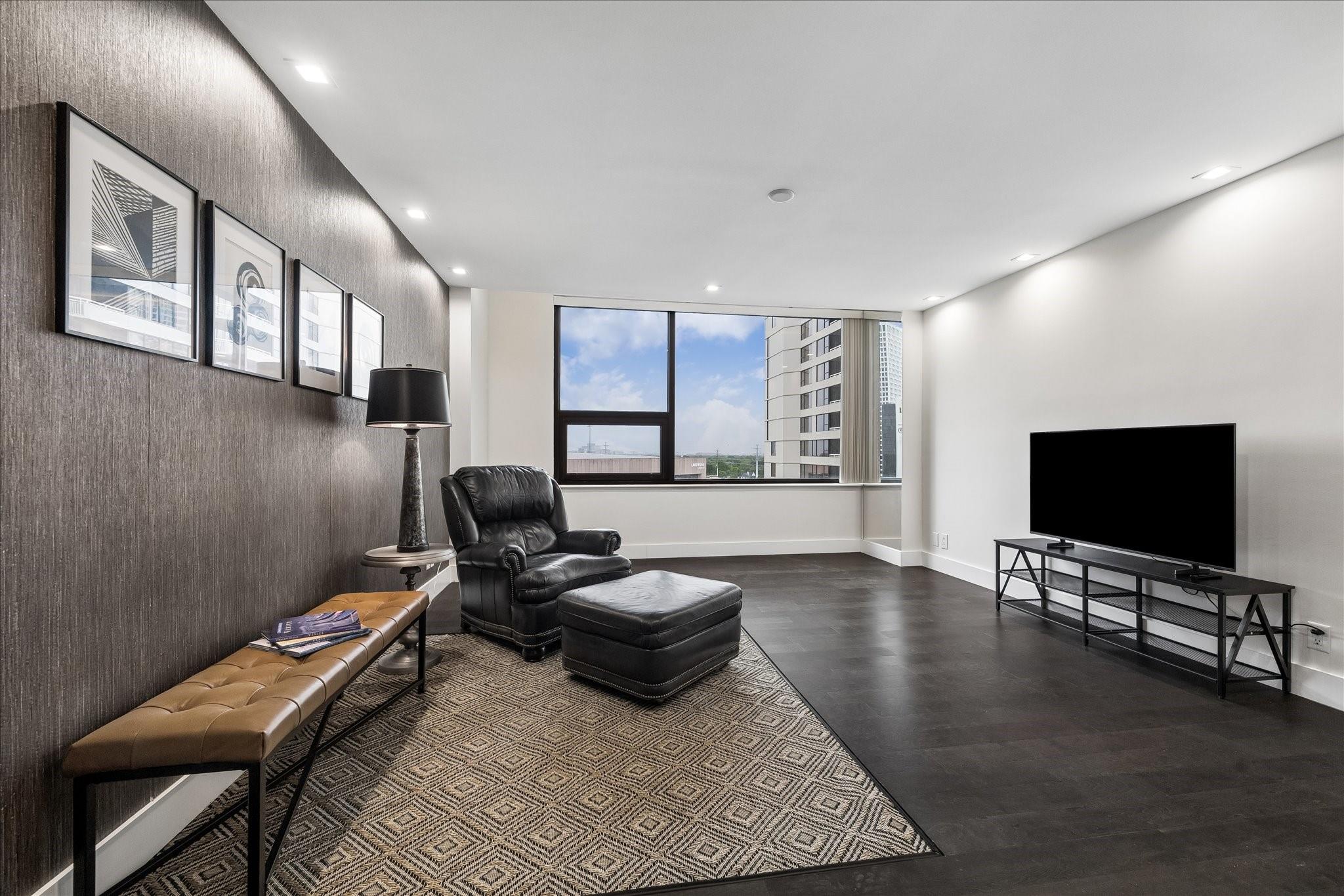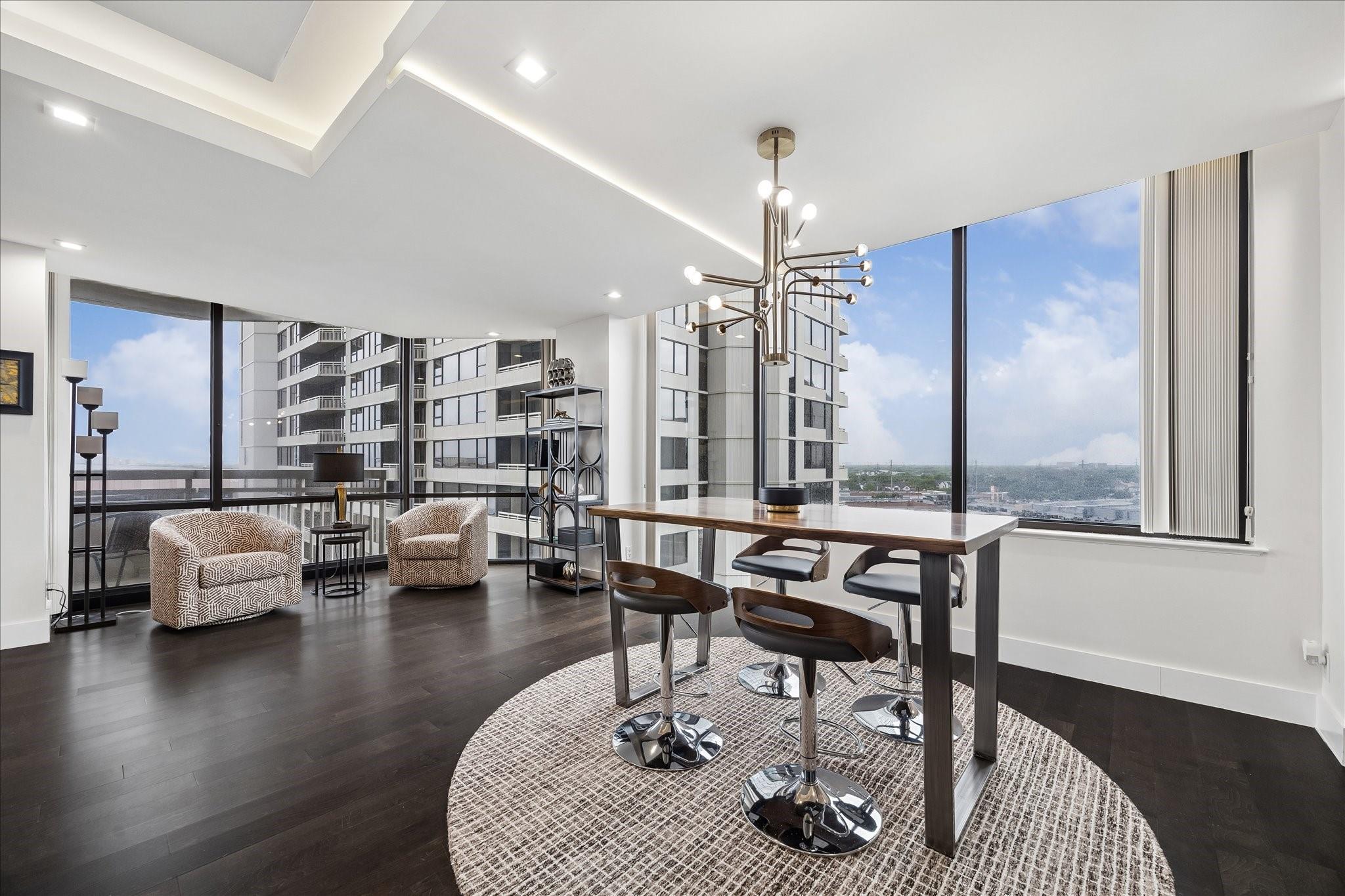 Fully renovated and spacious corner residence with designer finishes offering open concept living. Floor to ceiling windows, recessed and cove lighting, hardwood floors. Gourmet kitchen with marble counters, custom cabinetry and stainless appliances. Primary suite with walk-in closet and luxurious bathroom with double sinks, vanity and oversized seamless glass shower. Spacious second bedroom and hall bathroom with designer tile, custom cabinetry and marble counters. Walk-in laundry room with generous storage. Private balcony with panoramic Southeast views of Greenway Plaza and the Texas Medical Center skyline. Full service high rise living with doorman, valet, porter, 24 hour security and heated pool. Convenient location within close proximity to shopping, dining, the Texas Medical Center, Downtown and the Galleria.