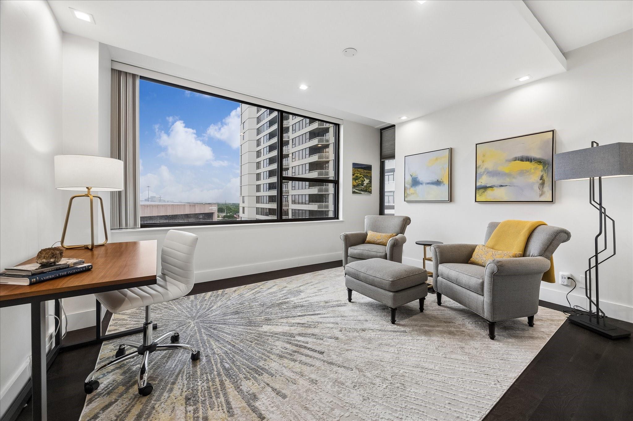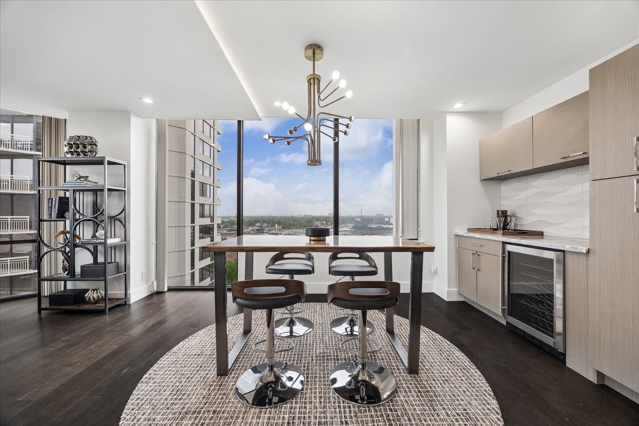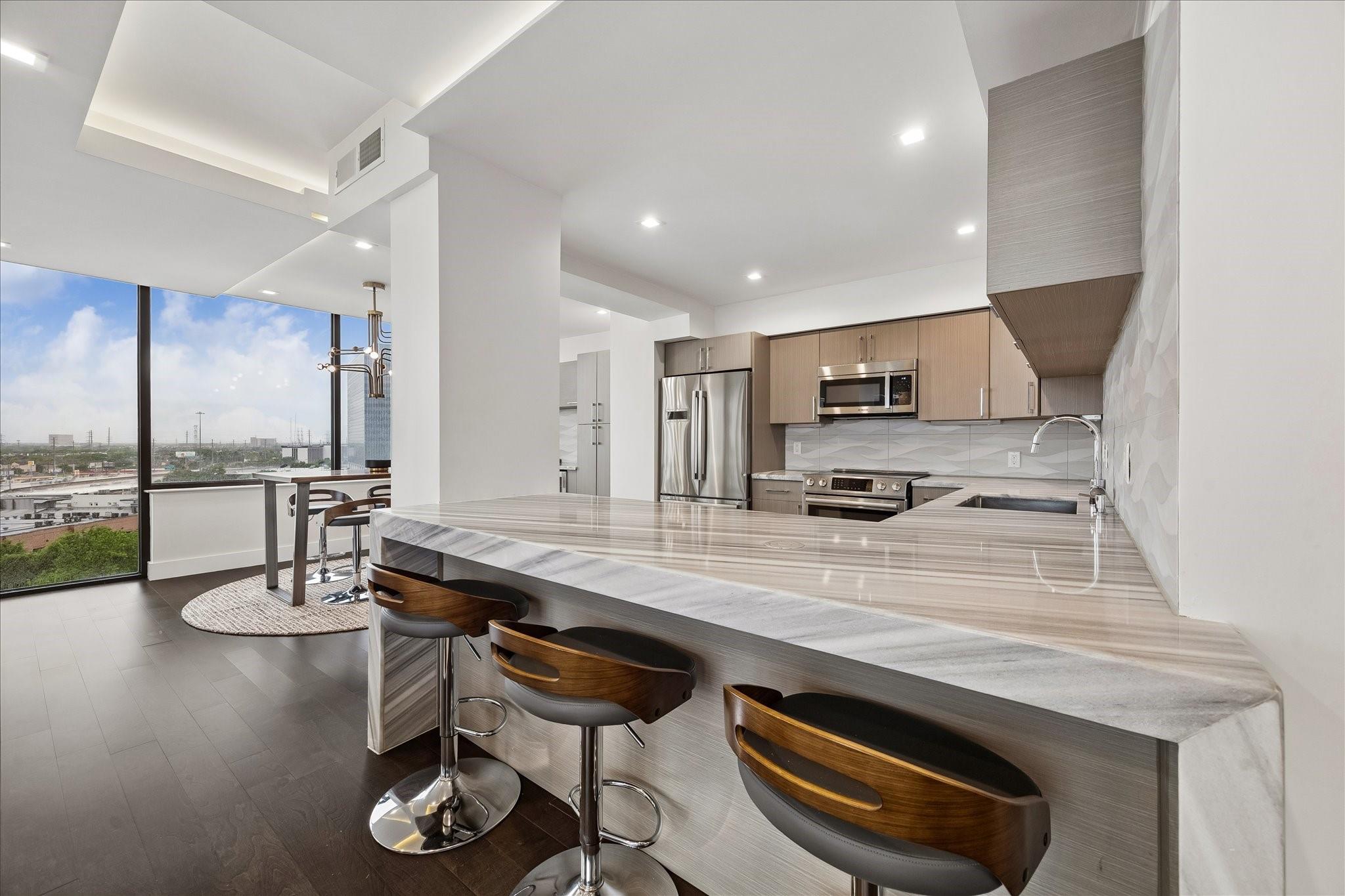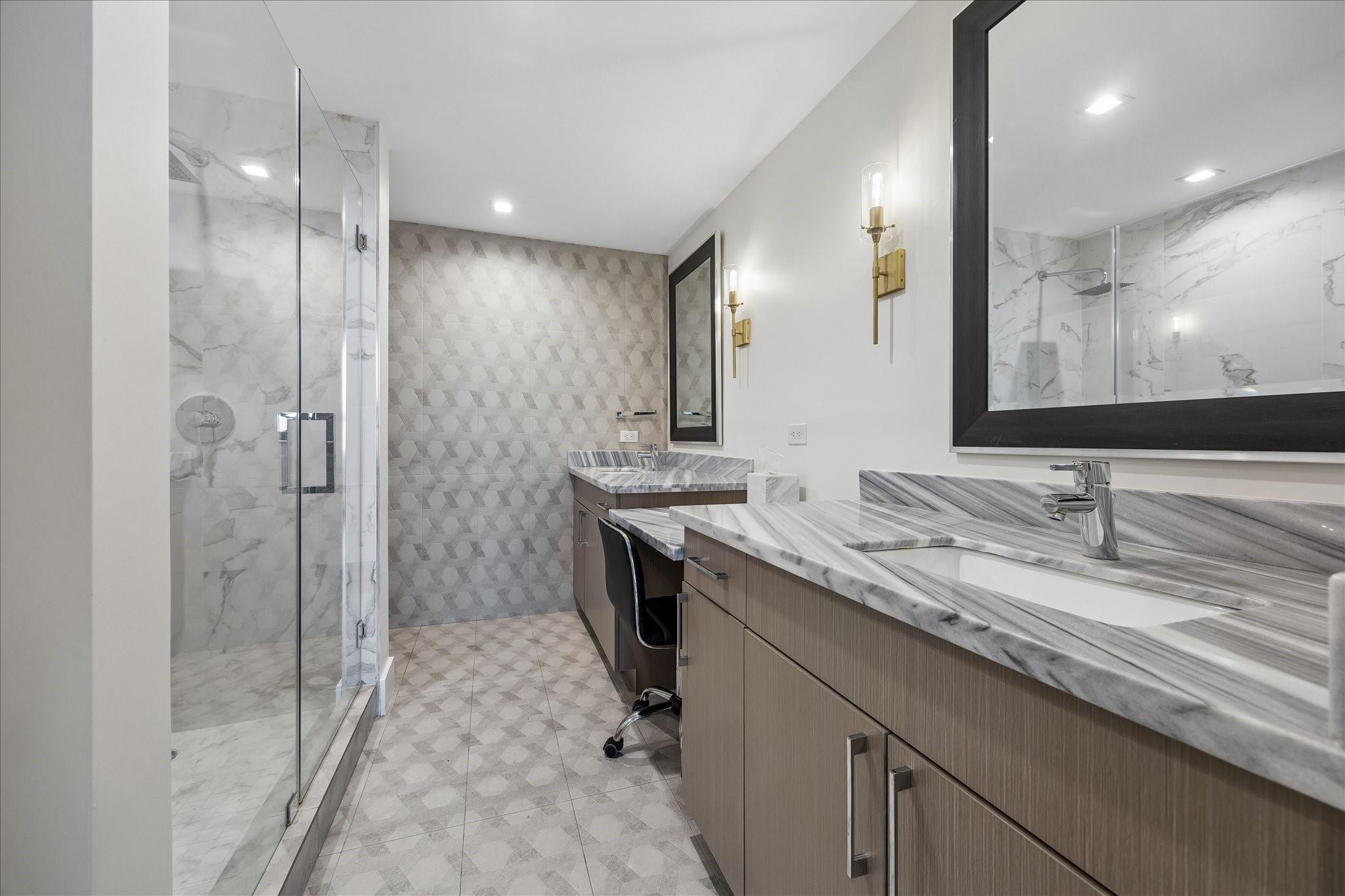 Fully renovated and spacious corner residence with designer finishes offering open concept living. Floor to ceiling windows, recessed and cove lighting, hardwood floors. Gourmet kitchen with marble counters, custom cabinetry and stainless appliances. Primary suite with walk-in closet and luxurious bathroom with double sinks, vanity and oversized seamless glass shower. Spacious second bedroom and hall bathroom with designer tile, custom cabinetry and marble counters. Walk-in laundry room with generous storage. Private balcony with panoramic Southeast views of Greenway Plaza and the Texas Medical Center skyline. Full service high rise living with doorman, valet, porter, 24 hour security and heated pool. Convenient location within close proximity to shopping, dining, the Texas Medical Center, Downtown and the Galleria.