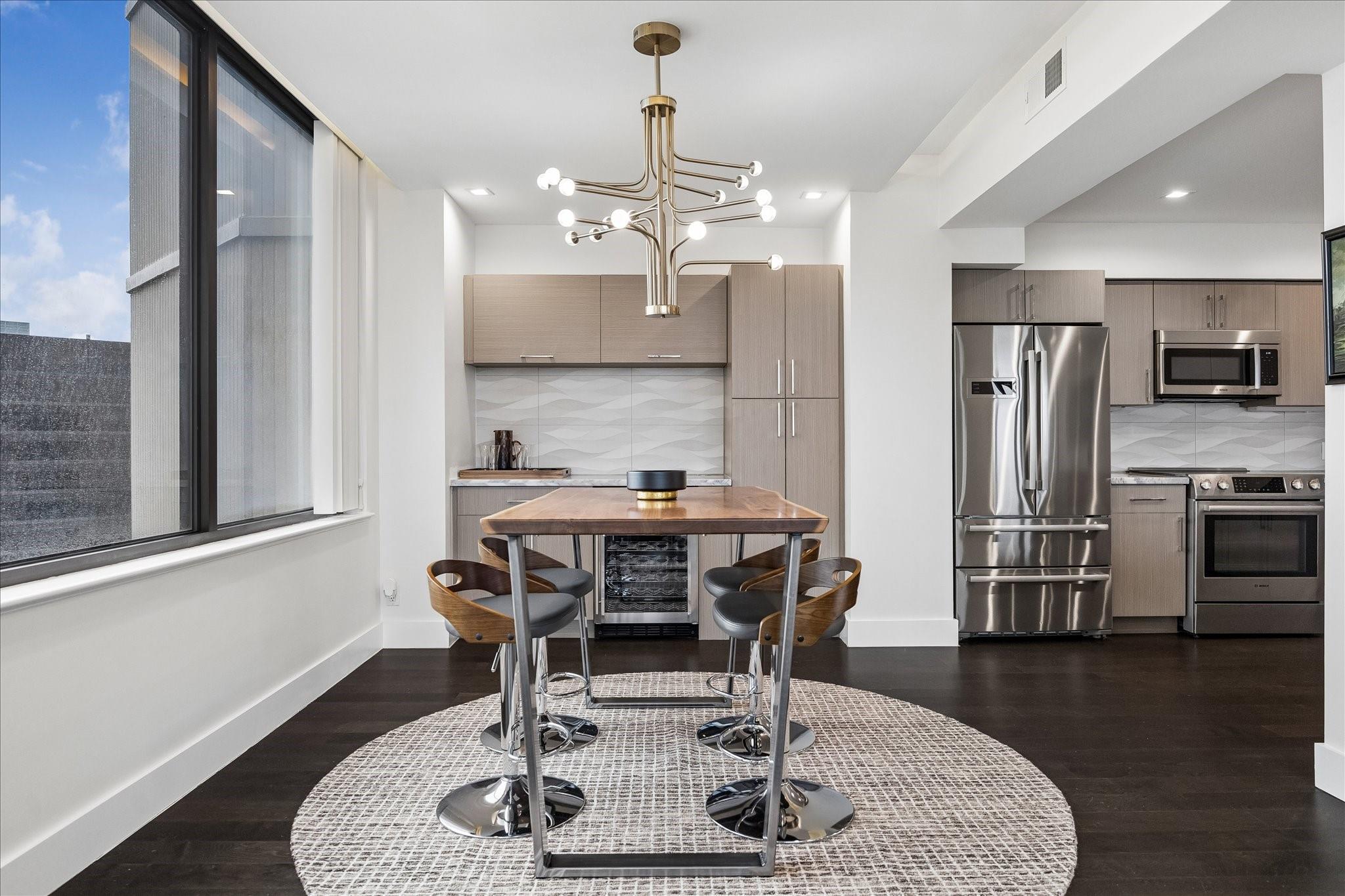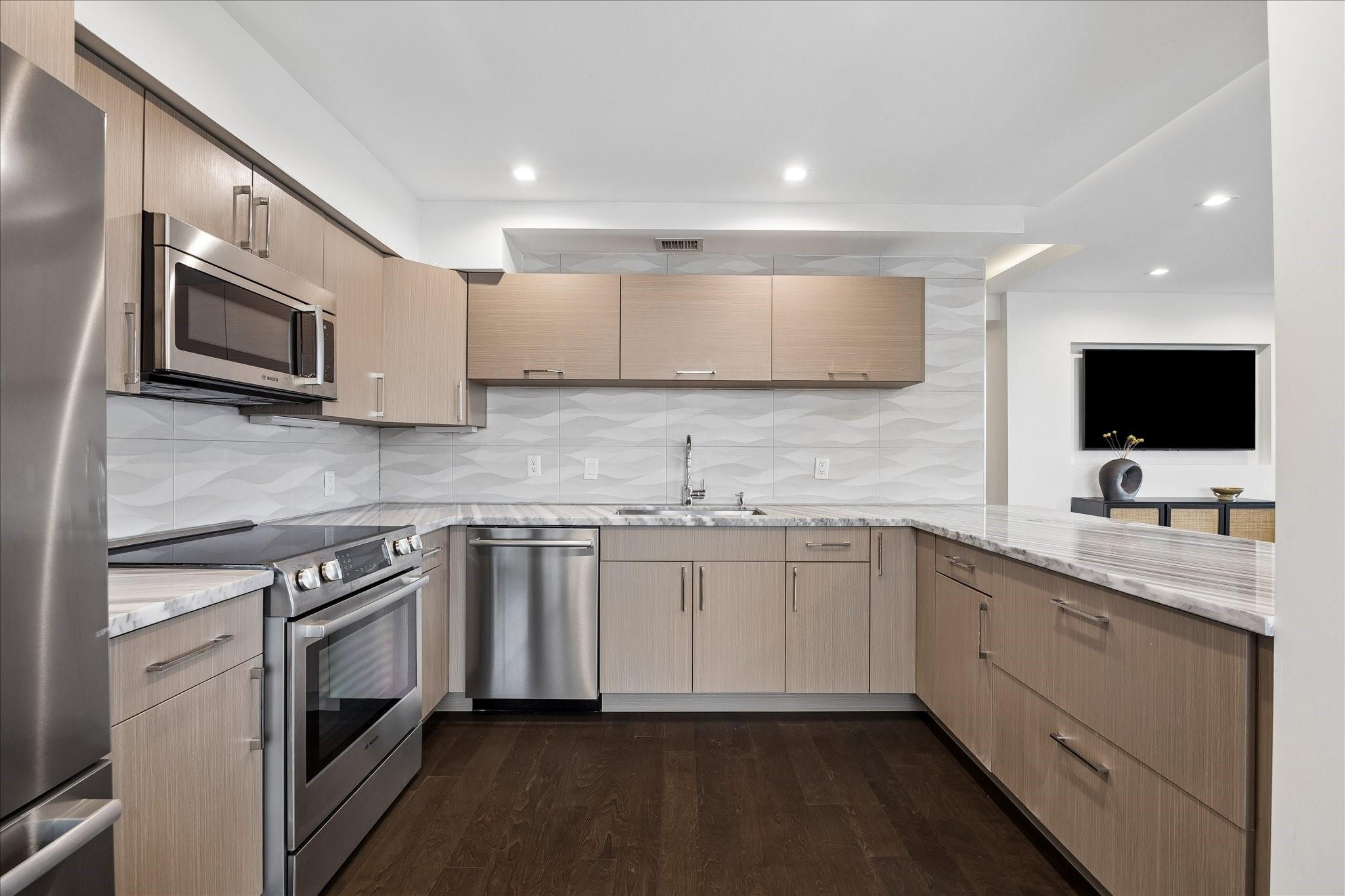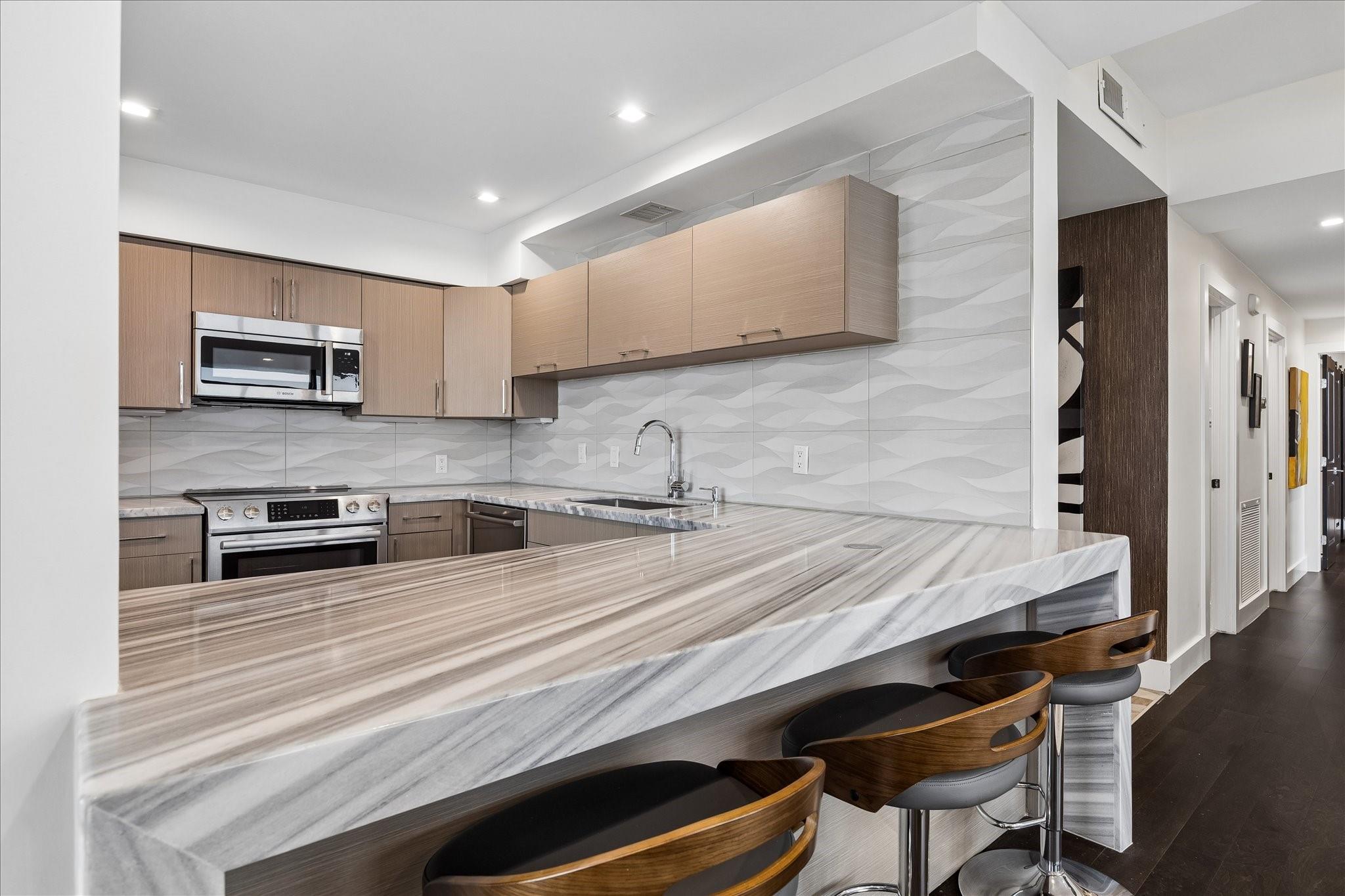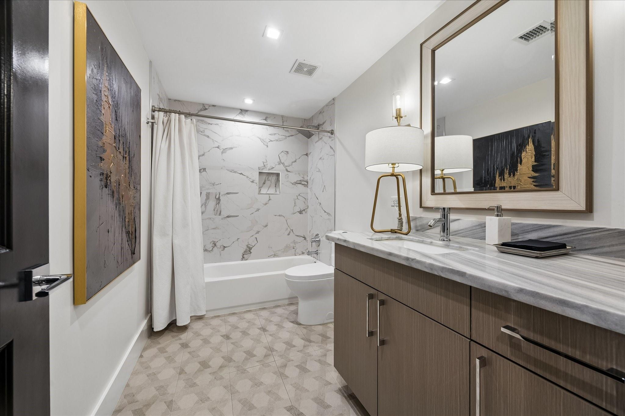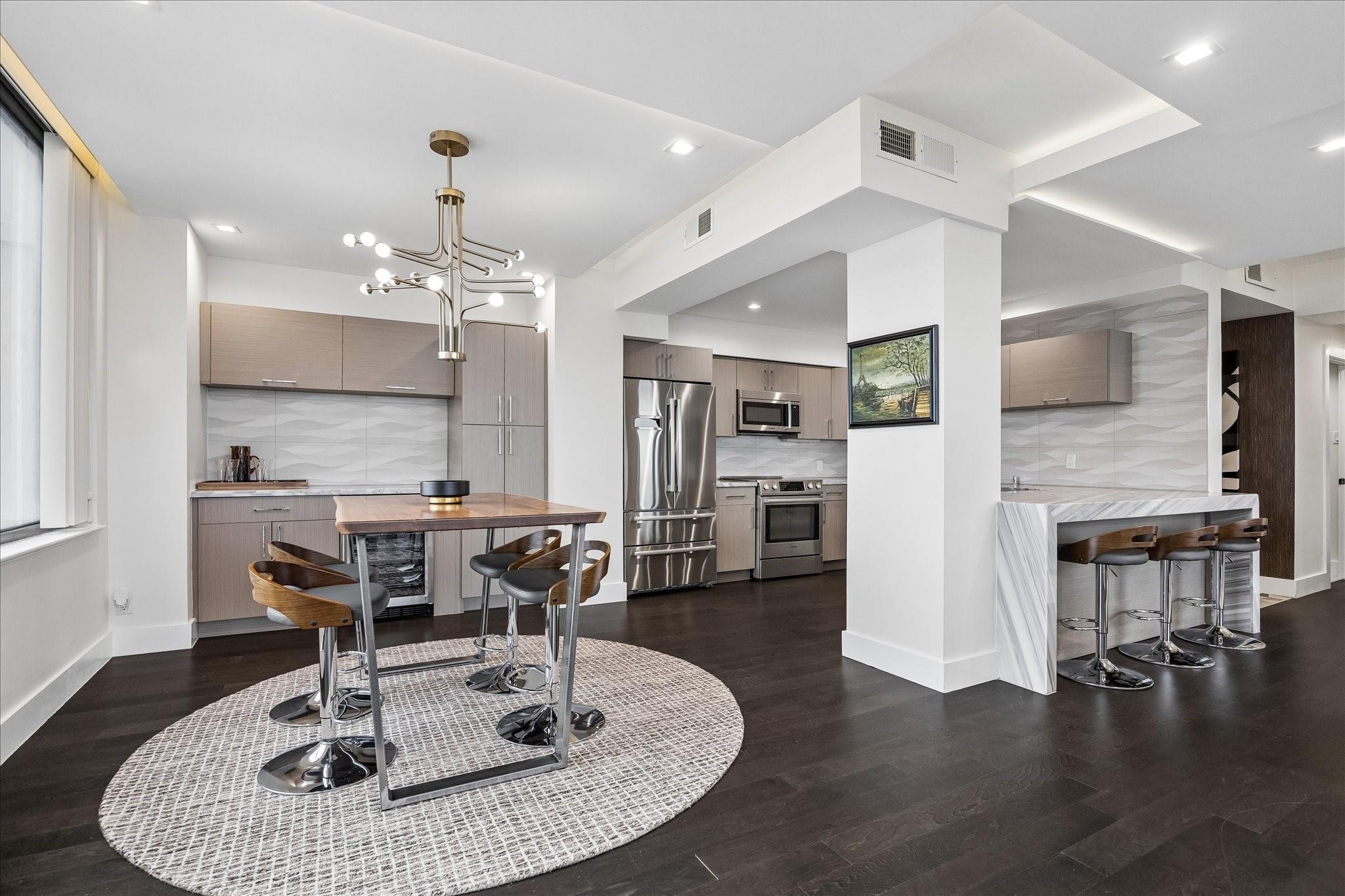 Fully renovated and spacious corner residence with designer finishes offering open concept living. Floor to ceiling windows, recessed and cove lighting, hardwood floors. Gourmet kitchen with marble counters, custom cabinetry and stainless appliances. Primary suite with walk-in closet and luxurious bathroom with double sinks, vanity and oversized seamless glass shower. Spacious second bedroom and hall bathroom with designer tile, custom cabinetry and marble counters. Walk-in laundry room with generous storage. Private balcony with panoramic Southeast views of Greenway Plaza and the Texas Medical Center skyline. Full service high rise living with doorman, valet, porter, 24 hour security and heated pool. Convenient location within close proximity to shopping, dining, the Texas Medical Center, Downtown and the Galleria.
